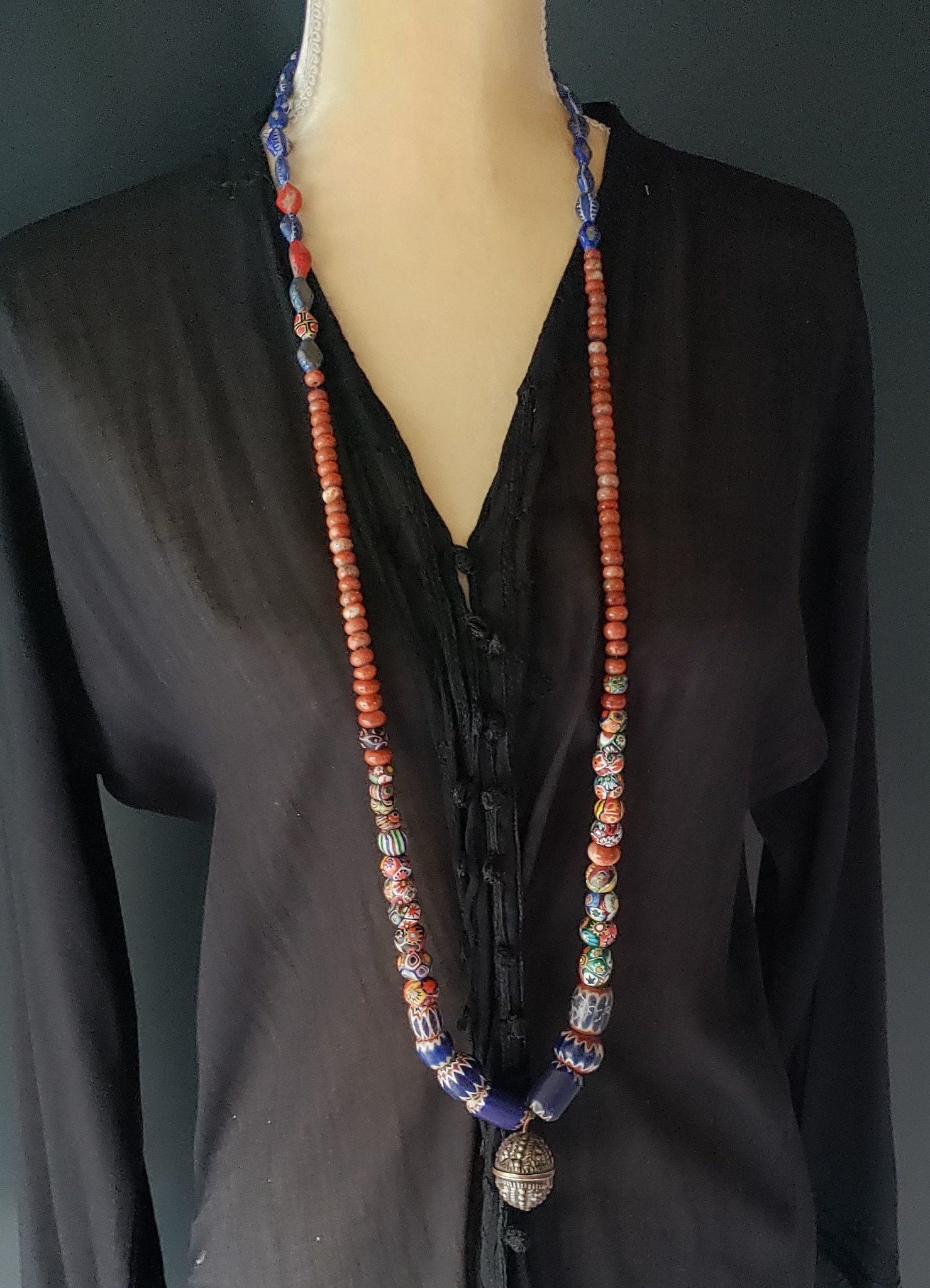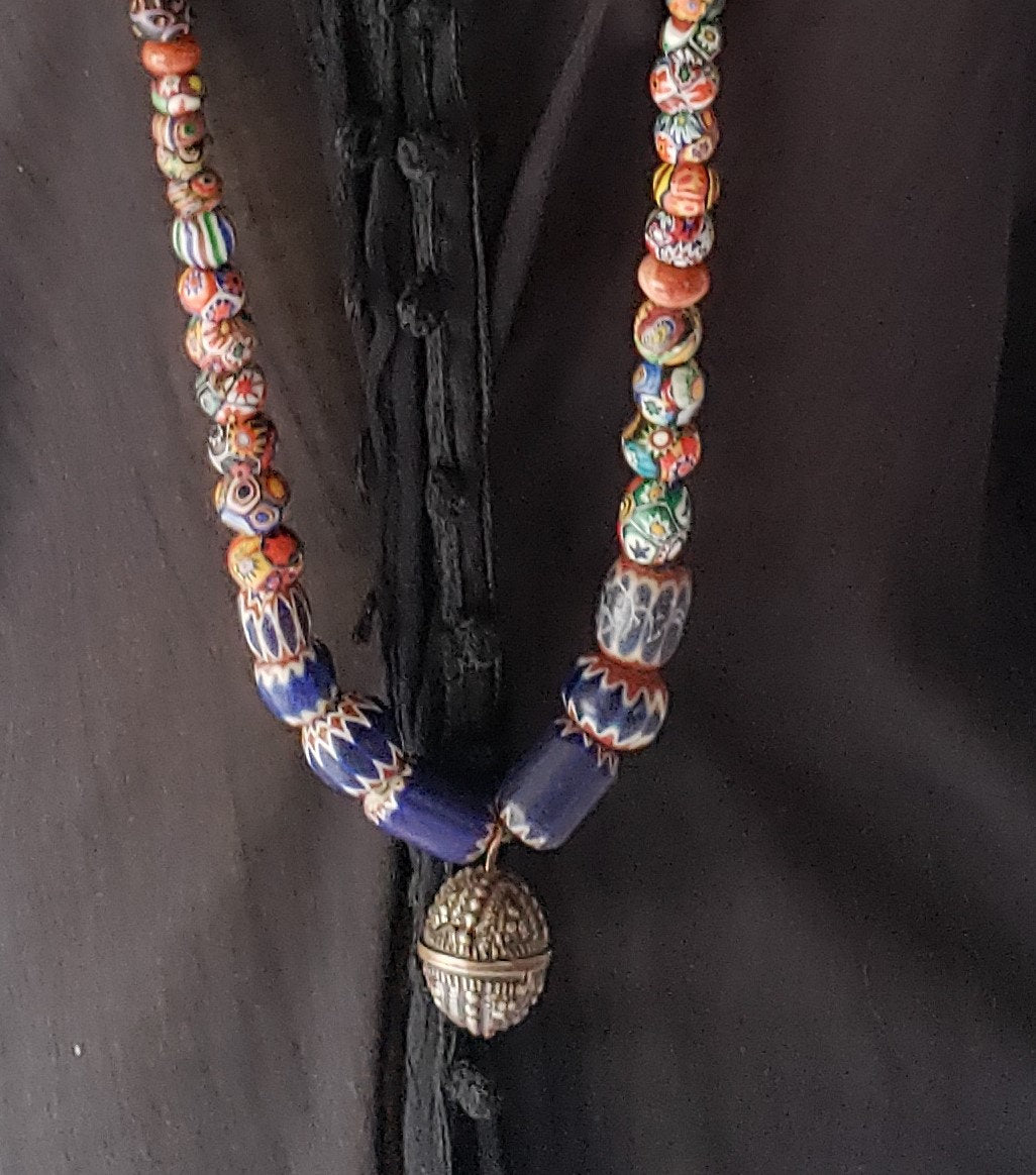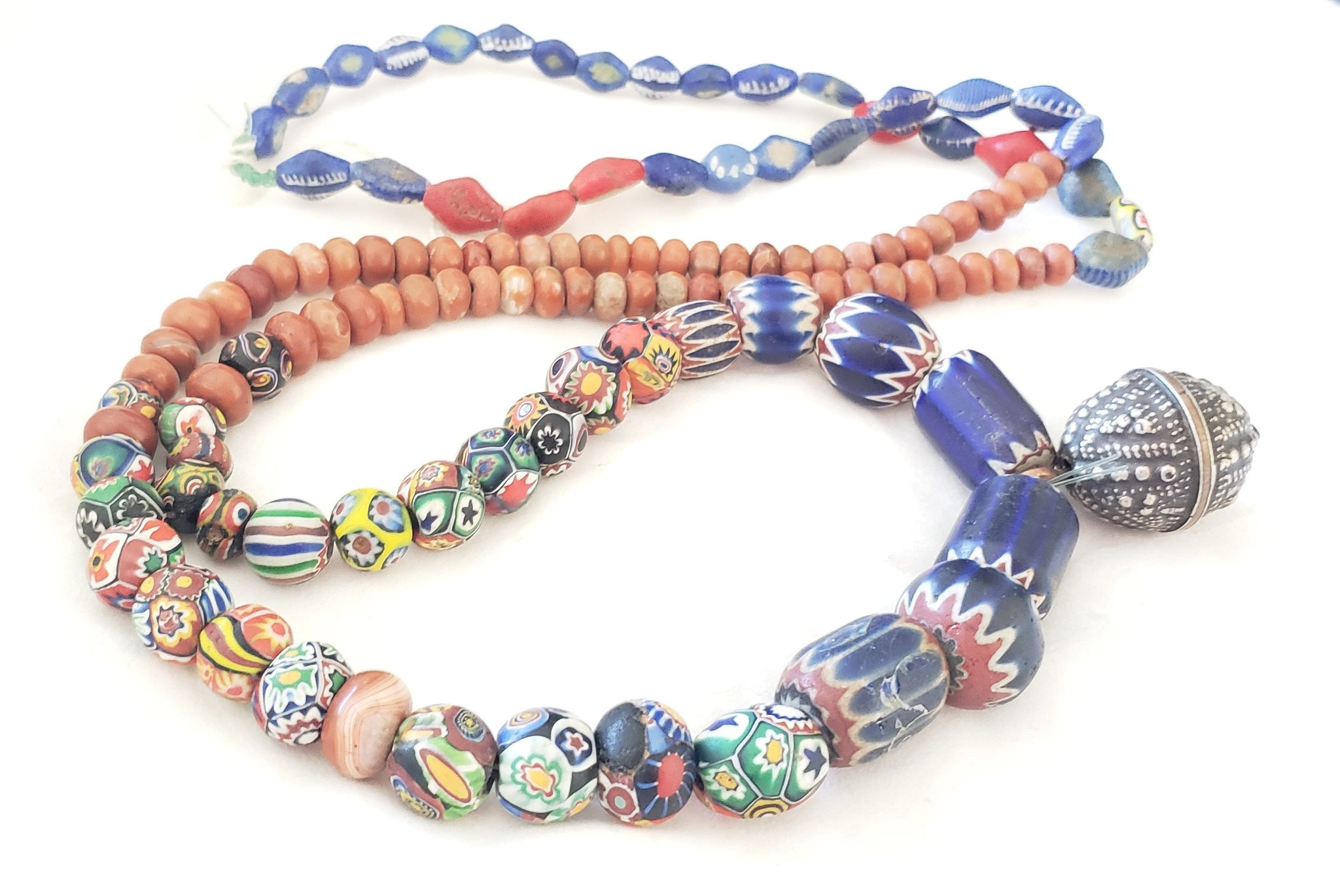 Beautiful Strand Large Silver Bead form 20th century, Rare and Antique 7 Large Chevron Venetian Trade Beads Seven Layer Venetian and Multiple Cane Millefiori Oval beads and Venetian Millefiori Round Beads W/ Multiple Cane Inserts and other Trade beads chevron and Kiffa Beads Agate Beads These beads are beautiful. The coloration is unique. These beads are rare, Hard to come by It was used in the African trade in the late 1800's These are called Millefiori chevron Kiffa Agate Beads wear in Africa. Made in Venice, traded in Africa. 1800's. beads are in very good condition.These Old glass beads from Africa. These beads are quite irregular. Please expect some imperfections in size and shape.A beautiful strand to add interest and texture to any jewellery.Each bead is unique, color, pattern of dots, and size. Approximate Product Specifications: Name: Large Silver Bead Millefiori beads chevron beads Kiffa beads Agate beads Strand:43'' Material: Glass Origin: Venice Italy. African Traded
