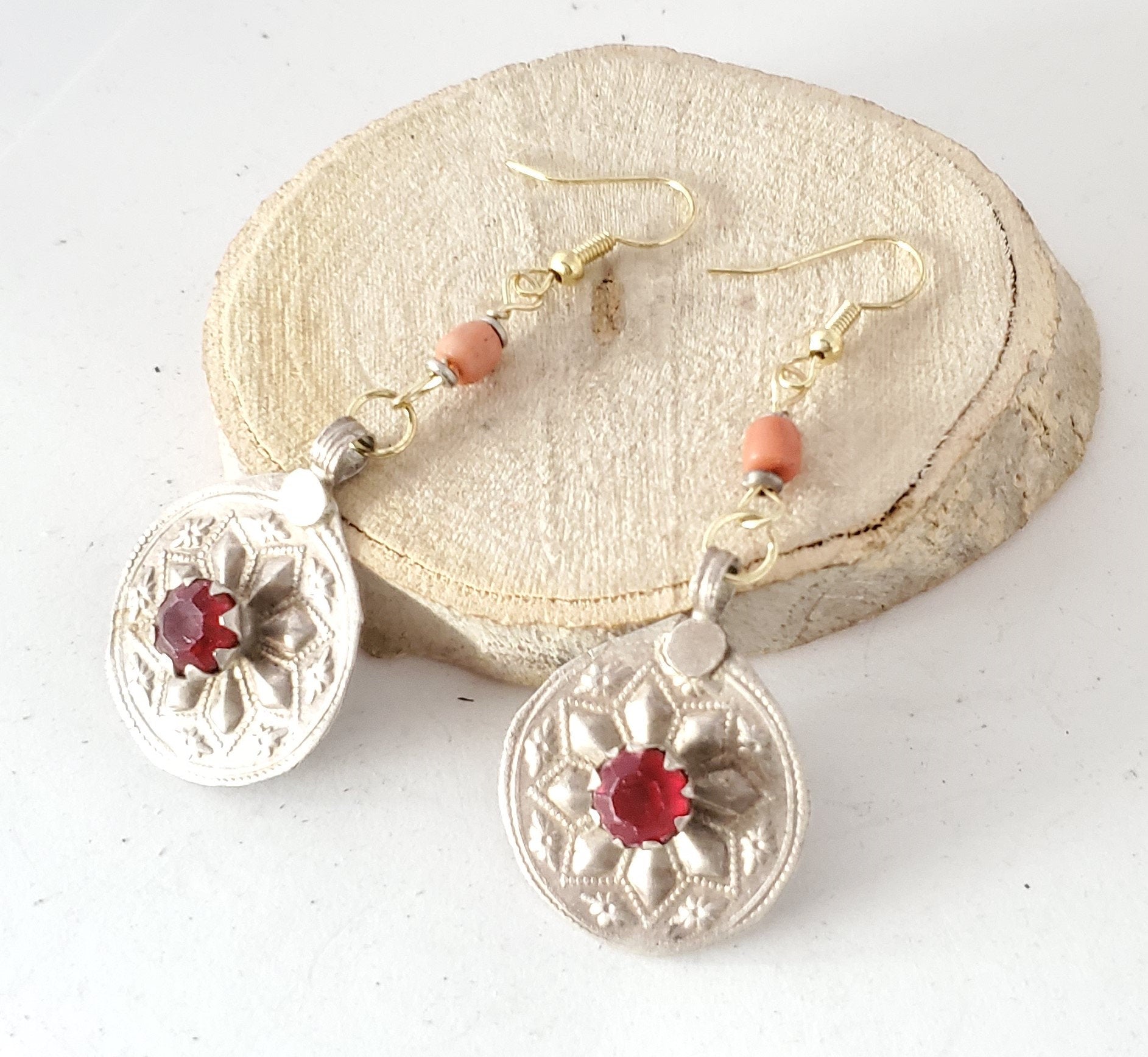 Antique Moroccan Old Silver pendants coral Earrings ,Ethnic Tribal, from Southern Morocco with real Mediterranean coral the Earring are traditional Berber silver rely good quality work YOU WILL HAVE A BEAUTIFUL AND UNIQUE PIECE OF HISTORY. IT DATES FROM THE 1960'S .It measures approximately 3'' long in 1'' wide .Weight 15 gr Earring features detailed enamel wire-work (see the photos) It is in good condition with age and use