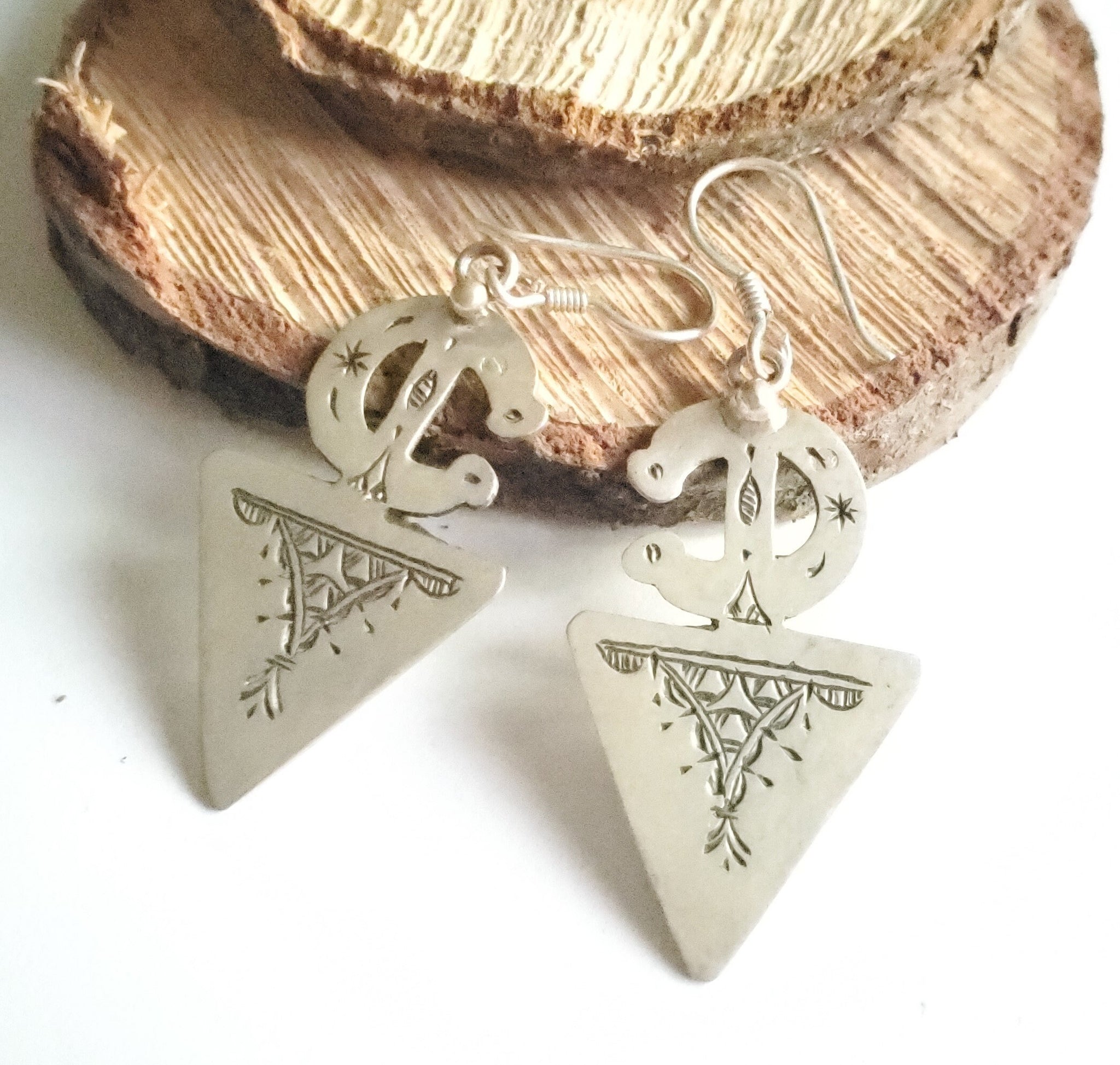 Moroccan Berber Fibula Dangle & Drop Sterling Silver Earrings This is a great authentic Berber jewelry from Morocco. Each Fibula earring measures just over 2" .5 long and just under 1'' .5 wide./ 13.gr The workmanship is wonderful .These earrings were hand made sterling silver 925 new high-silver content if you have any questions - Feel free to contact me. . Thank you for visiting my shop All my jewelry has been collected over 20 years ago .I will be listing more pieces shortly as I am constantly always working on posting more. piece to add to the collection .I ship all over the world and price includes a tracking service.