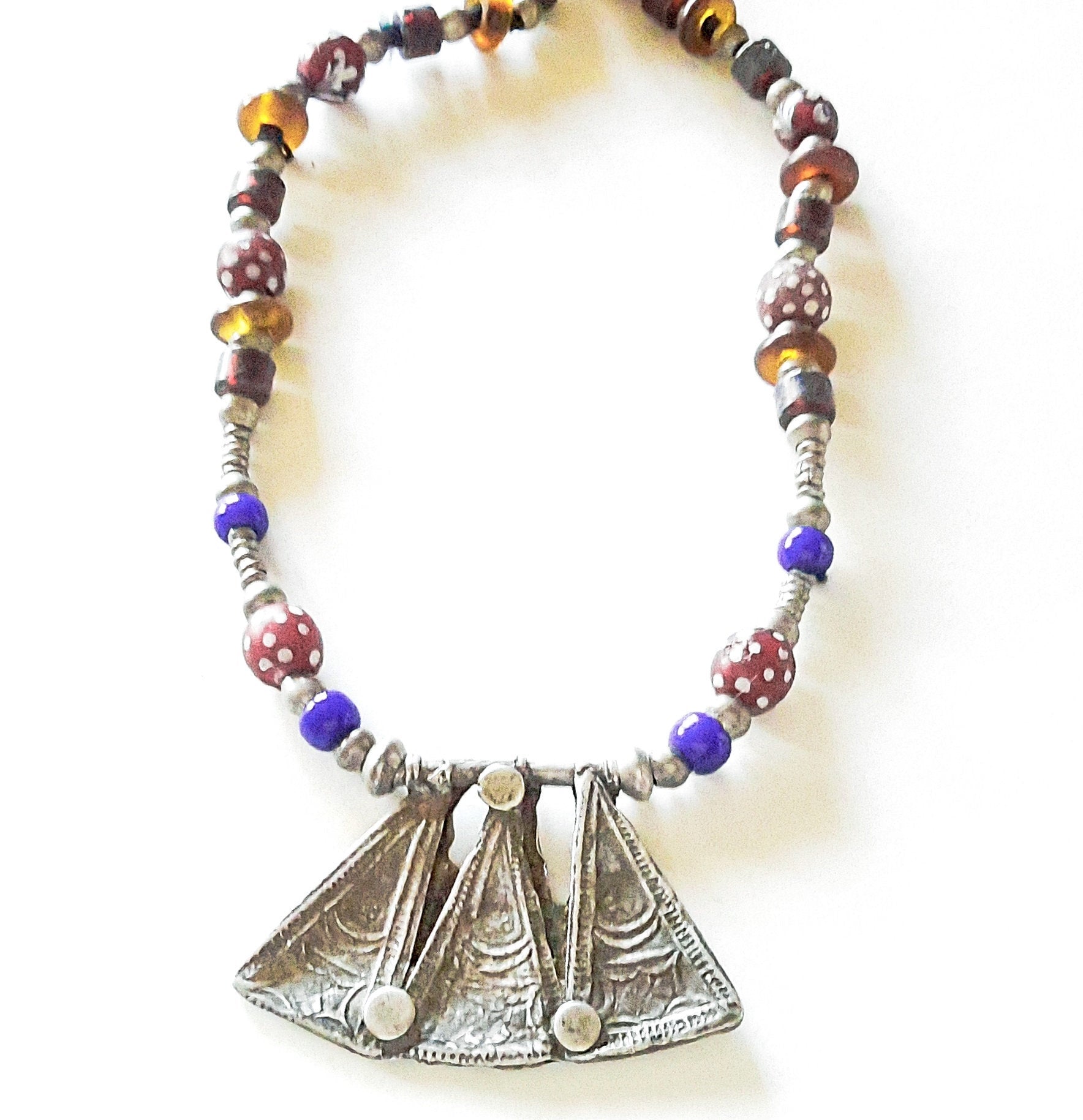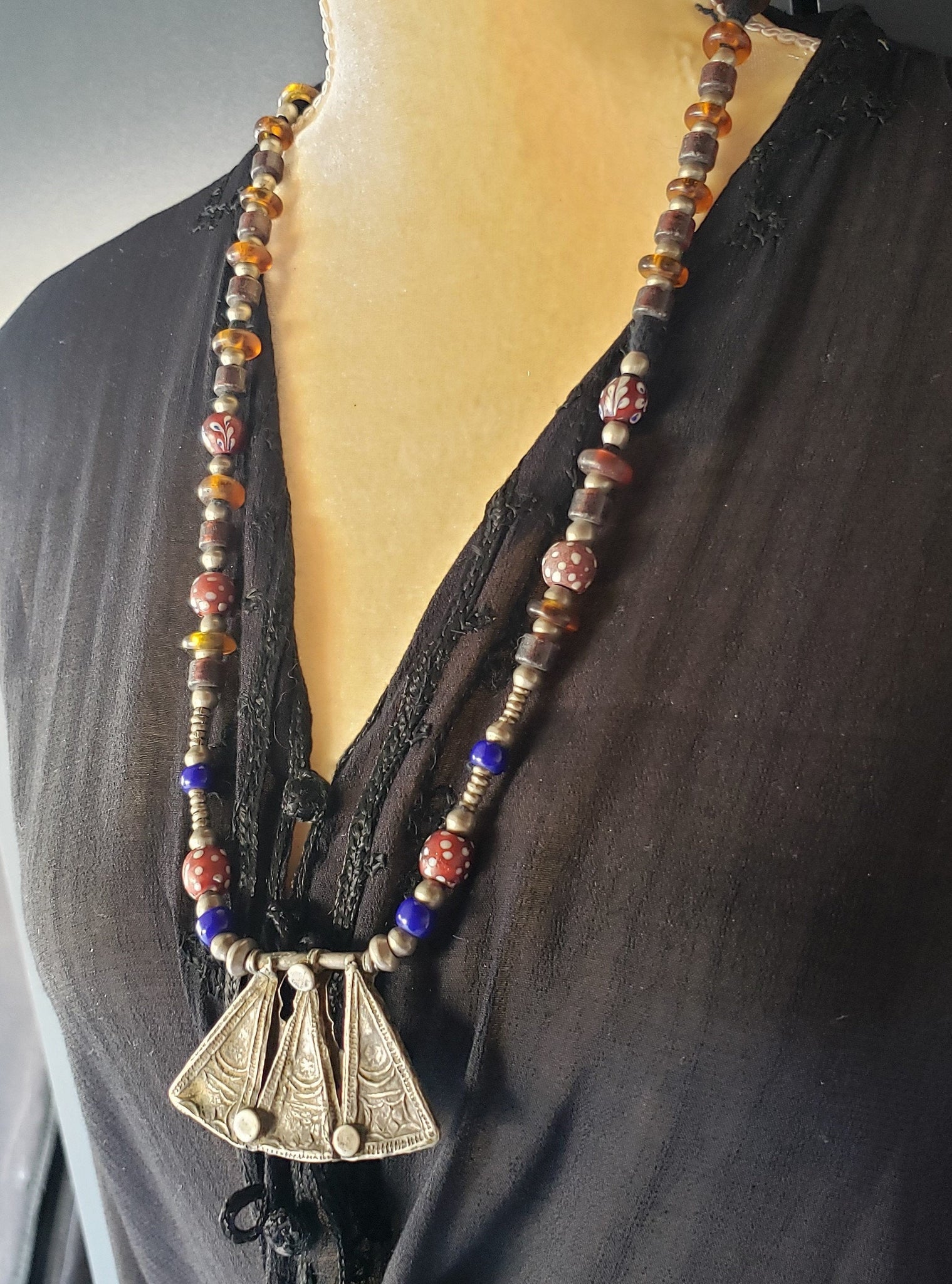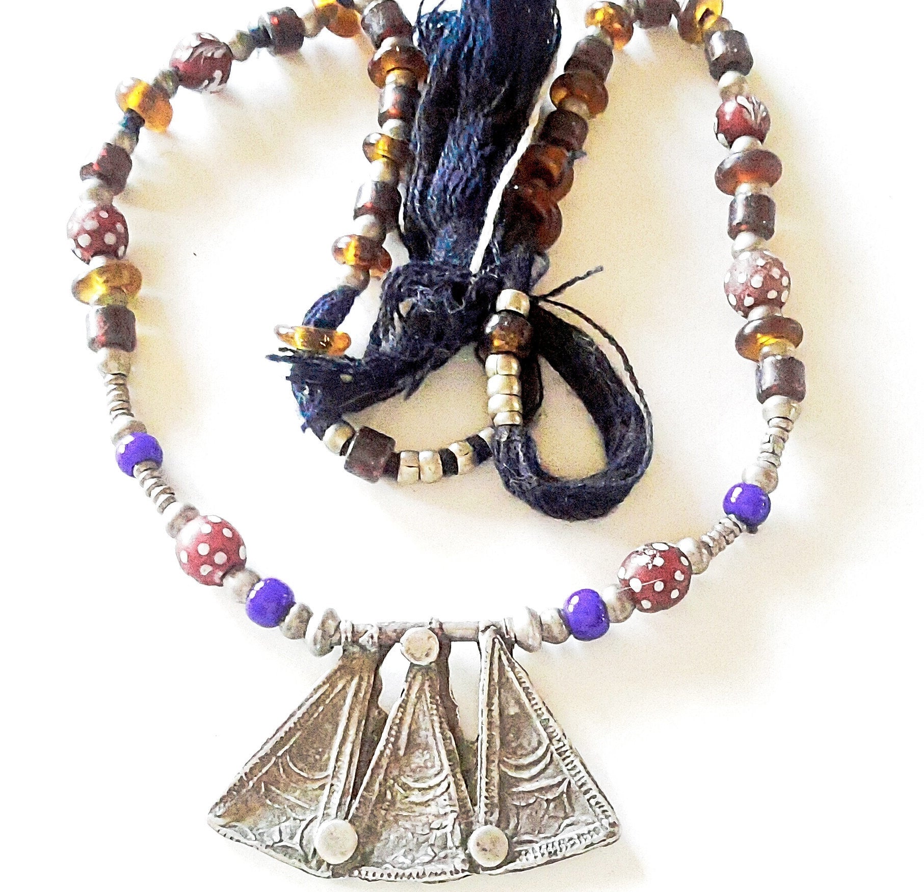 Beautiful Handmade Tribal rare Ethiopian silver amulet necklace with old blue glass Bead IN Venetian African Trade Bead an silver beads. This is a very one of a kind necklace a museum piece I got it over 20 years ago decided to sell it out of my collection Length 22" amulet size 2".5 The Necklace is also a pre-owned vintage item which may reflect signs of usage and wear. The beads are in very good condition very collectible and would be perfect for adding to your Ethiopian collection. THANK YOU Feel free to email me for more pictures. other shop https://www.etsy.com/shop/Africanbazar2US?ref=seller-platform-mcnav
