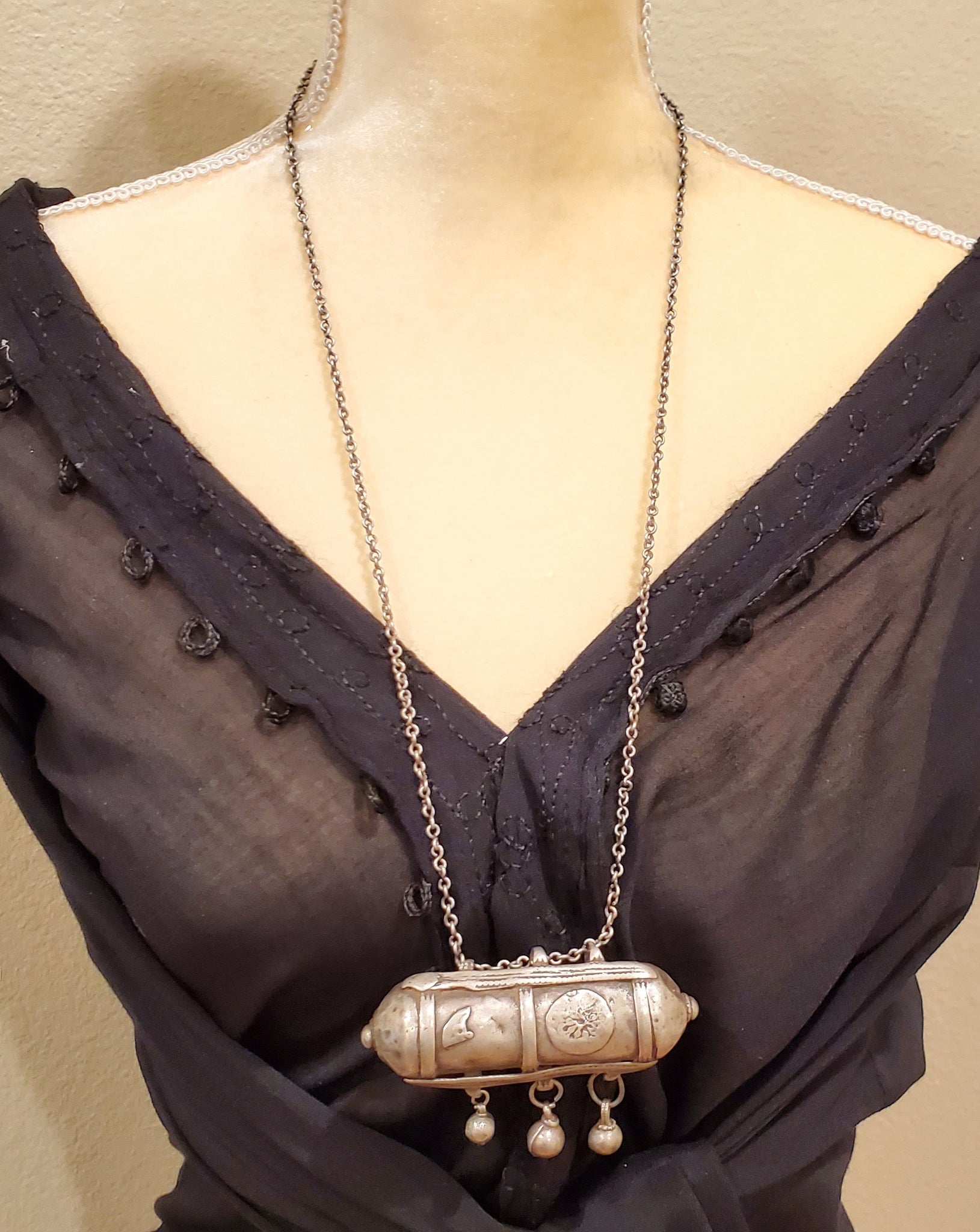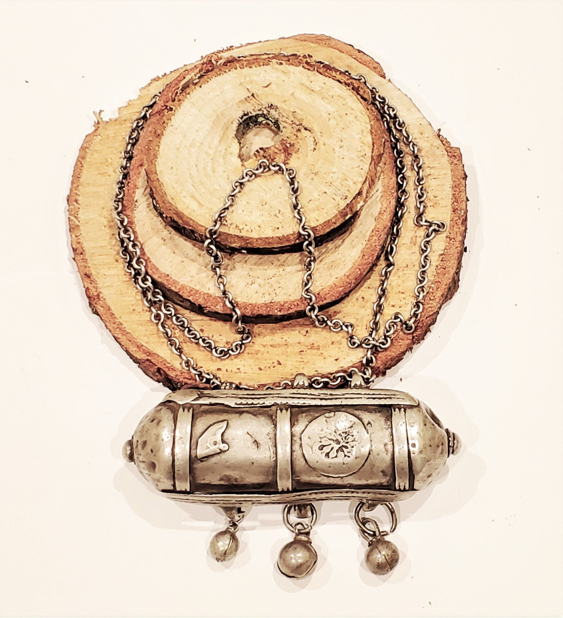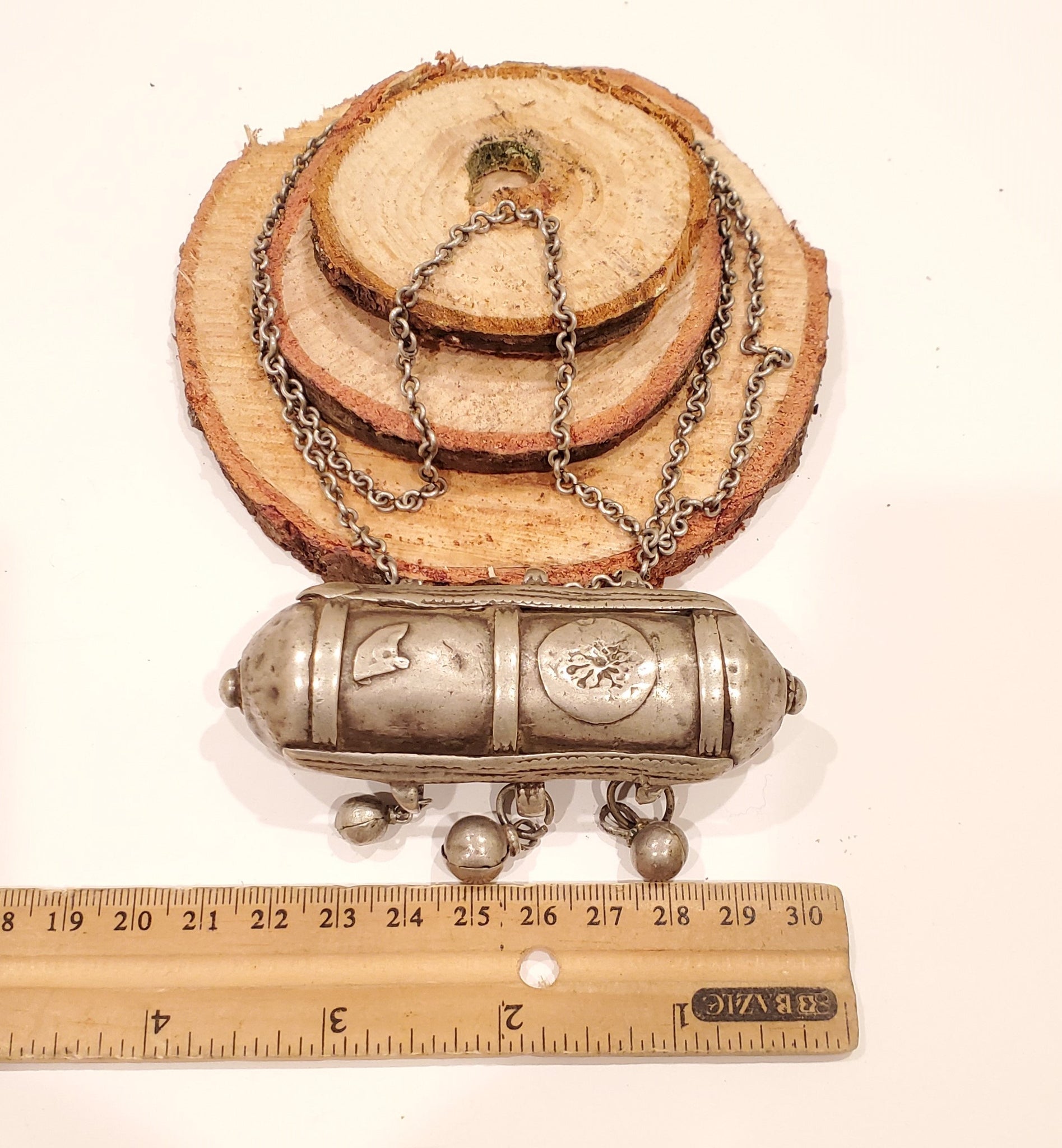 Yemen Ethnic Beautiful Handmade Silver pendant Necklace This antique tribal worn Yemen silver necklace features a handsome hinged pendants chain work Very rare piece. one of a kind necklace a museum piece Yemen Amulet necklace silver, hammered and embossed region, 20th century '' .Measures 2.5'' inches long by 4'' inches wide The thickness is (1''.5 )Good condition with an old handcrafted chain work with designs. no longer made anywhere. high Silver content, chain approx 4mm by 4mm thick, total length is 32'' inches Weight:126.grams Thank you for visiting my shop All my jewelry has been collected over 30 years ago .I will be listing more pieces shortly as I am constantly always working on posting more. piece to add to the collection .I ship all over the world and price includes a tracking service