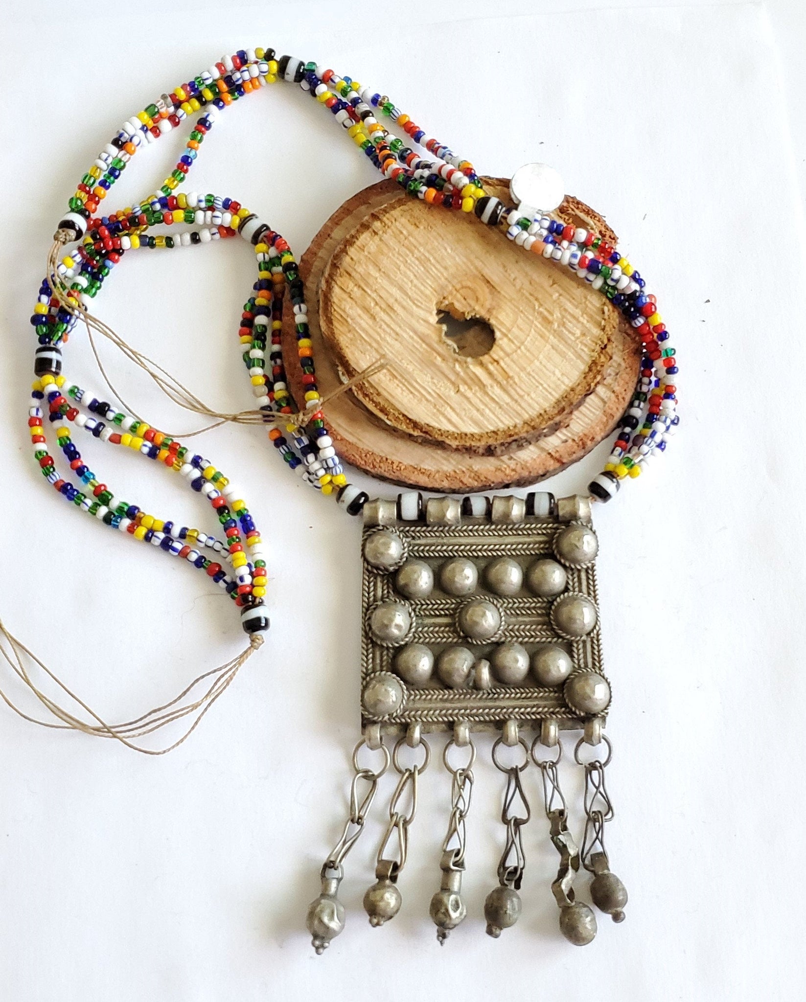 Handmade Tribal rare Ethiopian silver amulet and Glass Beads necklace,