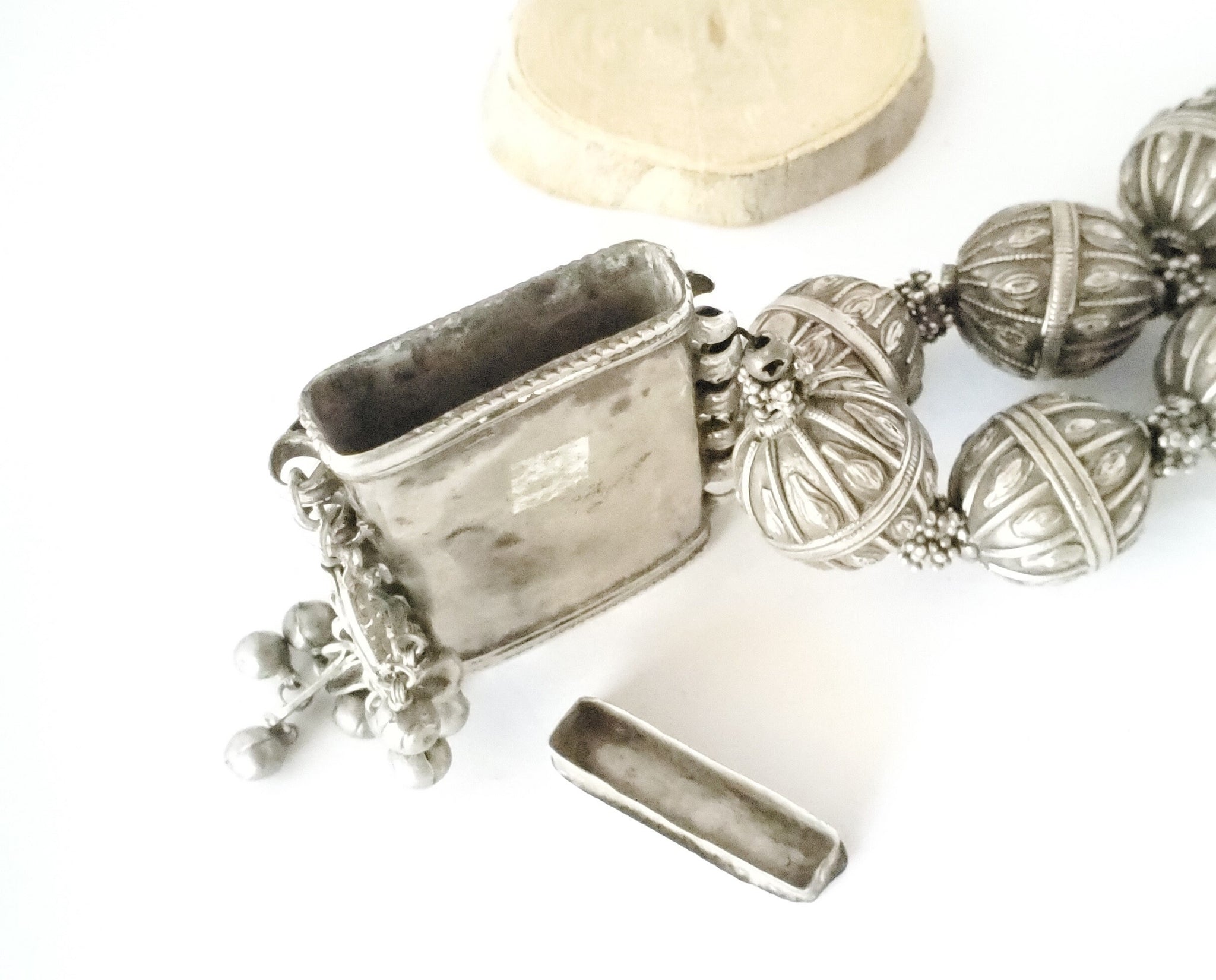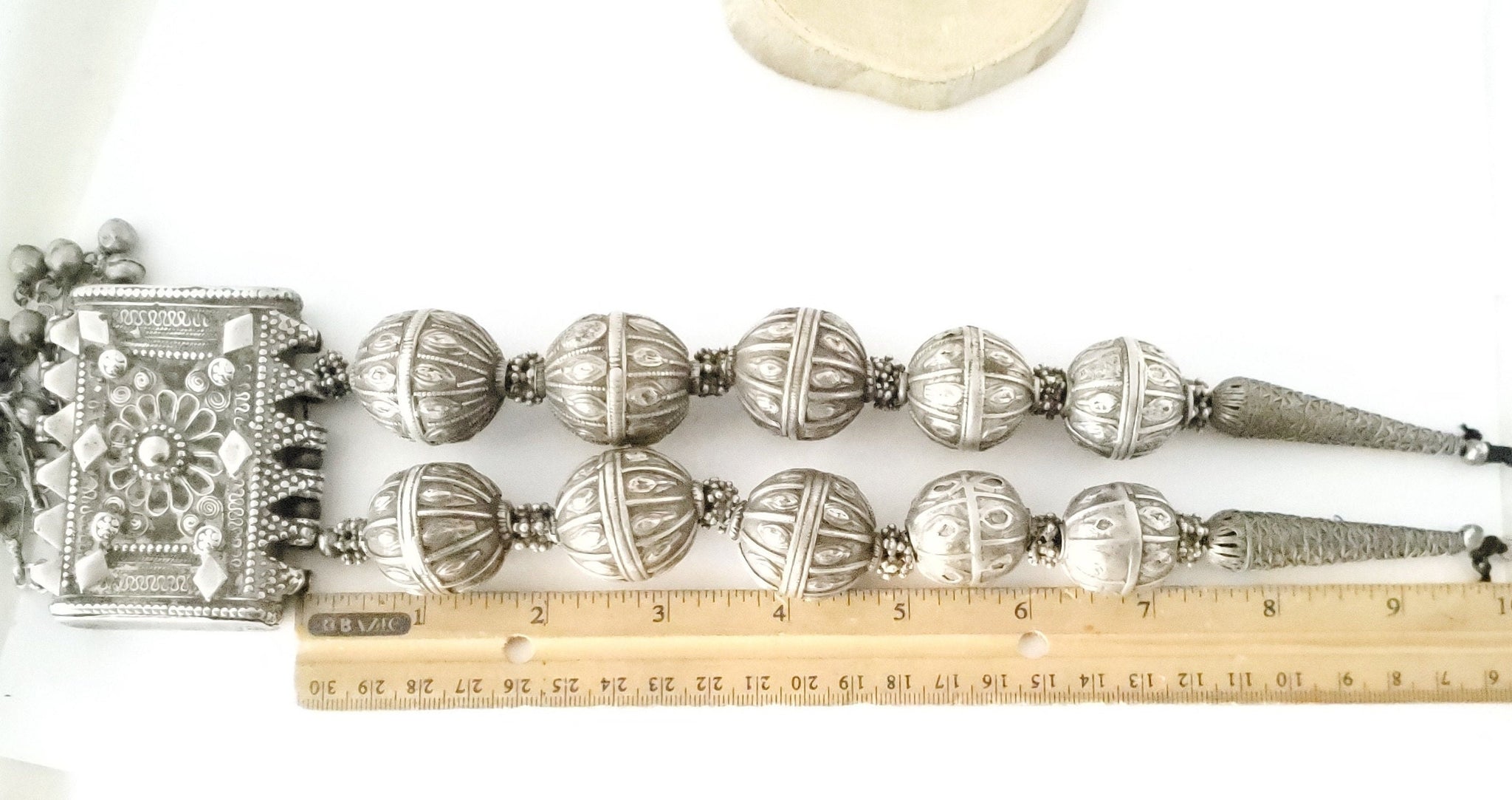 large Antique silver tribal Yemeni necklace, circa 1920s. Rare with intricate silver smiting Beautifully made, decorated and shaped. filigree Pendant amulet hang small silver dangles pendants. Silver Bawsani filigree . could also be used by Women as decorative accessory and prayer container, the necklace also has typical Yemeni silver Antique Large silver hallmarked stamped Ball beads exquisite Jewish silversmith workmanship typical of turn of the century