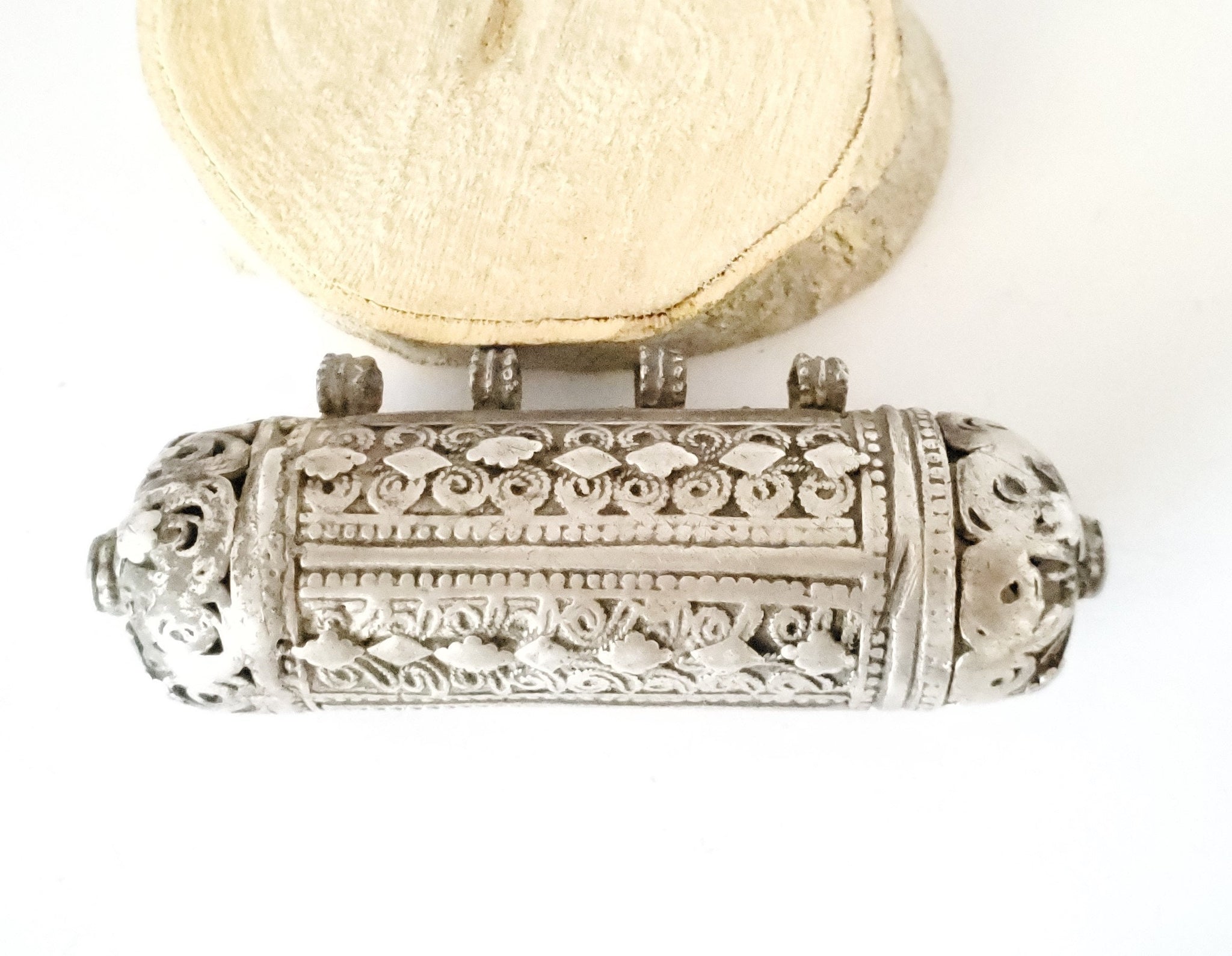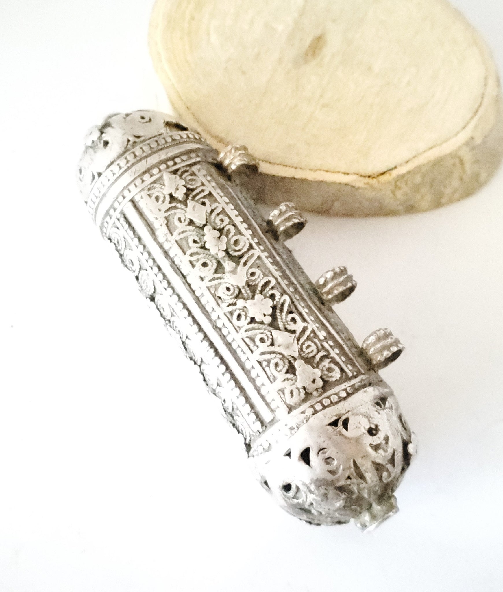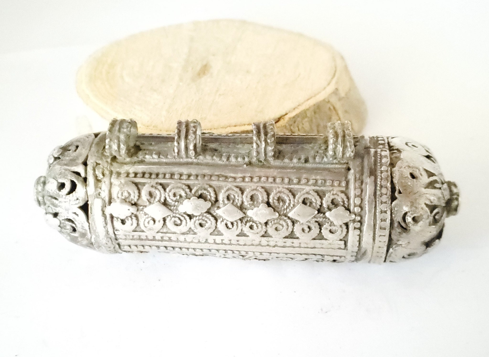 Antique Original Yemenite Jewish 'Hirz' Bawsani filigree silver pendant tribal jewelry old Bedouin tribal silver amulet scroll holder pendant hirz, filigree, granulation These Pendant make very appealing pendant They also serve as focus Pendant for hanging on a string with other beads or with old silver chain a do-it-yourself project or for a jewelry designer to use in a fantastic necklace.it fit onto the fine braided black leather cord if you wish to wear it all by itself. These pendants are also called as "hirz" and usually made to contain a prayer or blessing. This piece has been soldered, so that it cannot be opened