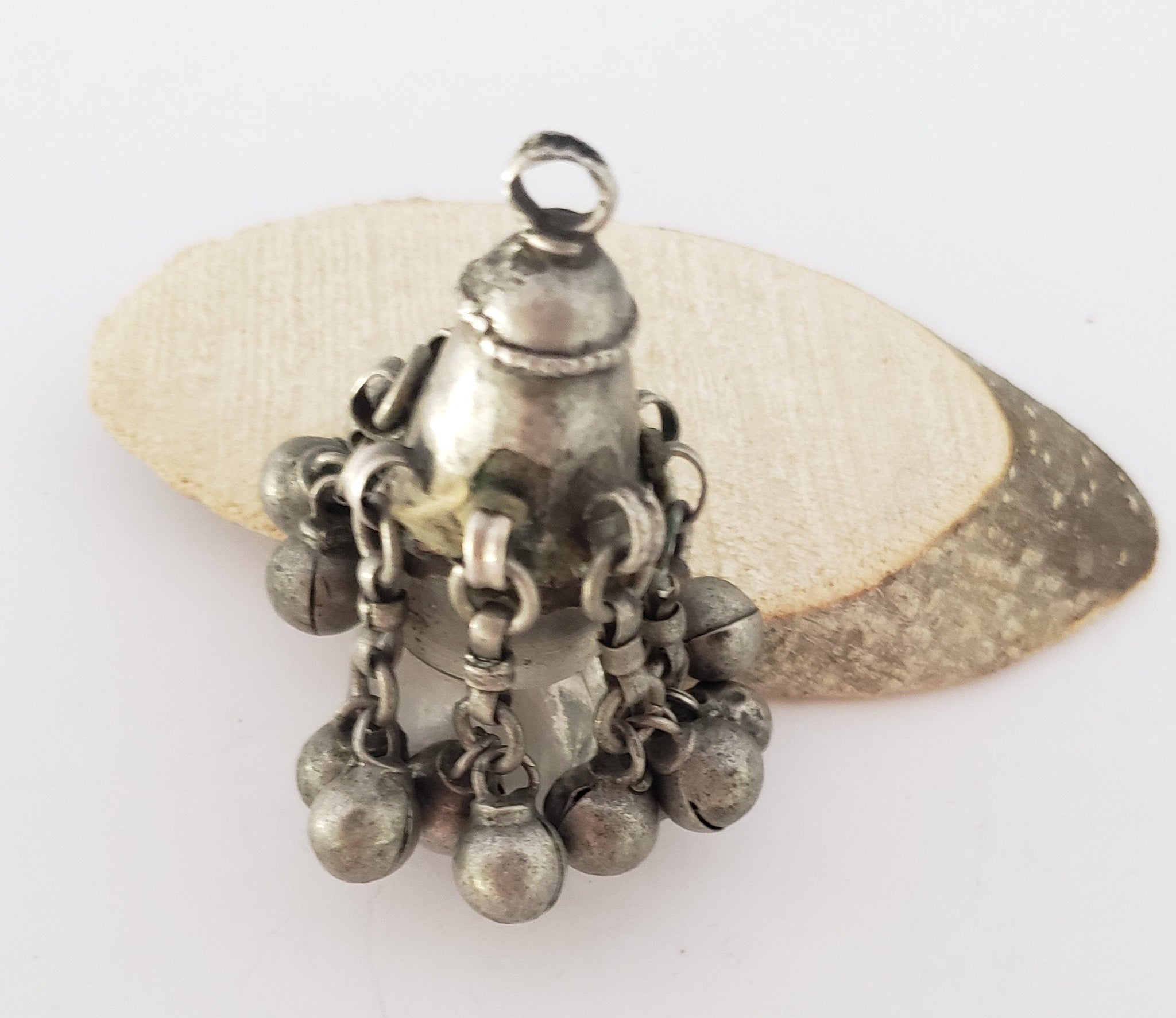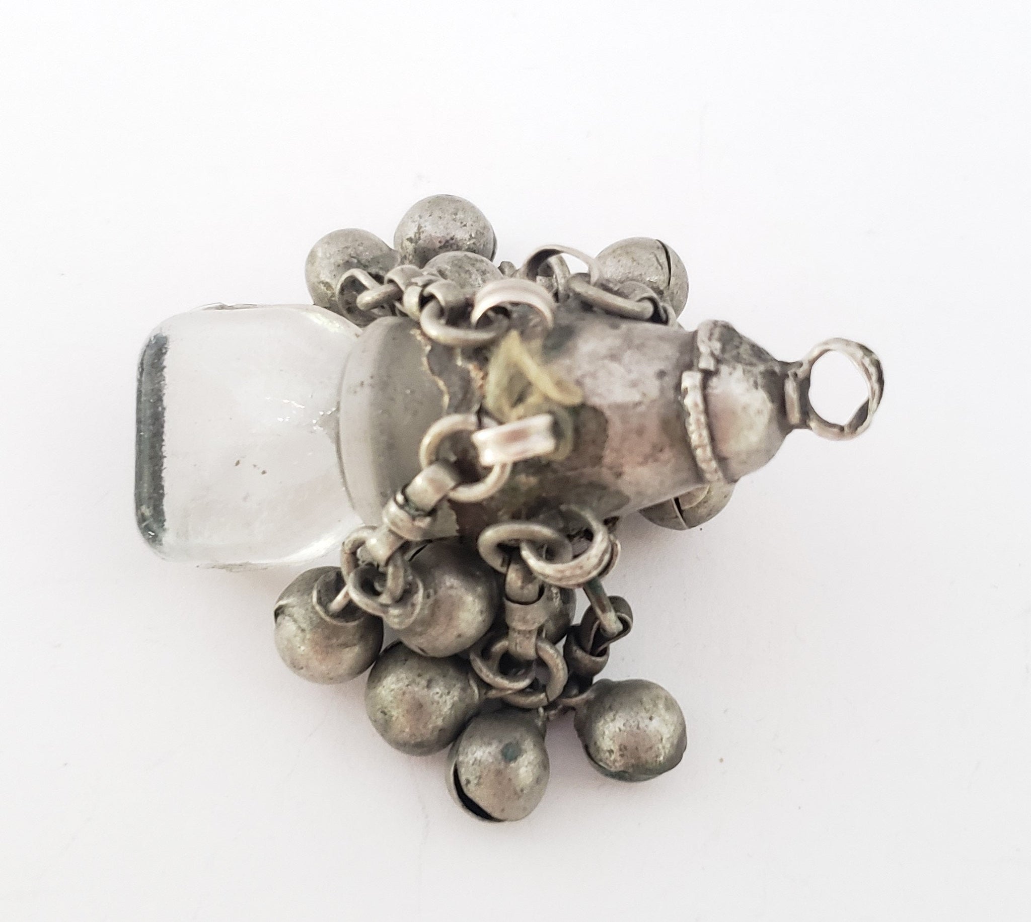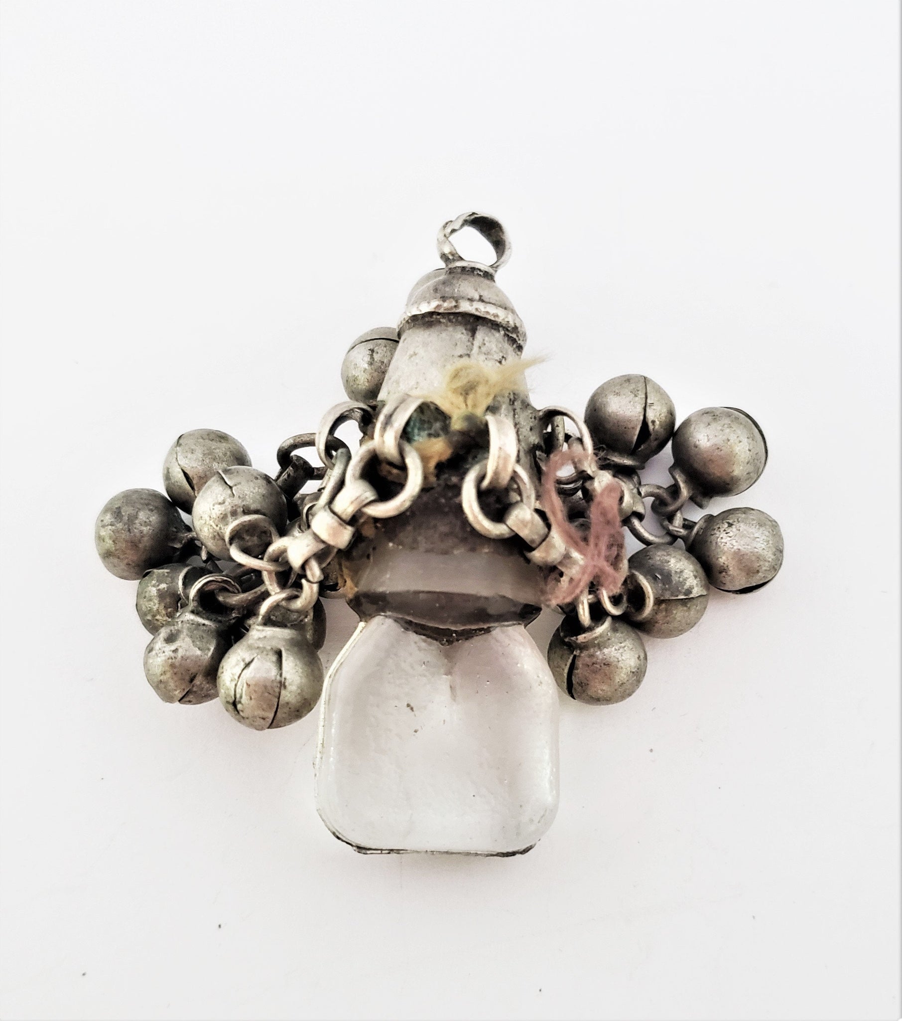 antique Moroccan very Rere silver glass talisman with dangle silver pendant with dangle silver beads from Middle Atlas ( from South-West to North-East ), in Morocco. These boxes were hanged up to fibulae and . Early to mid 20th century. The box is made up with sterling silver 925 dangles pendants In good conditions. A rare ideal for necklace project.It measure about ( 2 " ) in diameter and the height ( 3" ) The thickness is ( 1" ). Weighs 20 grams features fantastic wire-work; please refer to the photos It is in good condition commensurate with age and use.The box portion is empty and somewhat dented on the back (see photo)Early 20th century other shop https://www.etsy.com/shop/Africanbazar2US?ref=seller-platform-mcnav