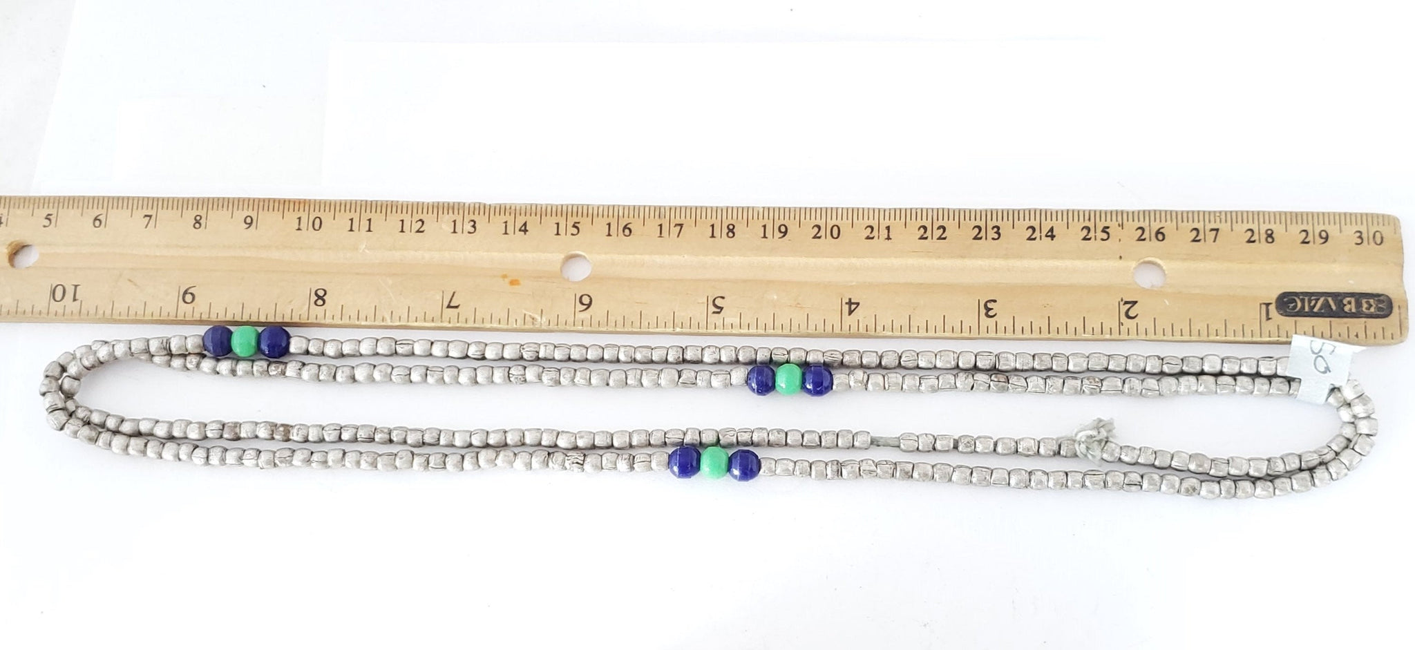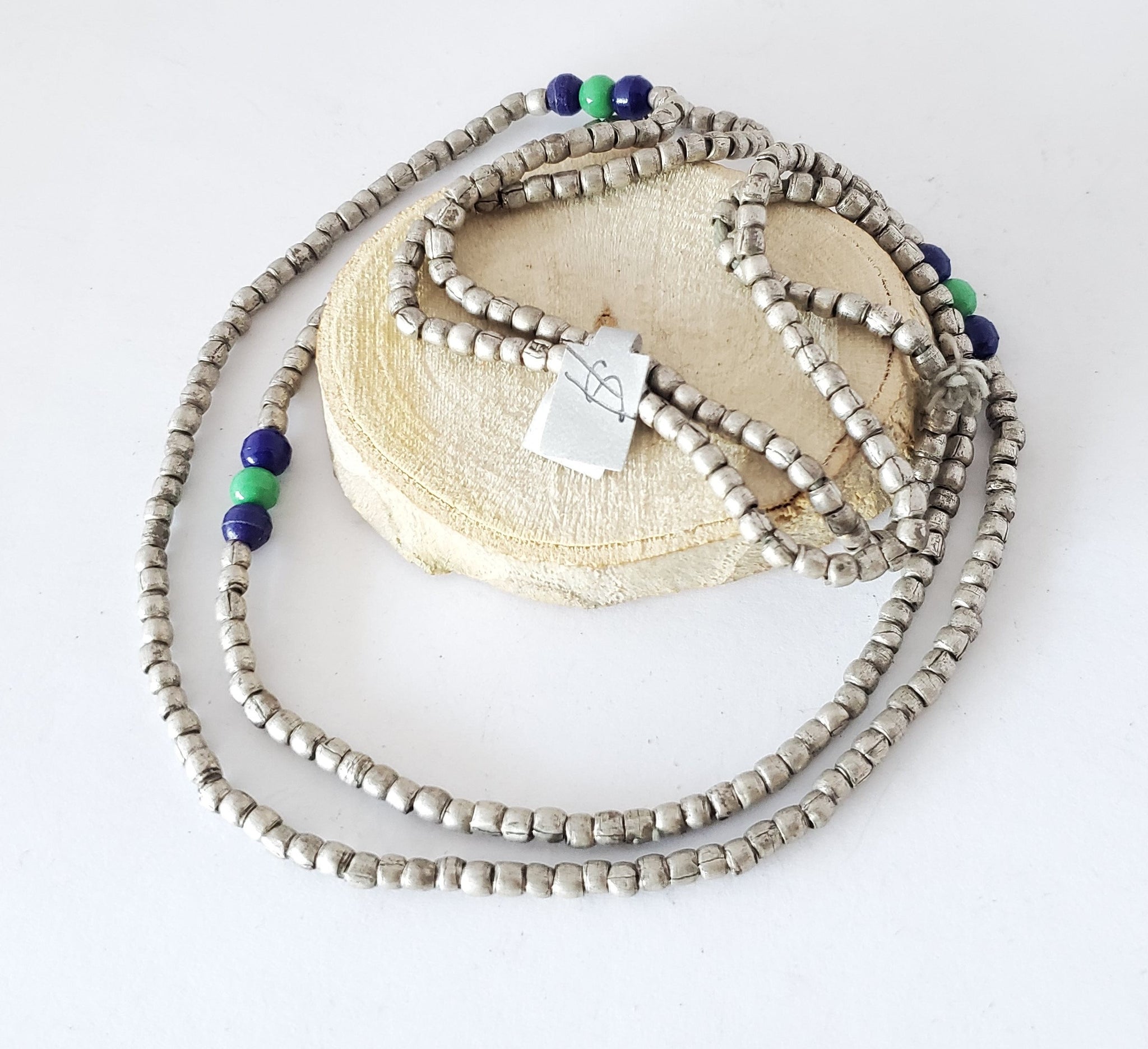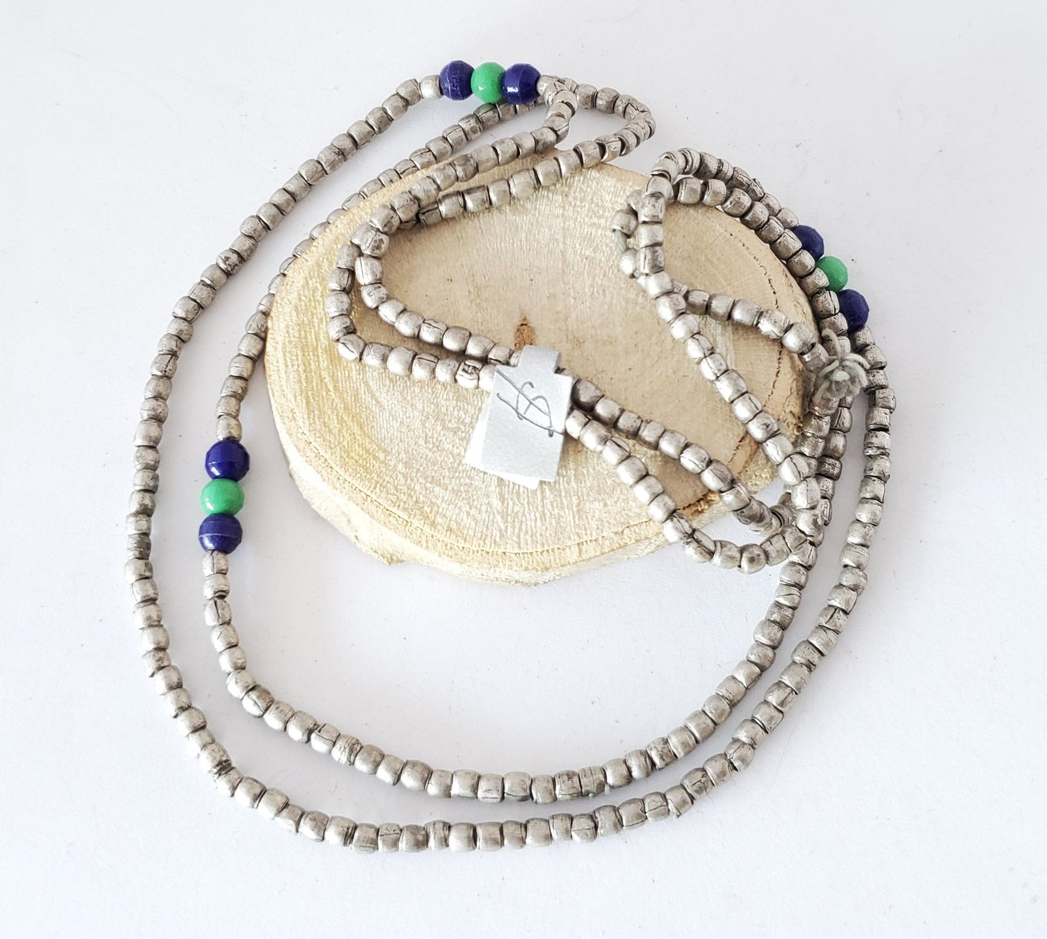 beautiful! strand of antique silver heishi and beads from Ethiopia. Most are 4mm diameter on raffia 40 inches strand Silver bead measures of 2mm diameter x 3mm thick and The hole is 2mm wide/ heishi from Ethiopia; high silver content. Over 100 years old....