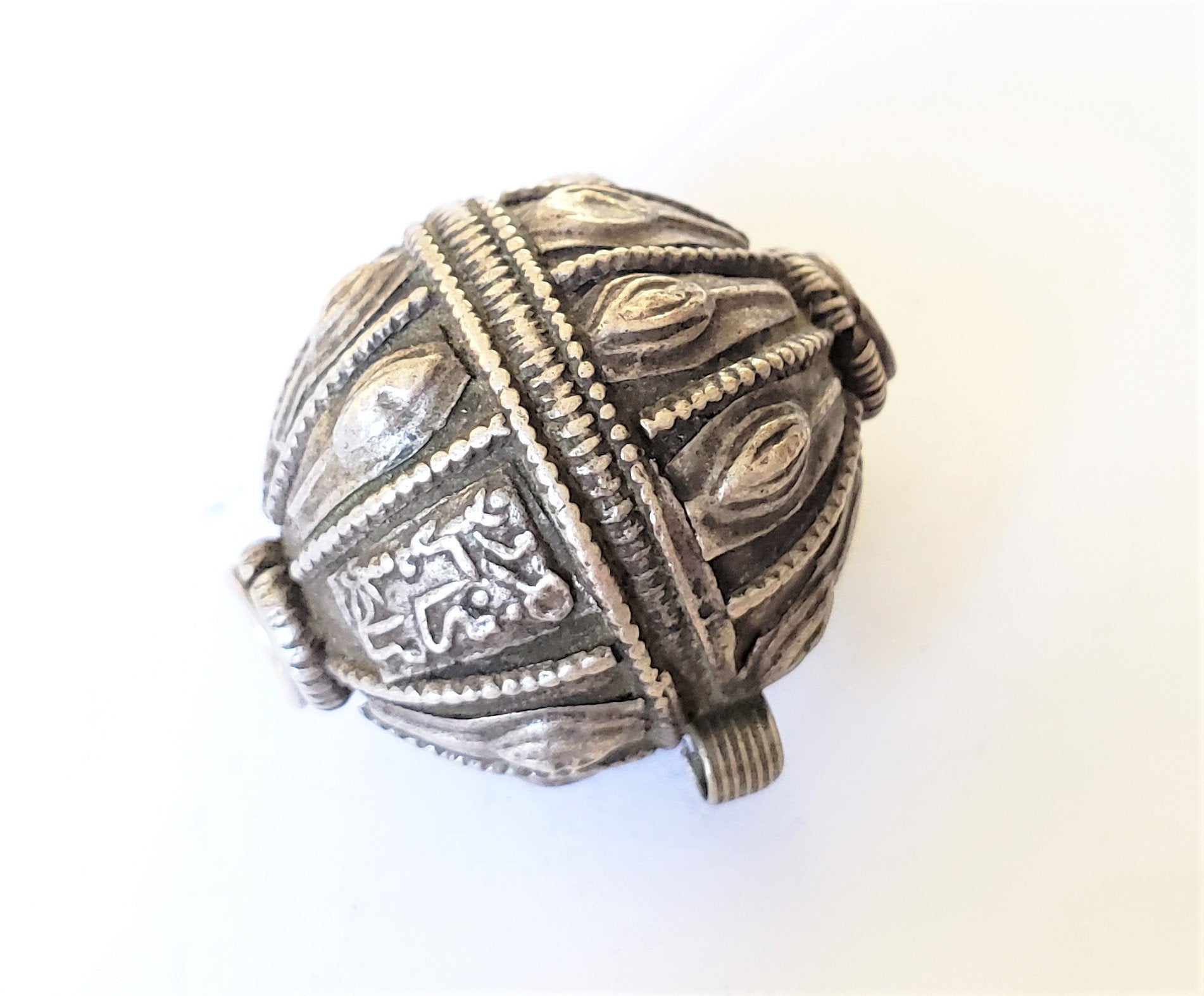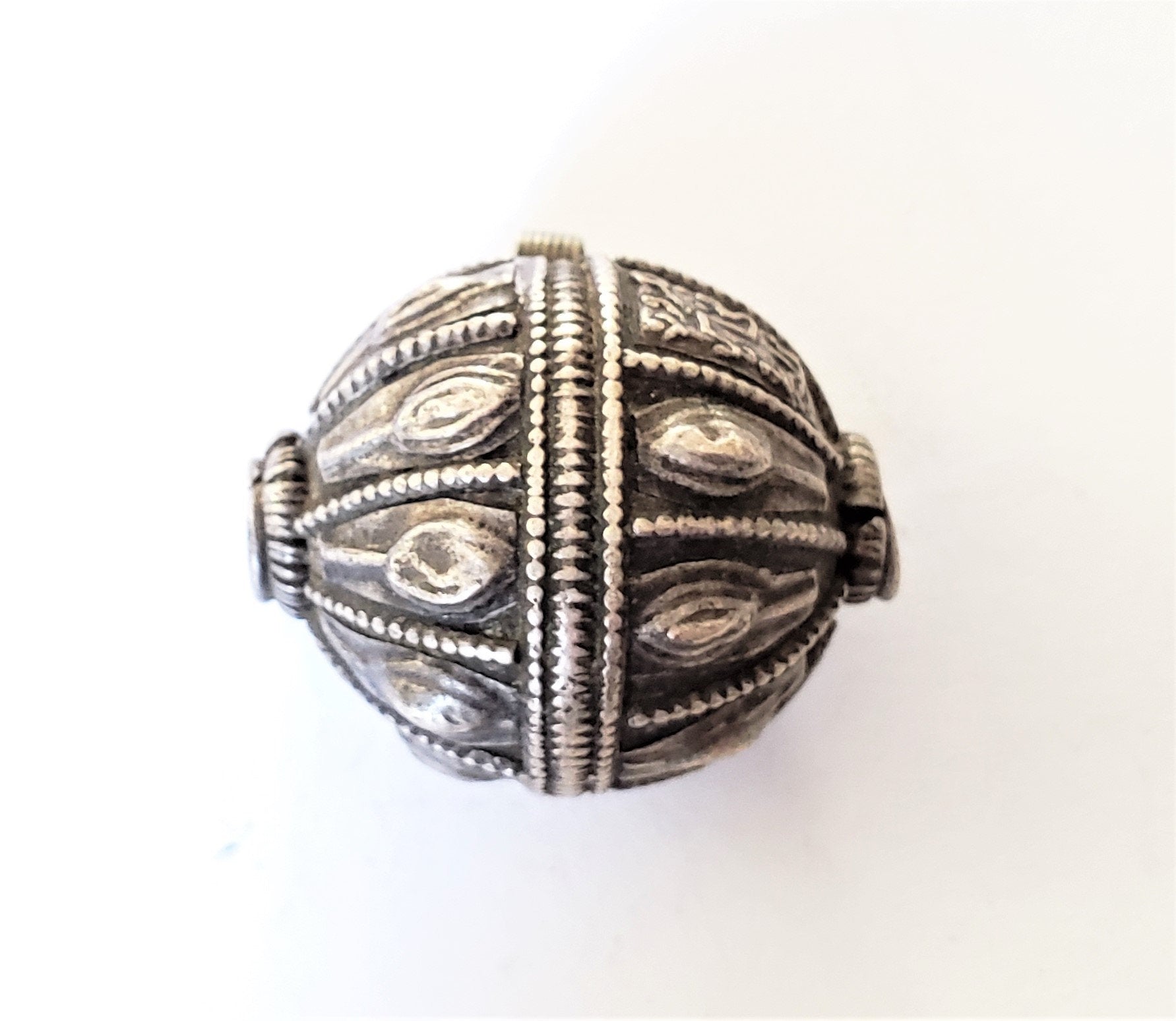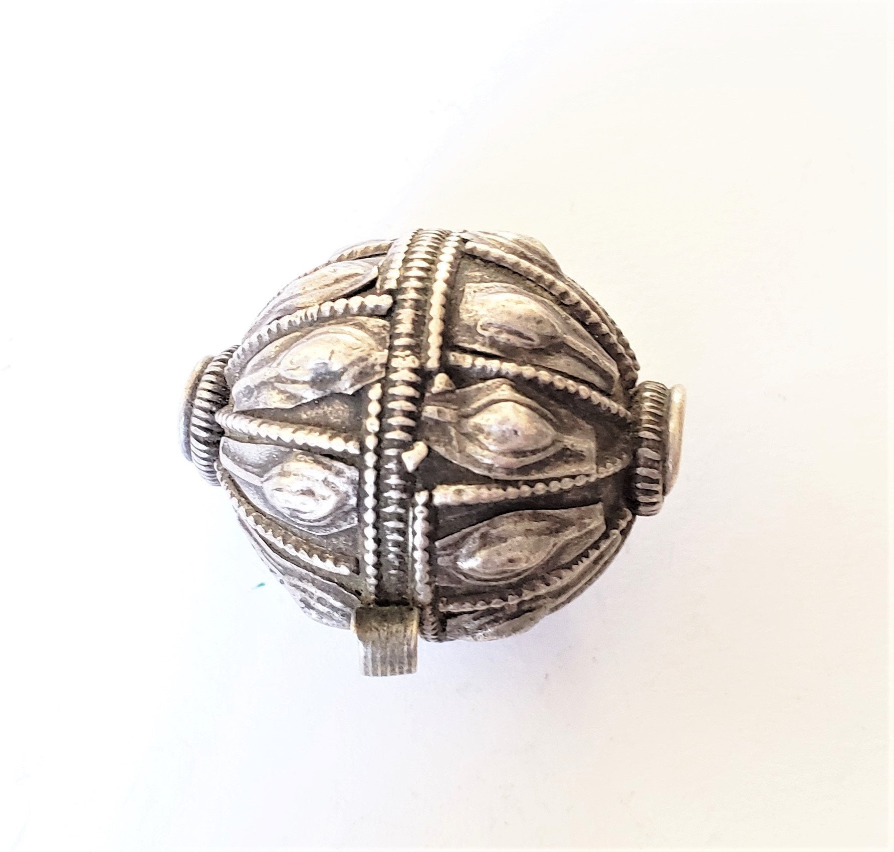 old silver hallmarked beads from Yemen, circa 1910s. Rare with intricate silver smiting Beautifully made, decorated and shaped. Good alloy of silver. Old pieces with beautiful patina,This kind of ones. Good condition Collectible and useful as jewelry supplies Measures:1''.5x 1''.5