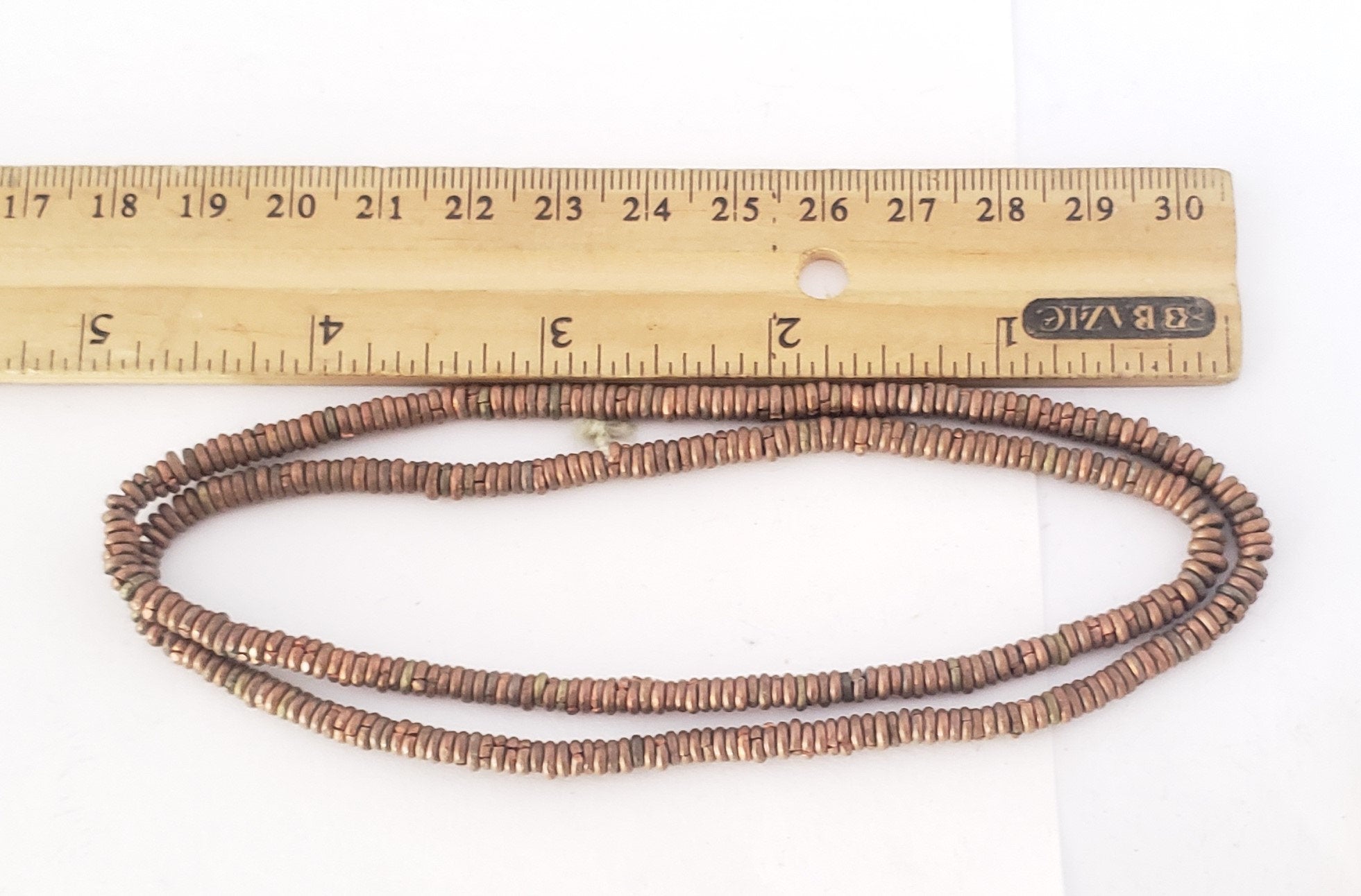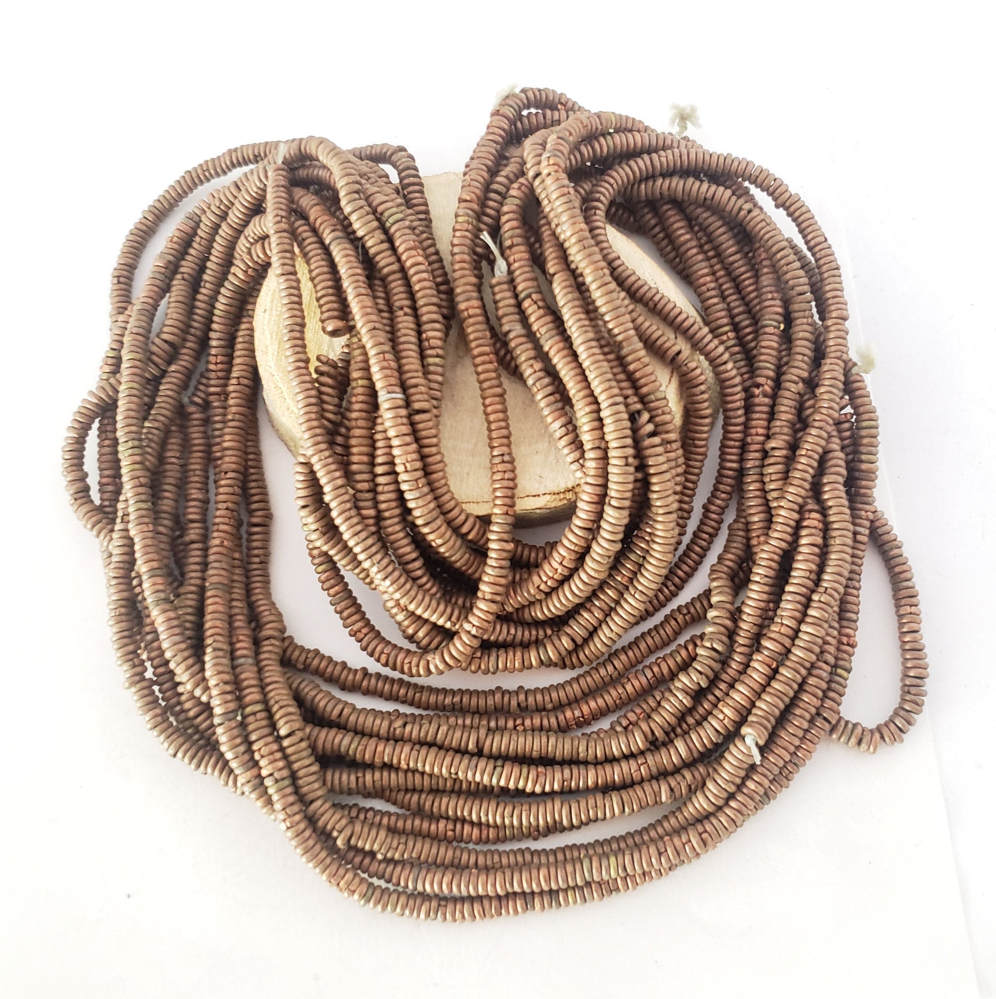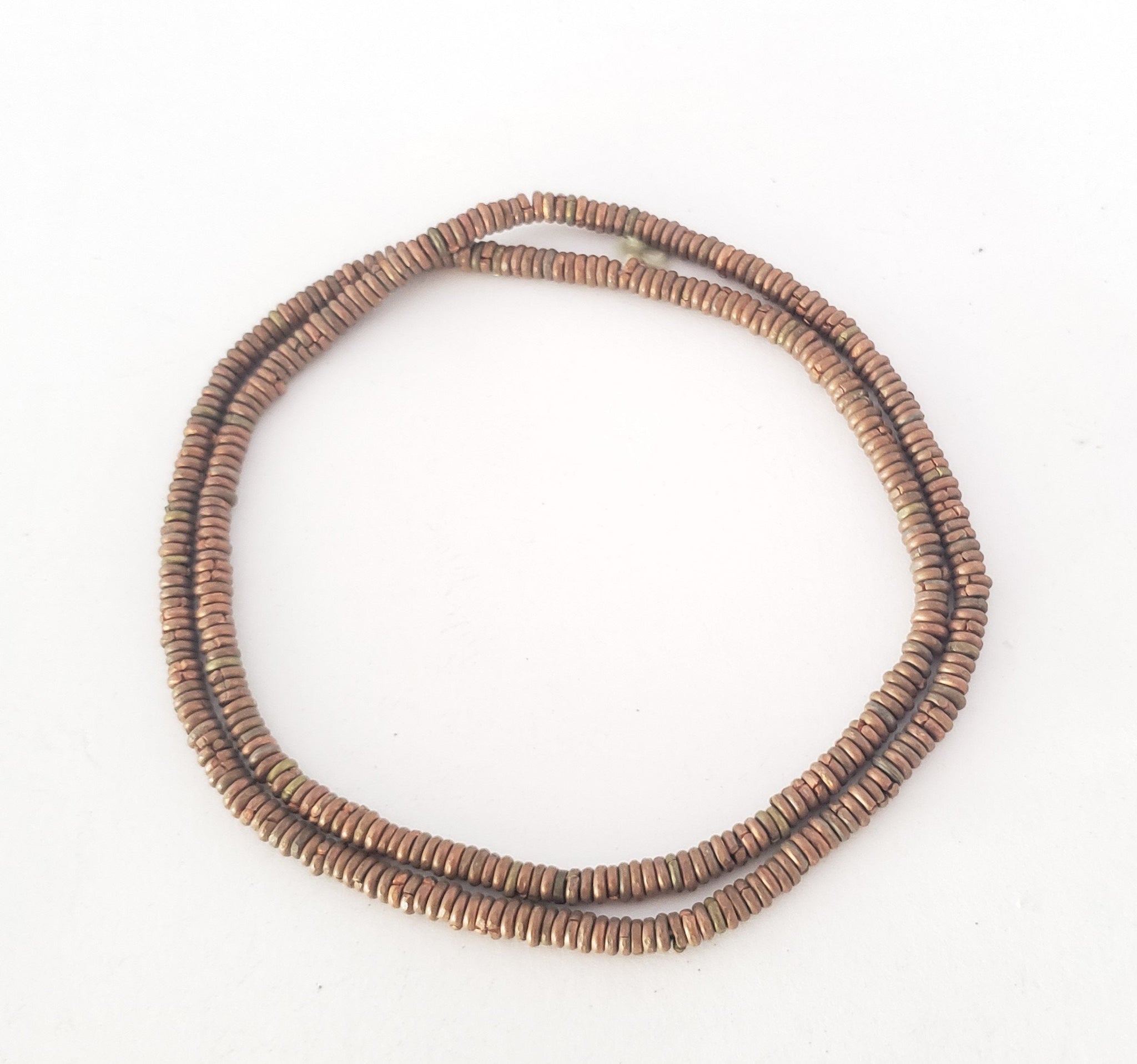 very old strand of Brass Heishi Anklet beads beautiful! May have once been an anklet! from-Ethiopia These beautiful very old Brass Heishi Anklet beads strand form Ethiopian on raffia 11 inches strand Brass bead measures of small 4mm diameter x 2mm thick heishi from Ethiopia; high Brass content. Over 100 years old; and The hole is 2mm wide.... A beautiful strand to add interest and texture to any jewellery The beads are in very good condition.very collectible and would be perfect for adding to your Ethiopian collection. other shop https://www.etsy.com/shop/Africanbazar2US?ref=seller-platform-mcnav