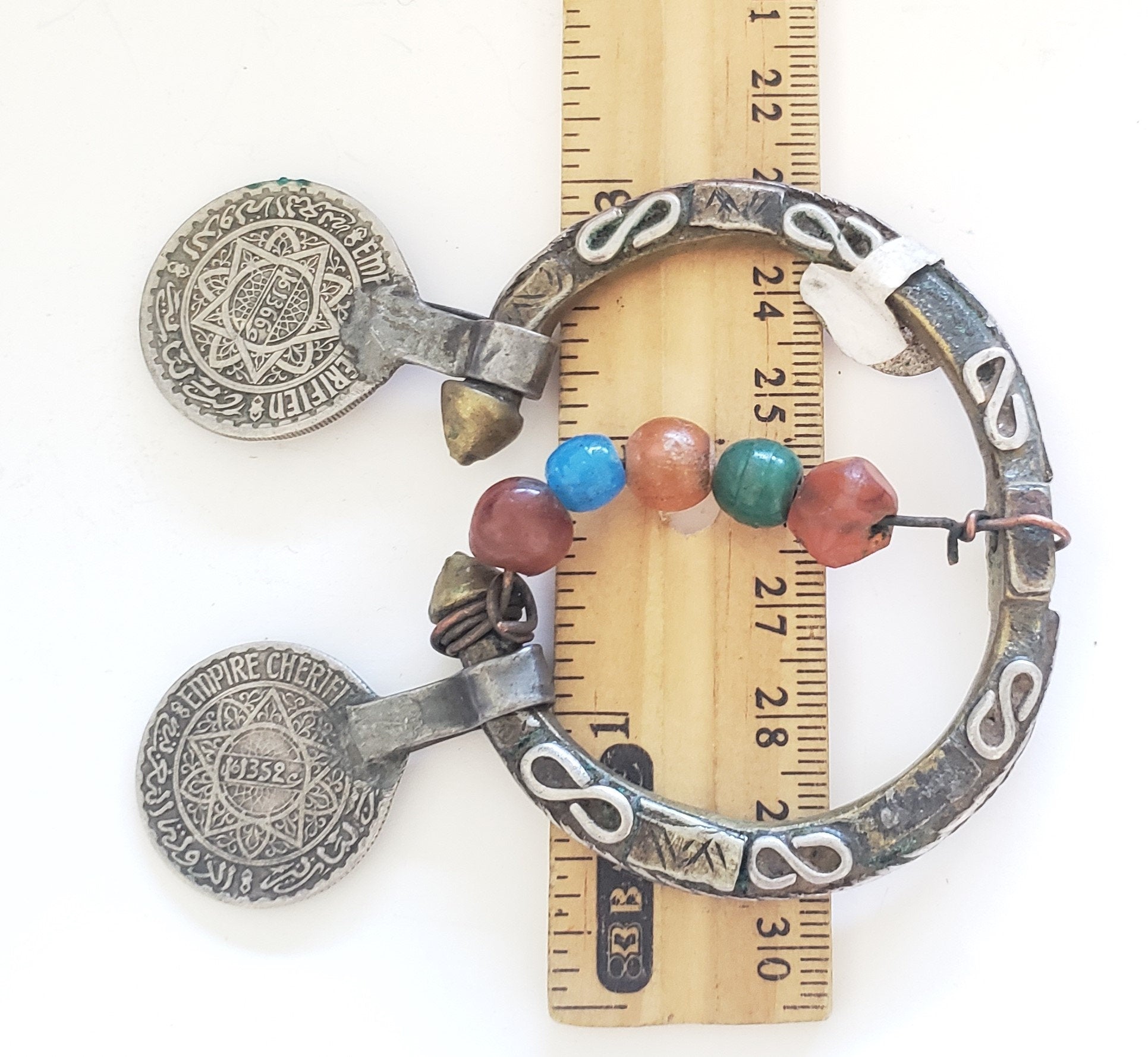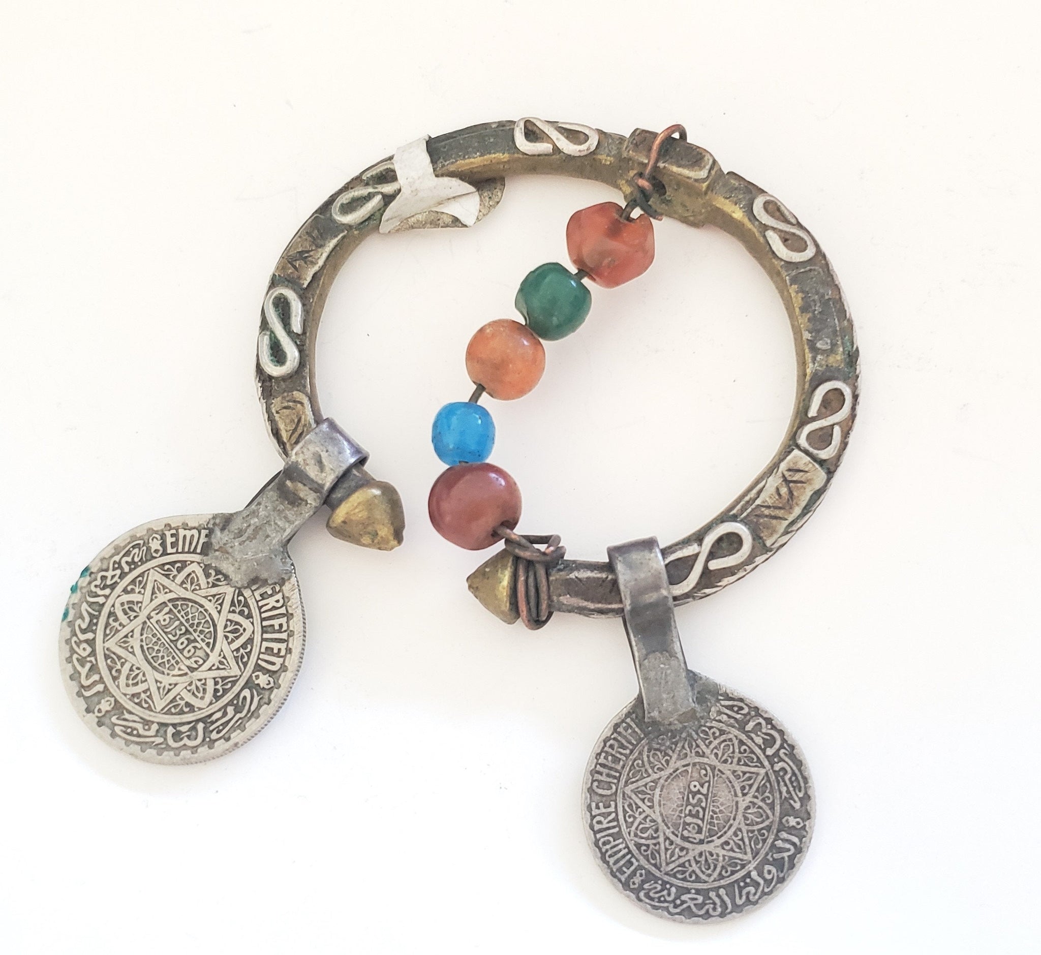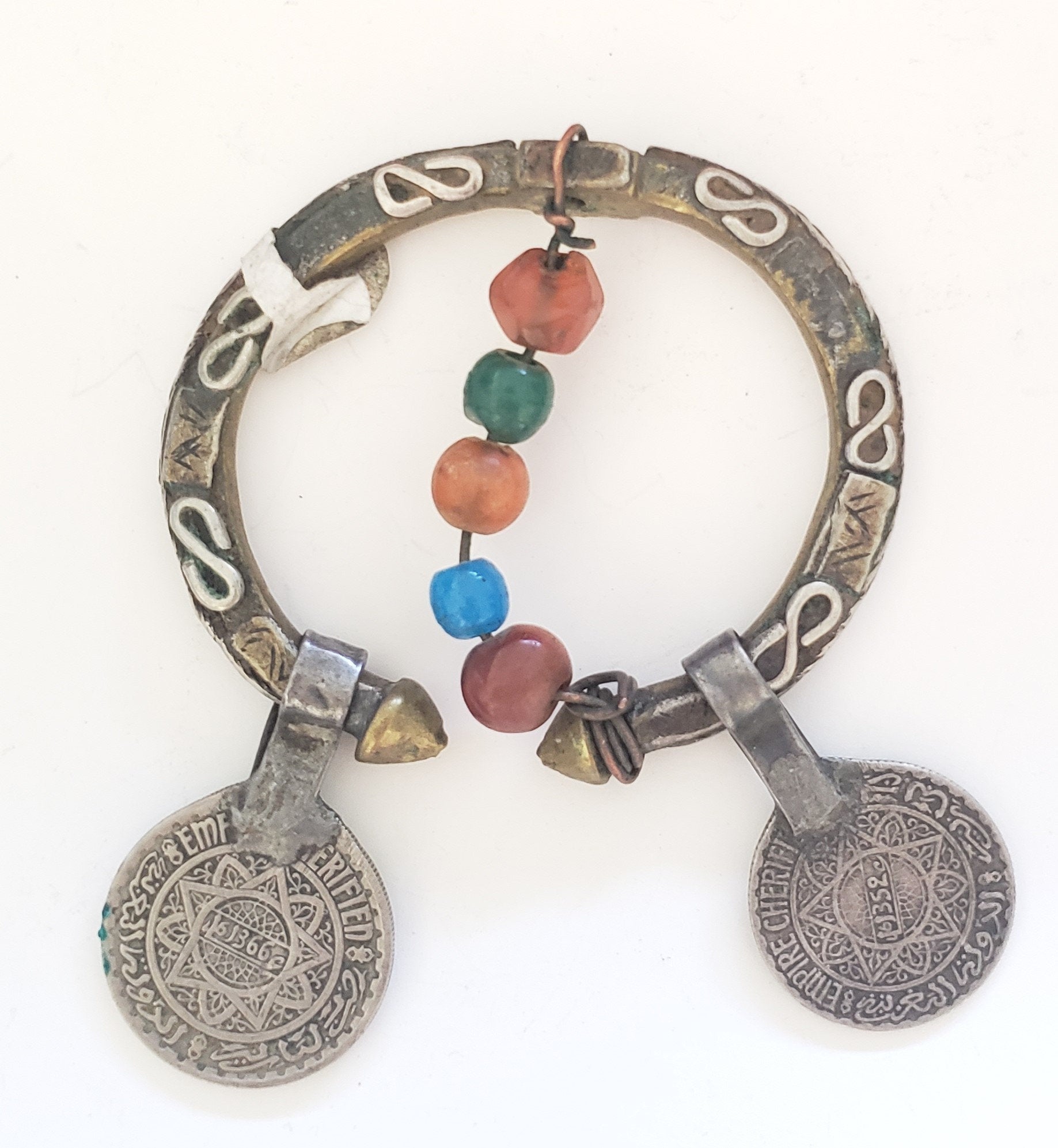 Beautiful antique brass Silver coins,glass Agate Tuareg or Moor head ornament, from South Morocco or Mauritania. Circular samples complete and decorated with old beads are very rare and hard to come by. The center is made up with of Brass silver. A World of Head Ornaments. The silver coins are islamic and dated early 19th century. In very good and original conditions. It measure ( 3" ) in diameter and the height is 3''. Weighs 36 grams. Thank you for visiting my shop All my jewelry has been collected over 18 years ago.I will be listing more pieces shortly as I am constantly always working on posting more. piece to add to the collection.I ship all over the world and price includes a tracking service.. other shop https://www.etsy.com/shop/Africanbazar2US?ref=seller-platform-mcnav