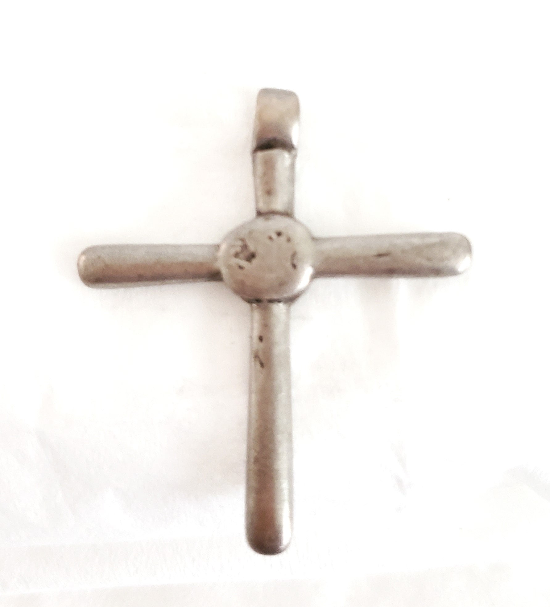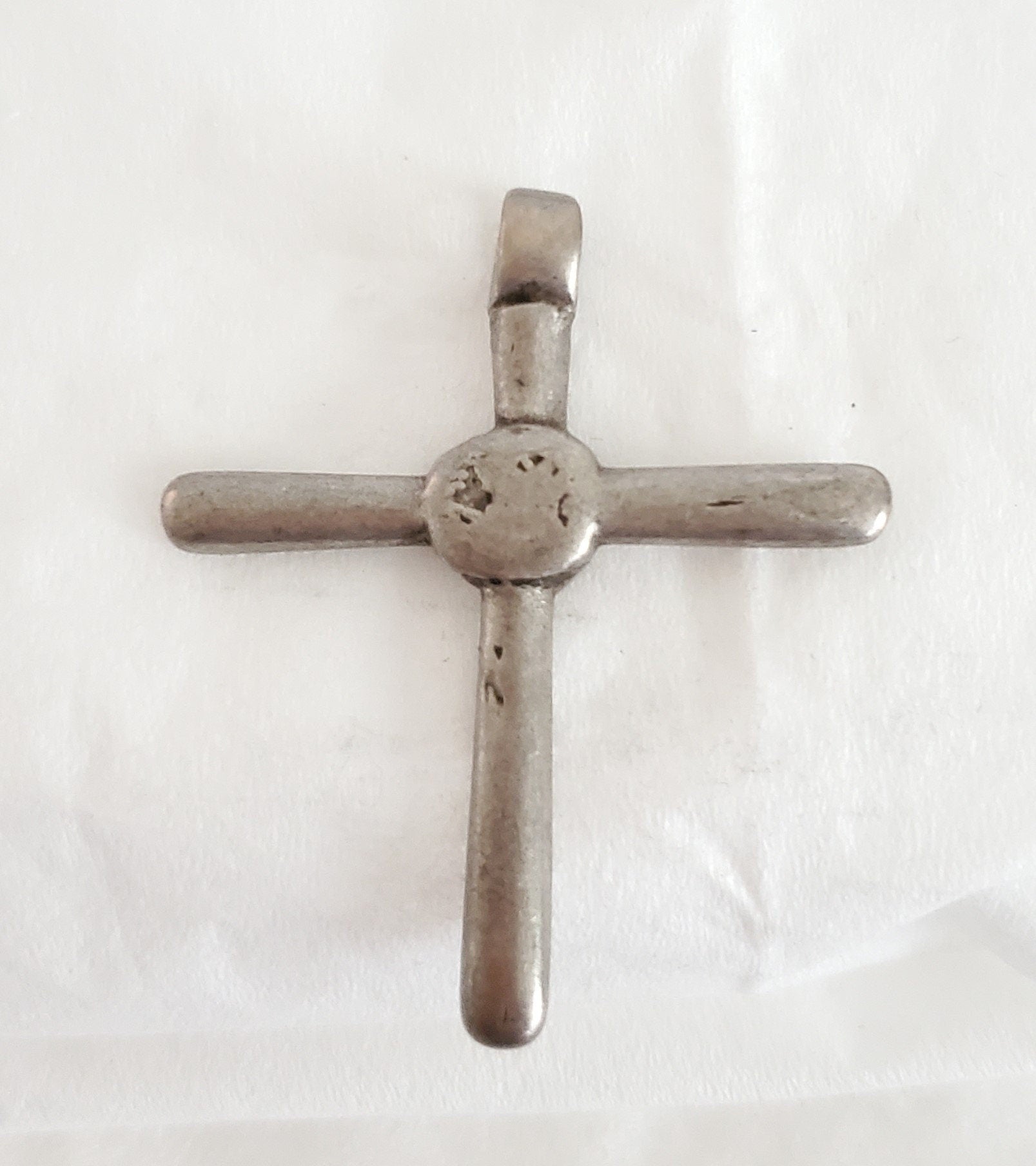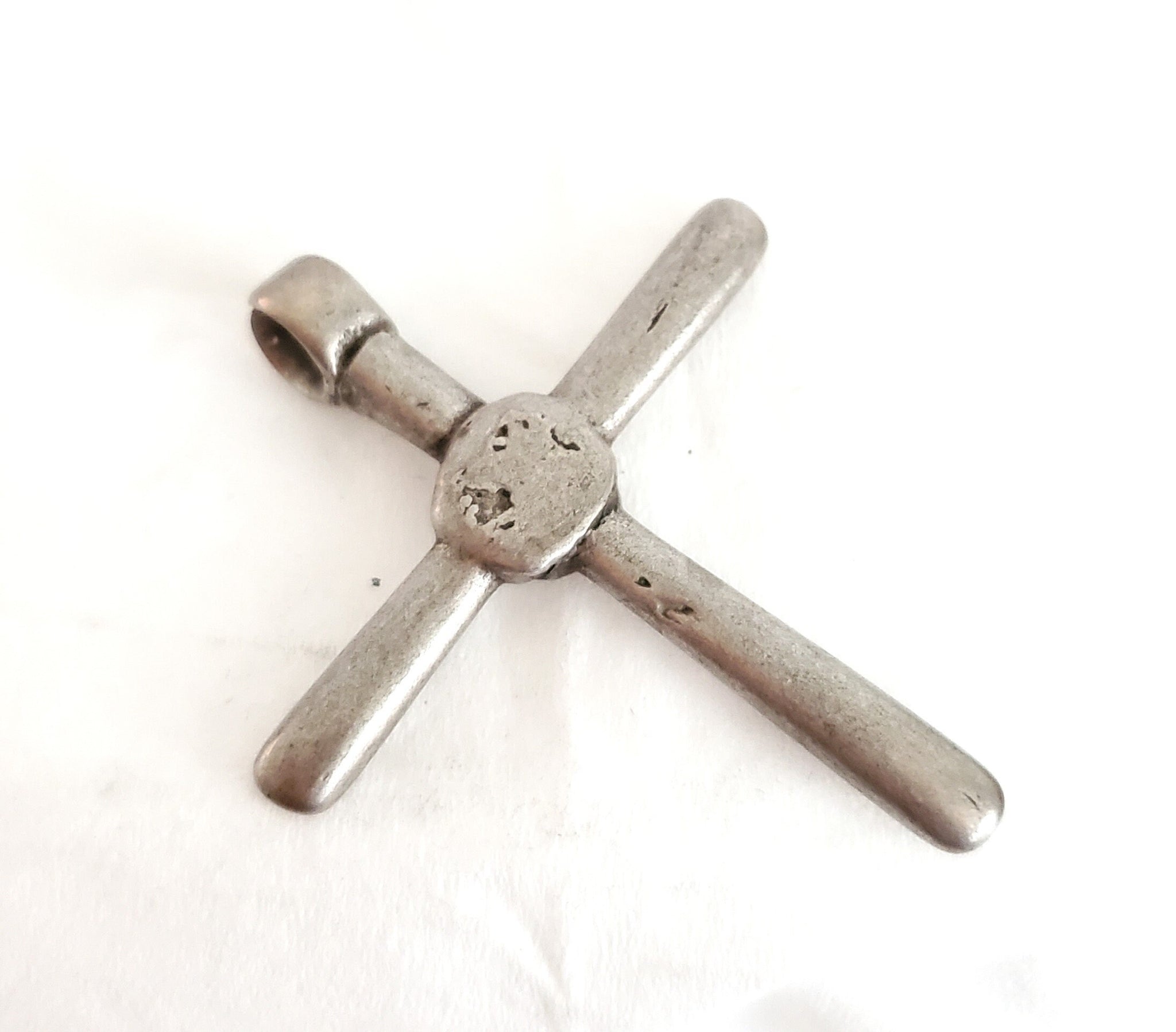 beautiful old handmade Ethiopian cross pendant made of silver . In Ethiopia particularly among Orthodox Church followers, to wear a cross implied to be protected by the lord himself as well as to show that they are a devoted Christian. Neck or pictorial crosses are tied round their owner’s neck with a piece of blue thread or cord, which was sometimes given to the wearer at baptism. This particular cross pendant is old and has been used. Measures approximatelty 2" x 1‘‘.5 long Age: over 100 great condition Collectible other shop .....africanbazaarus.com