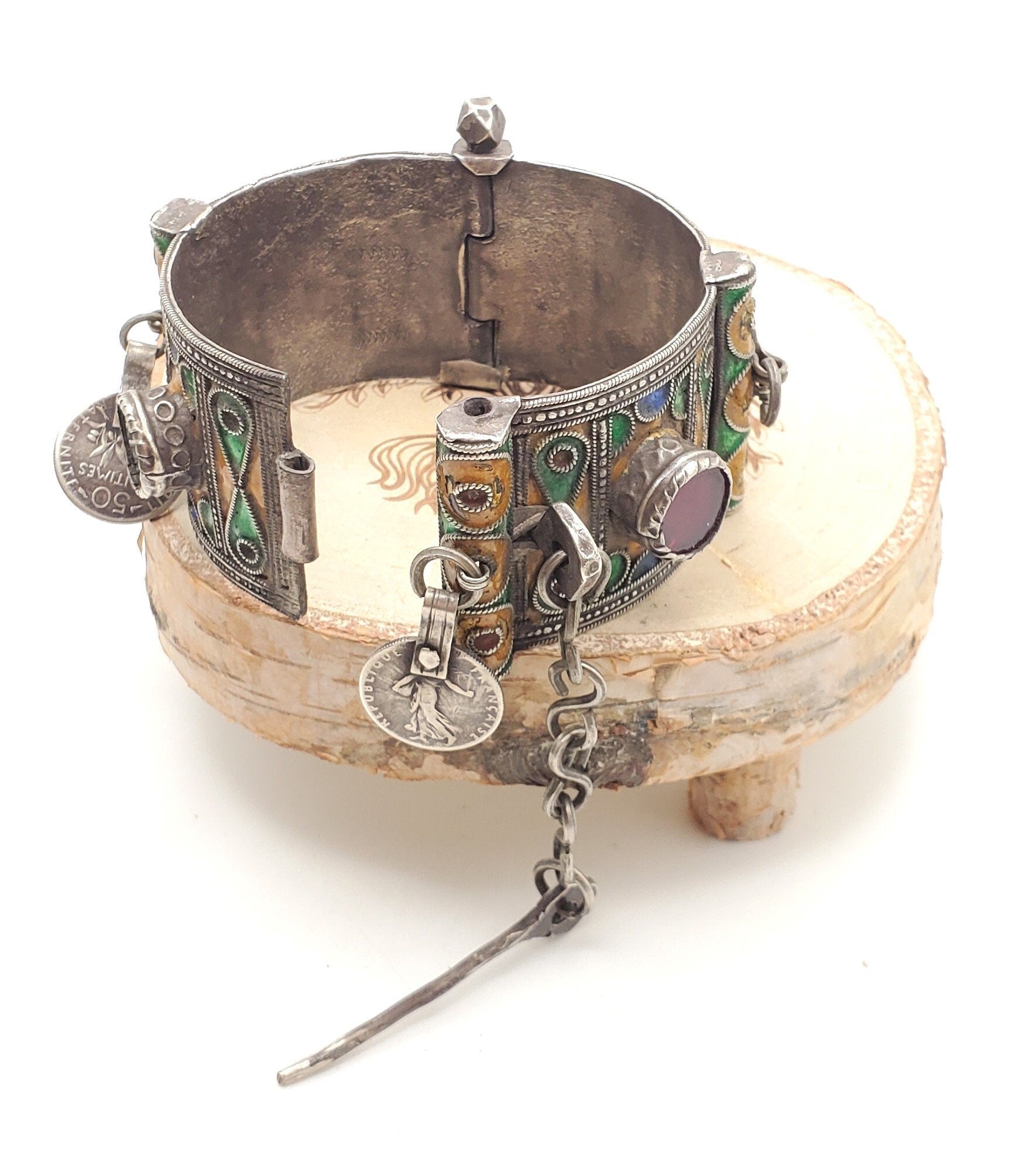 Antique Silver Moroccan Berber enamel Bracelet from Berber Tiznit, Morocco etched and decorated with silver enamel and with dark red glass inserts and Nice hefty clasp with safety chain from the Early 19th century.