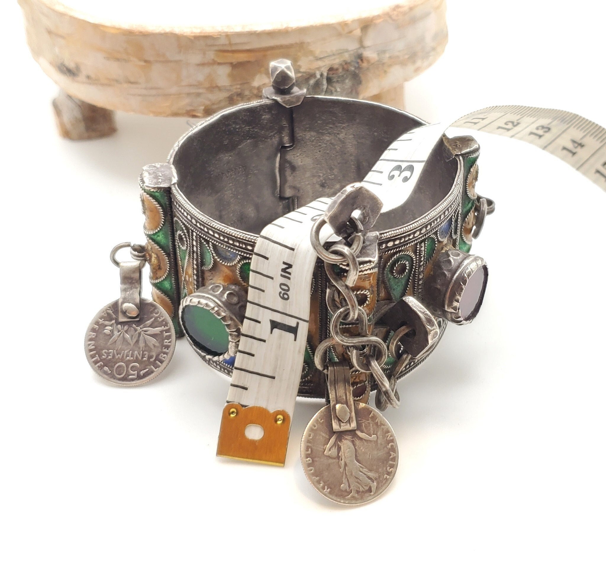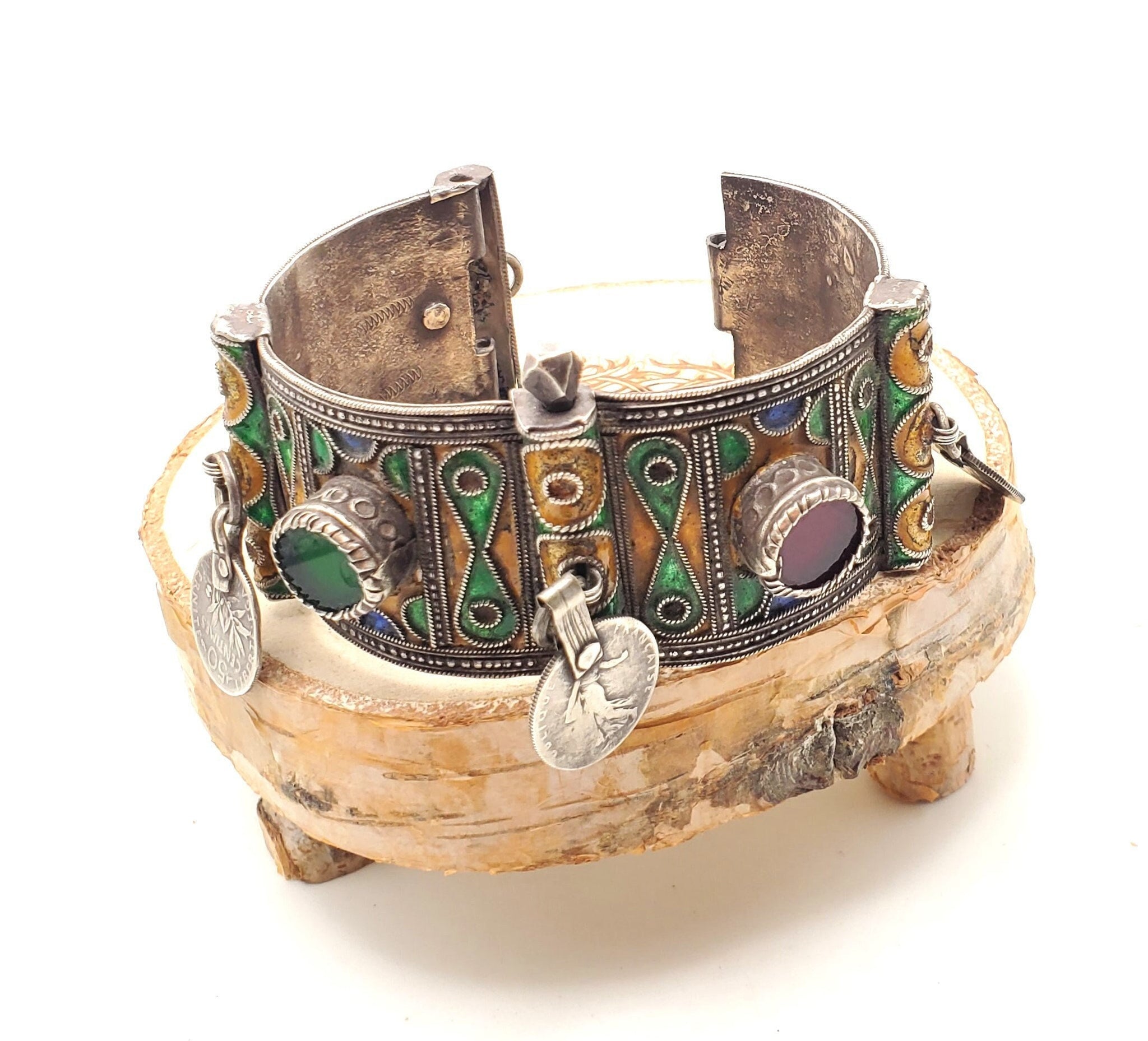 Antique Silver Berber Bracelet: Moroccan Enamel & Glass, Early 19th Ce