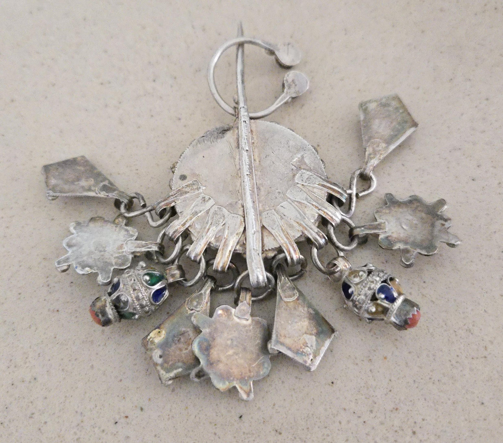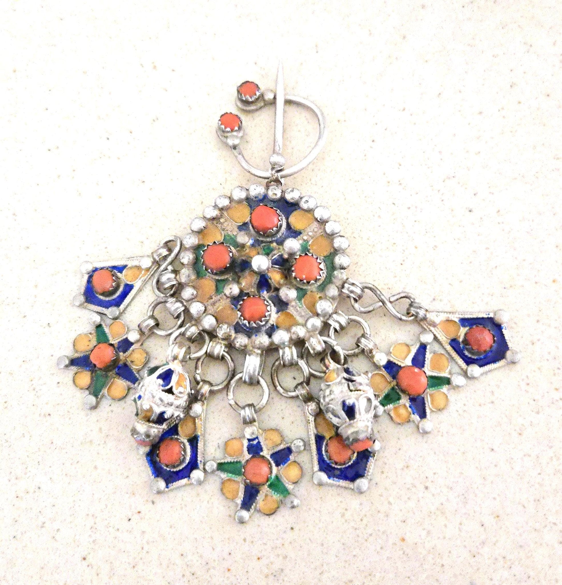 Old Antique Silver enamel coral Fibula Kabyle Pendant Silver from Algeria Pendant 1930s Traditional Kabyle silver work, with nice quality enamel coral work THIS IS BEAUTIFUL!! ADD A CHAIN AND YOU WILL HAVE A BEAUTIFUL AND UNIQUE PIECE .. coral Fibula Pendant features detailed enamel wirework (see the photos) . Hardly was worn. It was displayed. In a glass case Since the 30s. So it‘s. And. good condition.This jewel/brooch was worn on the chest.