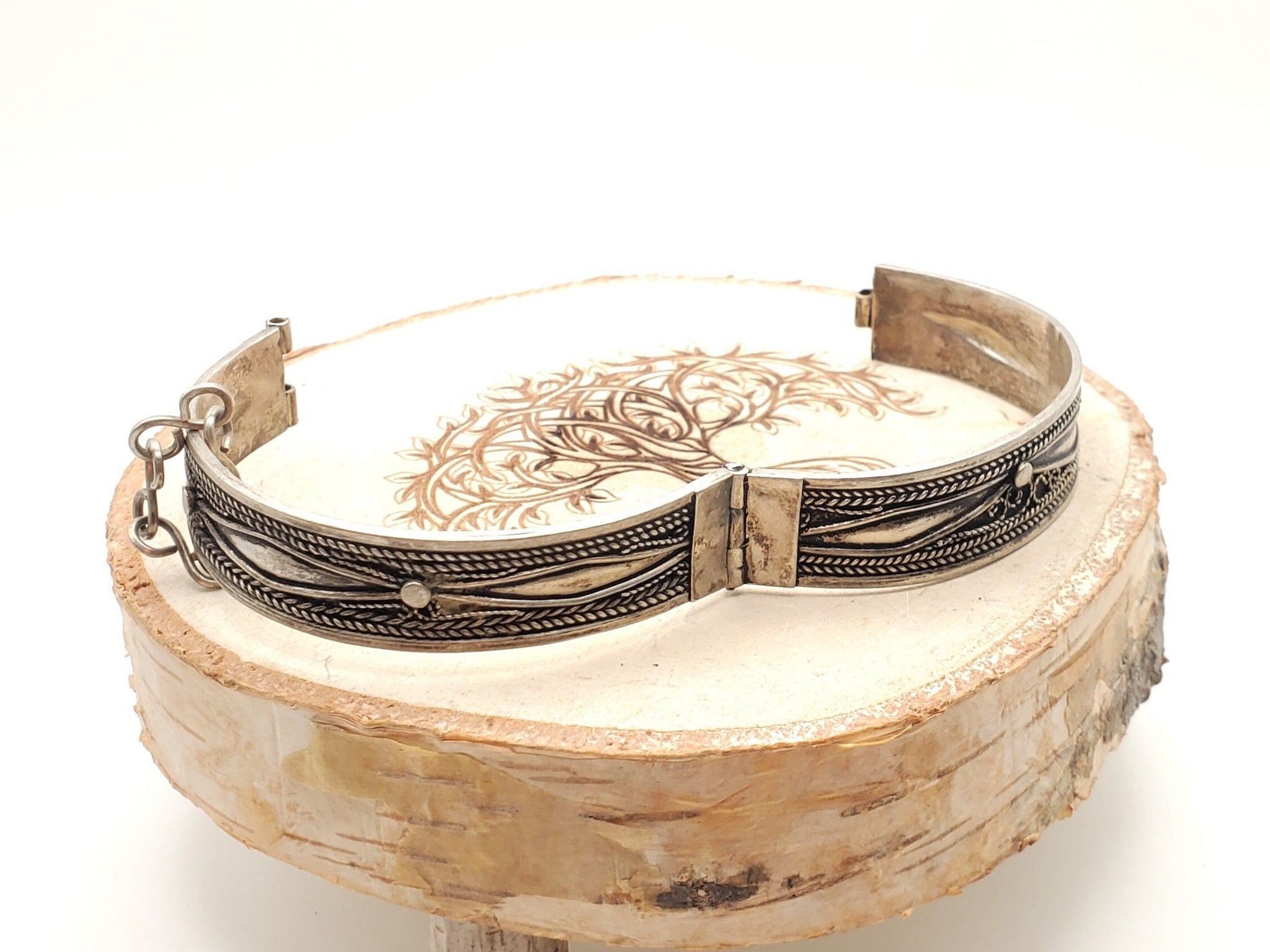 silver bracelet is a unique piece of Moroccan jewelry that showcases the intricate craftsmanship of the Berber tribe. traditional charm make it a timeless accessory that complements any outfit. The bracelet is made of fine sterling silver . This ethnic tribal bangle is a vintage item that is handmade in Morocco, making it an original and authentic piece of jewelry. Its features include ethnic, regional, and tribal themes, making it a perfect addition to any jewelry collection. This unisex bracelet is perfect for fashion enthusiasts who appreciate the beauty and elegance of antique jewelry. Measures just under 2‘‘.5 wide (at the widest) and has an inner diameter of just over 7‘‘x.22mm 40gr The bracelet is in excellent condition feature detailed wire-work high grade alloy of silver with wonderful wear