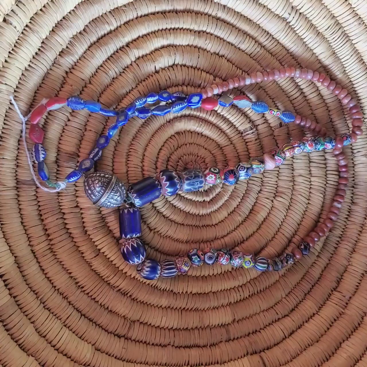 Beautiful Strand Large Silver Bead form 20th century, Rare and Antique 7 Large Chevron Venetian Trade Beads Seven Layer Venetian and Multiple Cane Millefiori Oval beads and Venetian Millefiori Round Beads W/ Multiple Cane Inserts and other Trade beads chevron and Kiffa Beads Agate Beads These beads are beautiful. The coloration is unique. These beads are rare, Hard to come by It was used in the African trade in the late 1800‘s These are called Millefiori chevron Kiffa Agate Beads wear in Africa. Made in Venice, traded in Africa. 1800‘s. beads are in very good condition.These Old glass beads from Africa. These beads are quite irregular. Please expect some imperfections in size and shape.A beautiful strand to add interest and texture to any jewellery.Each bead is unique, color, pattern of dots, and size. Approximate Product Specifications: Name: Large Silver Bead Millefiori beads chevron beads Kiffa beads Agate beads Strand:43‘‘ Material: Glass Origin: Venice Italy. African Traded