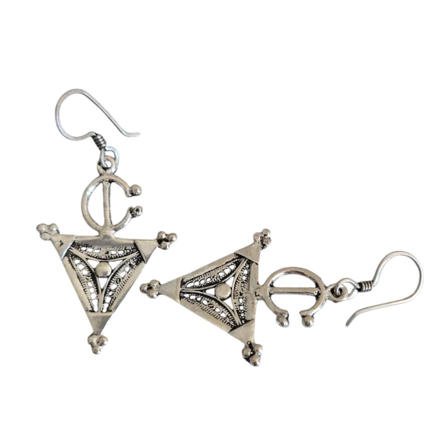 Moroccan Berber Filigree Sterling Silver Dangle Earrings This is a great authentic Filigree jewelry from Morocco. Each earring measures just over 2" long and just under 1‘‘ wide./ 11.gr The workmanship is wonderful .These earrings were hand made sterling silver 925 new high-silver content if you have any questions - Feel free to contact me. . Thank you for visiting my shop All my jewelry has been collected over 20 years ago .I will be listing more pieces shortly as I am constantly always working on posting more. piece to add to the collection .I ship all over the world and price includes a tracking service.