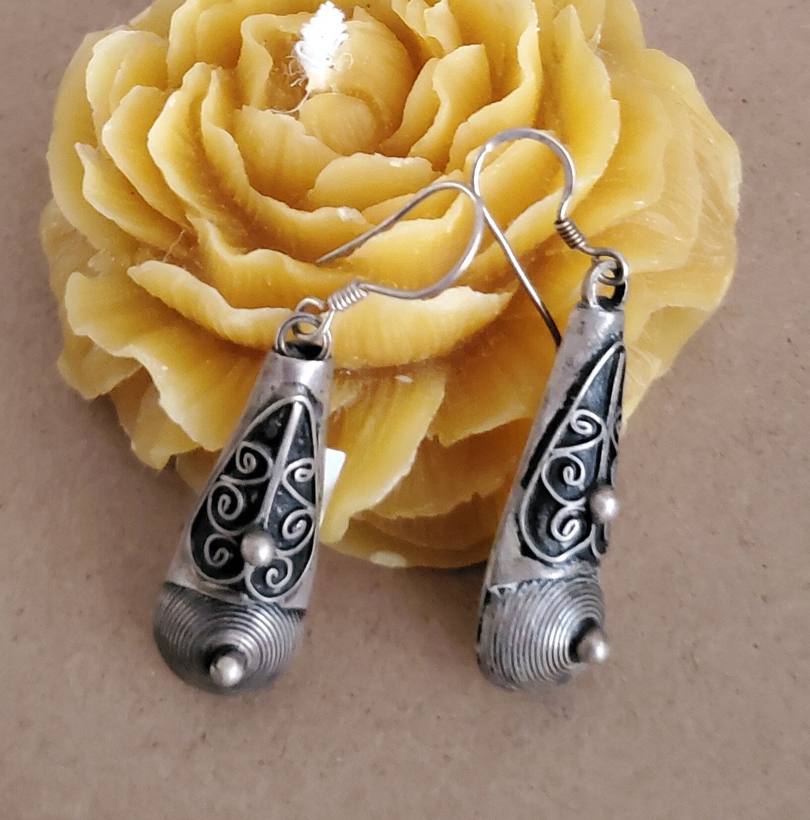 Moroccan Berber Sterling Silver Dangle Earrings This is a great authentic jewelry from Morocco. Each earring measures just over 2" .5 long and just under 1‘‘ wide./ 8.gr The workmanship is wonderful .These earrings were hand made sterling silver 925 if you have any questions - Feel free to contact me. . Thank you for visiting my shop All my jewelry has been collected over 20 years ago.I will be listing more pieces shortly as I am constantly always working on posting more. piece to add to the collection.I ship all over the world and price includes a tracking service........africanbazaarus.com