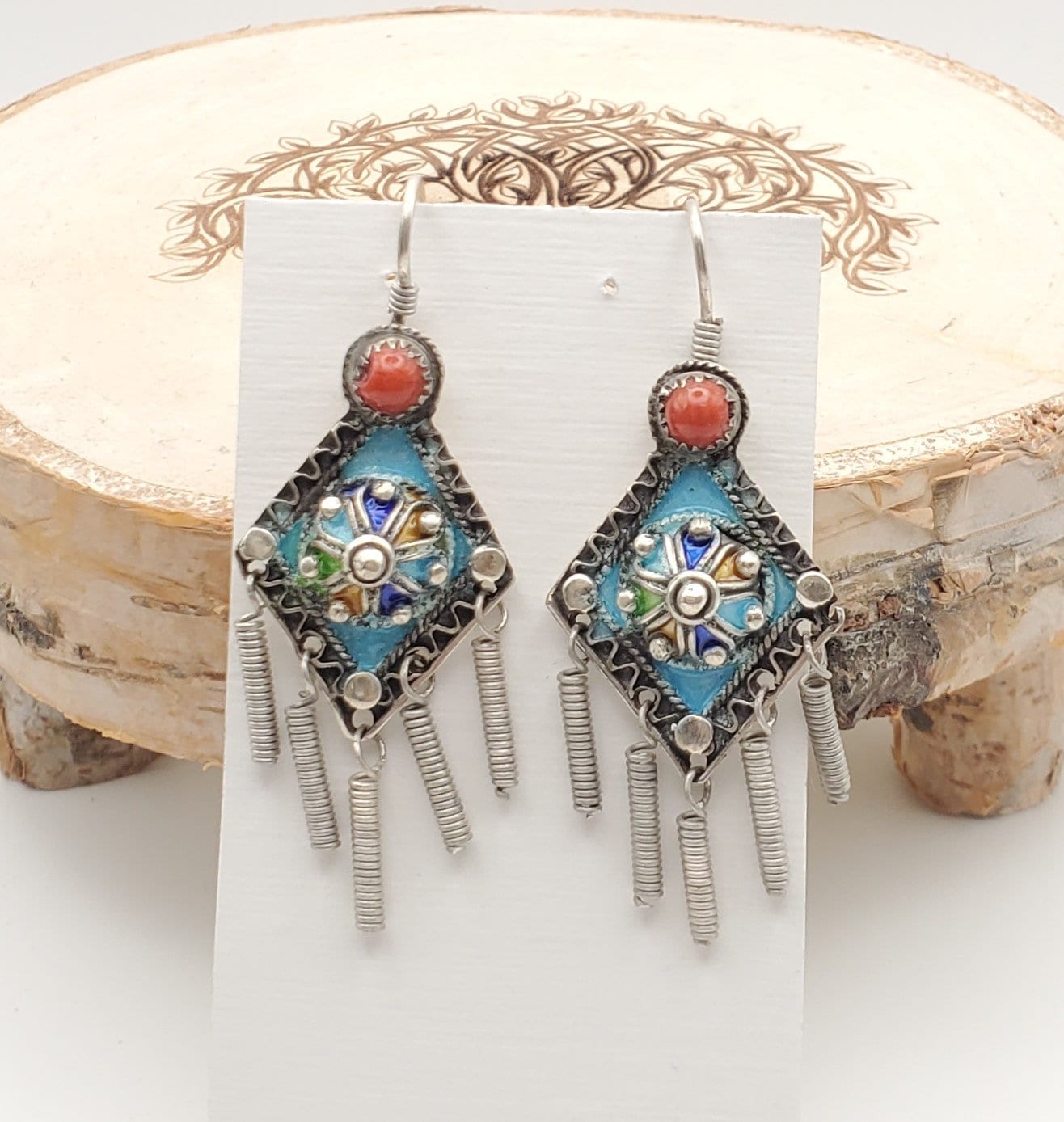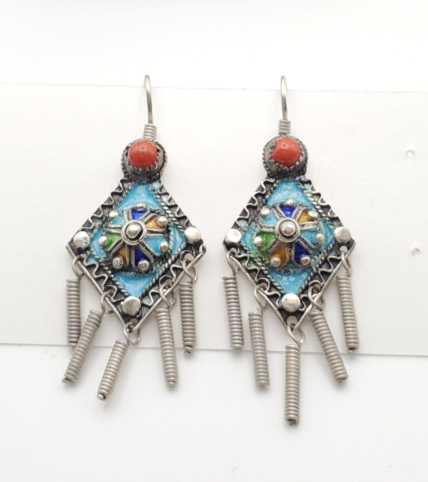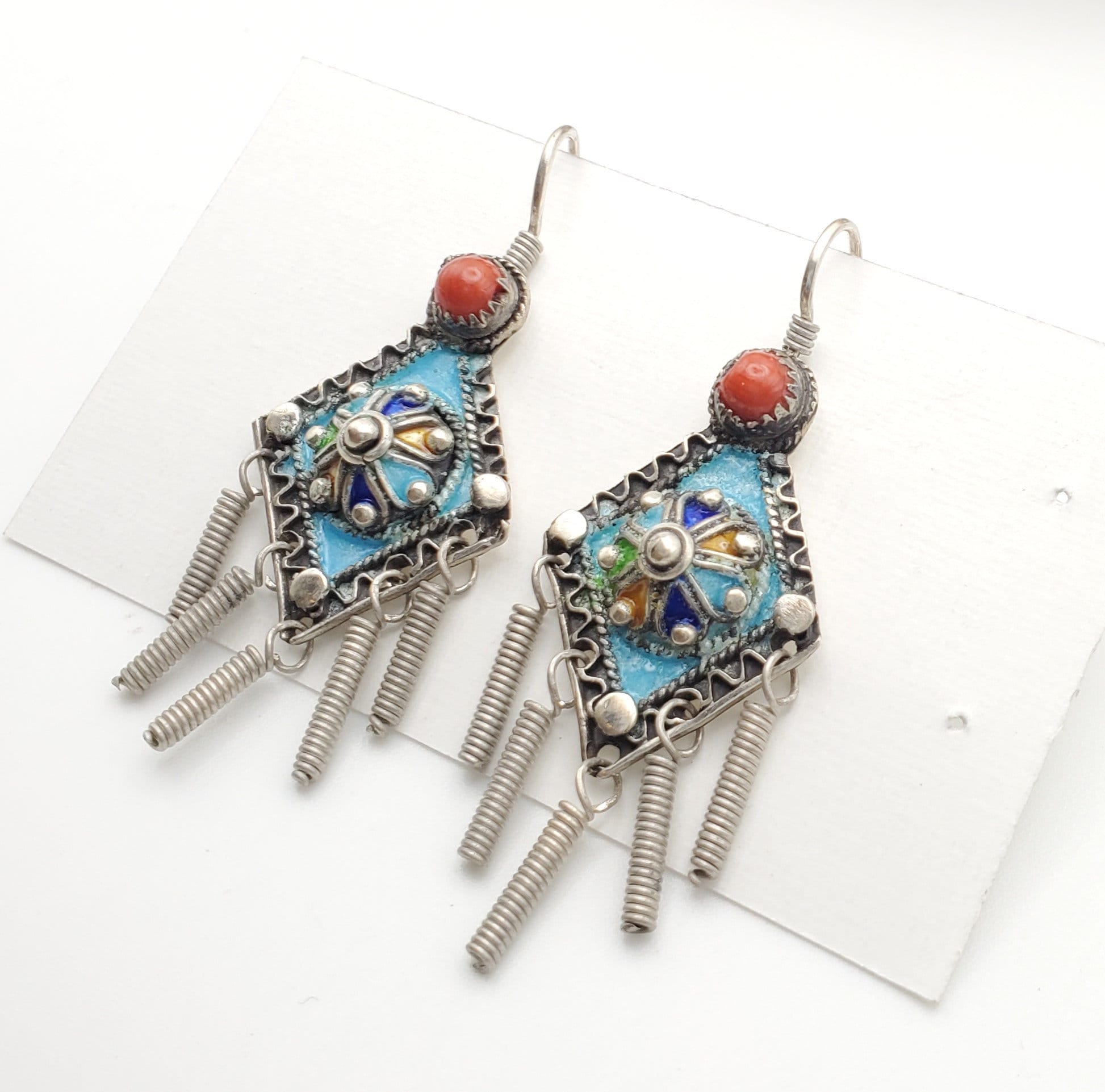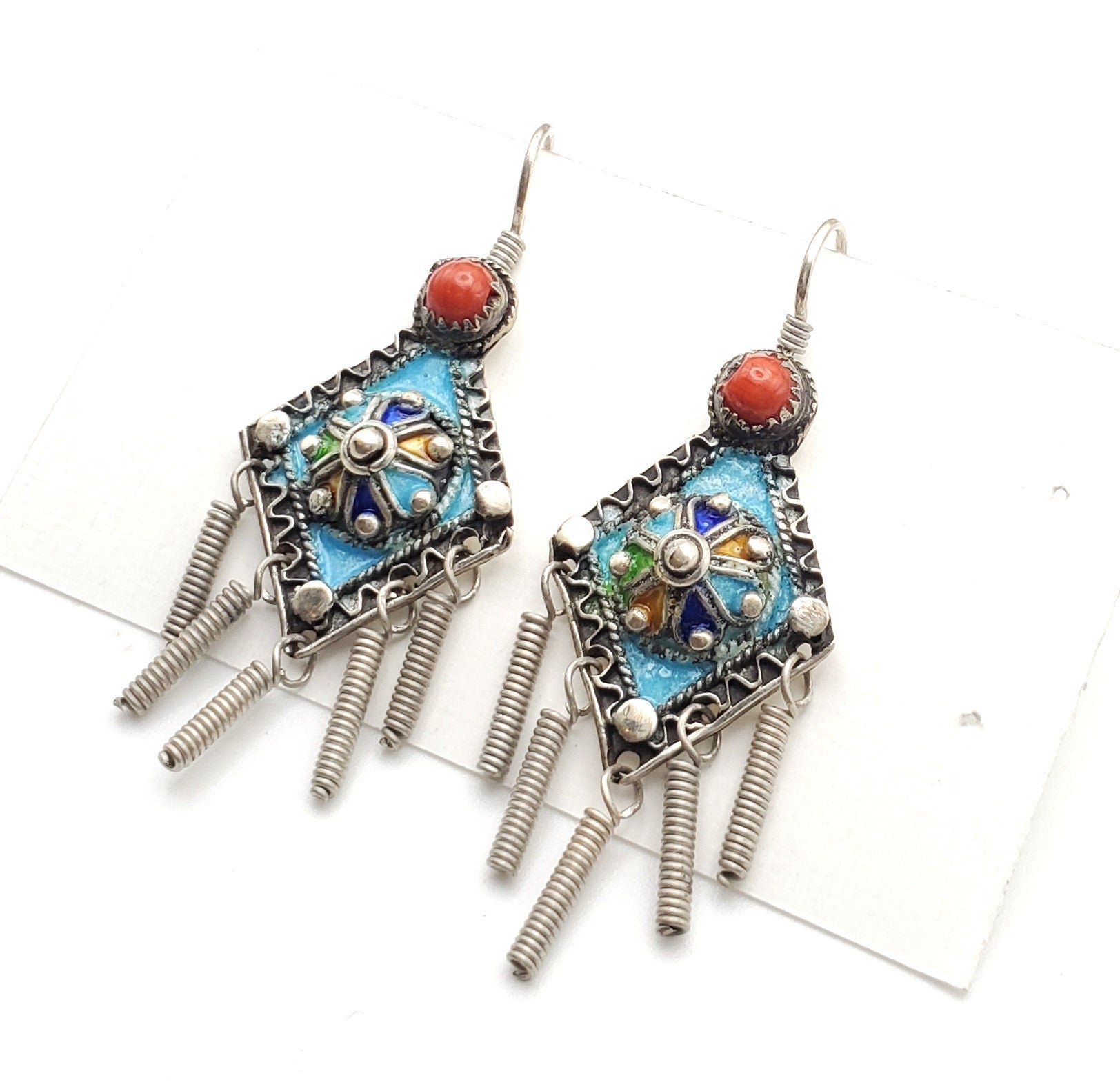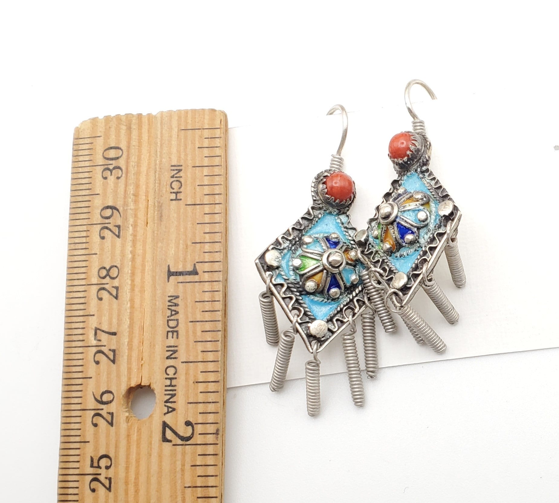 Moroccan Berber Dangle Earrings with enamels & Coral Sterling Silver red coral This is a great authentic jewelry from Morocco. Each earring measures just over 2.5" long and just under 1''.5 wide./ 20.gr The workmanship is wonderful .These earrings were hand made sterling silver 925 new high-silver content if you have any questions - Feel free to contact me. . Thank you for visiting my shop All my jewelry has been collected over 20 years ago .I will be listing more pieces shortly as I am constantly always working on posting more. piece to add to the collection .I ship all over the world and price includes a tracking service.
