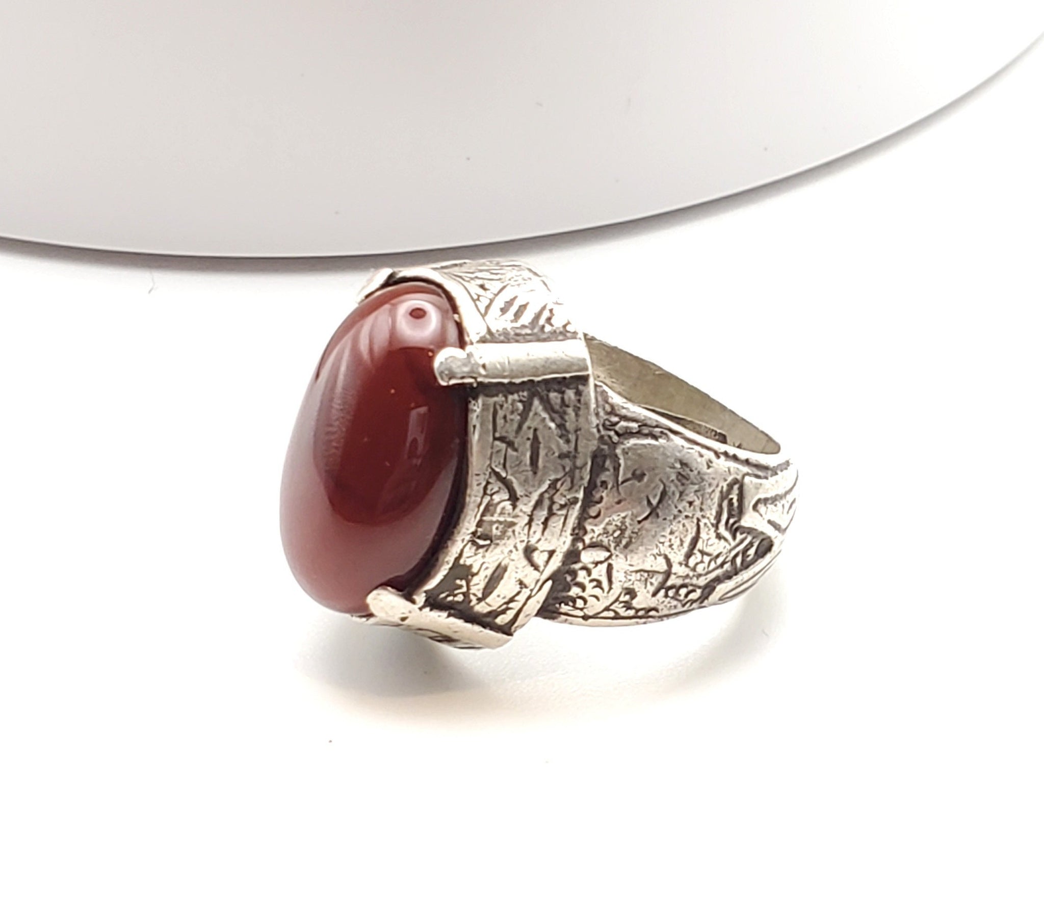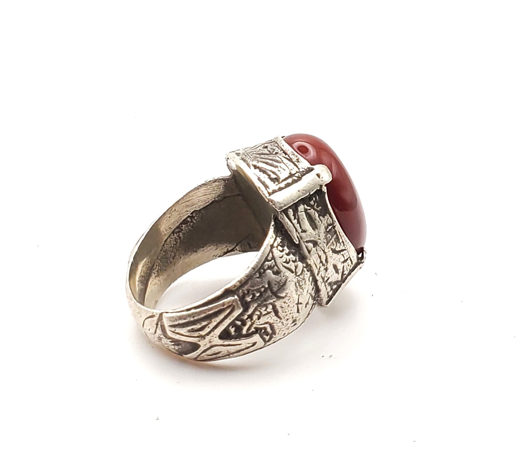 old Engraved Ottoman Silver Carnelian Intaglio Ring Ancient Carnelian ring from the Turkish Ottoman highly decorated ring for the age.