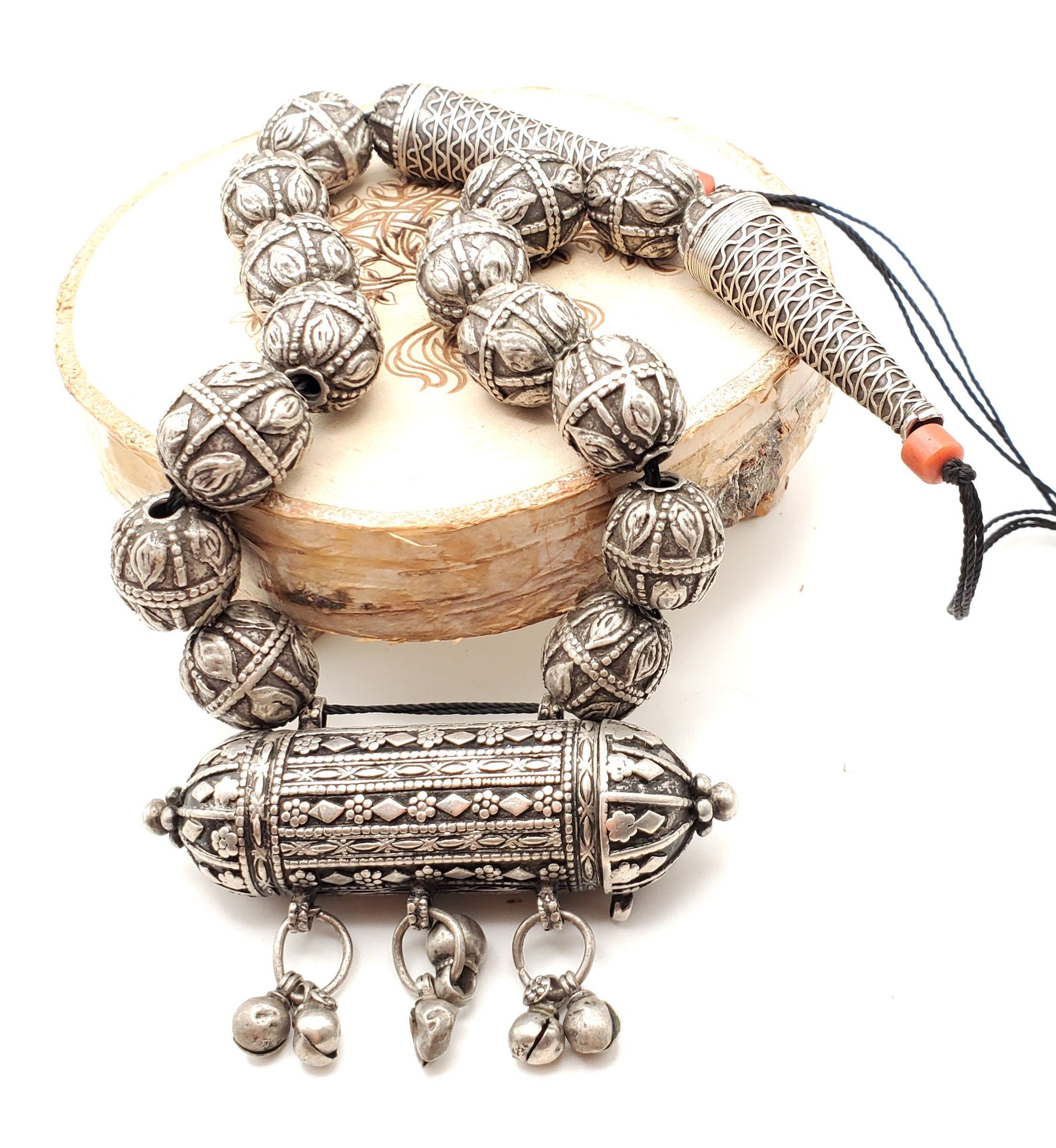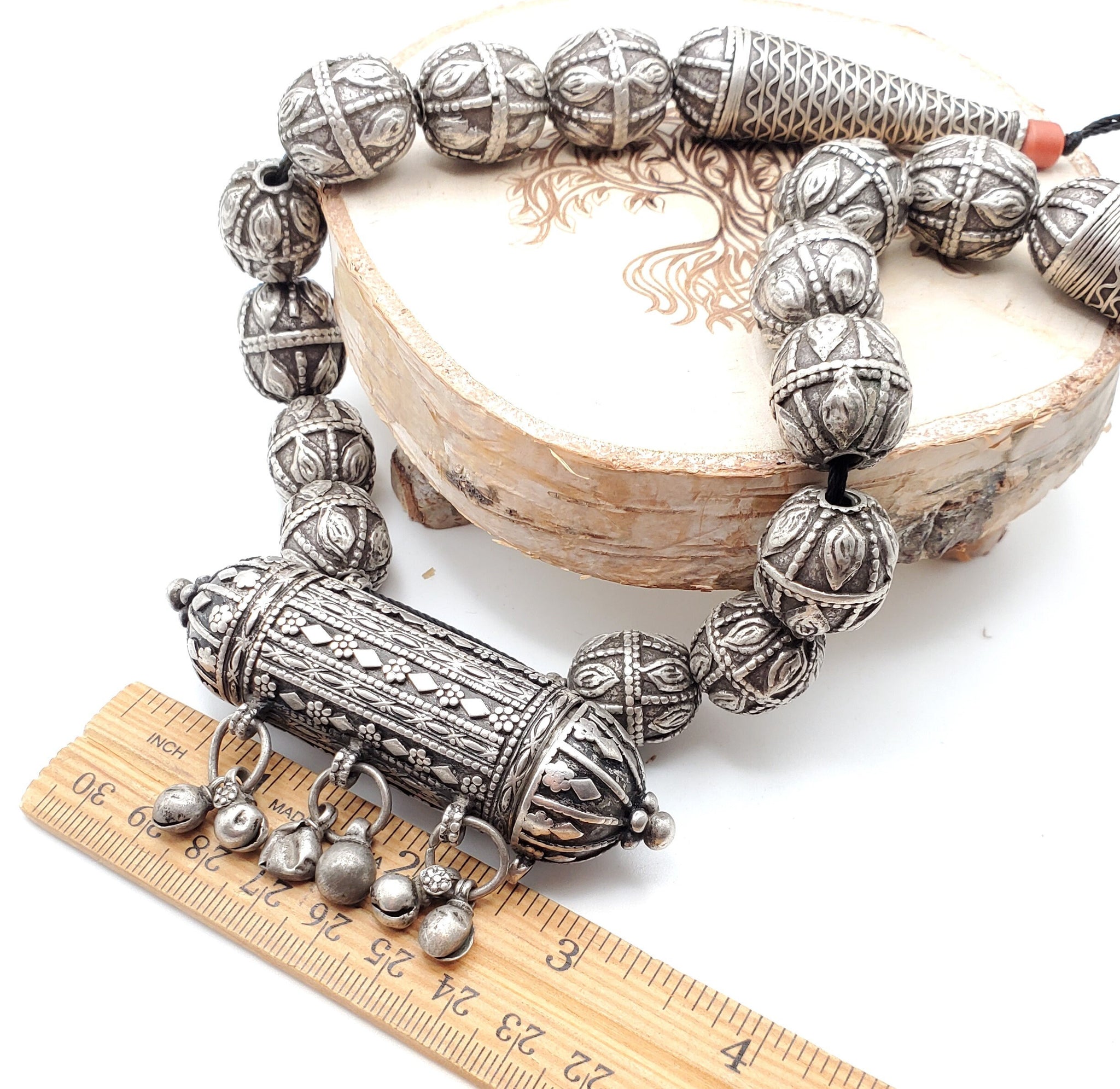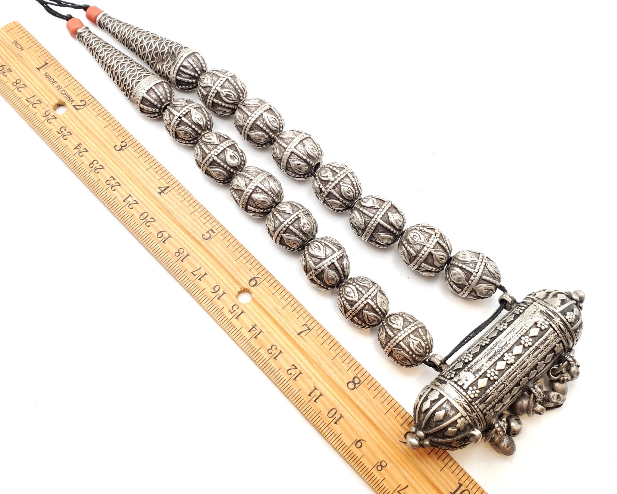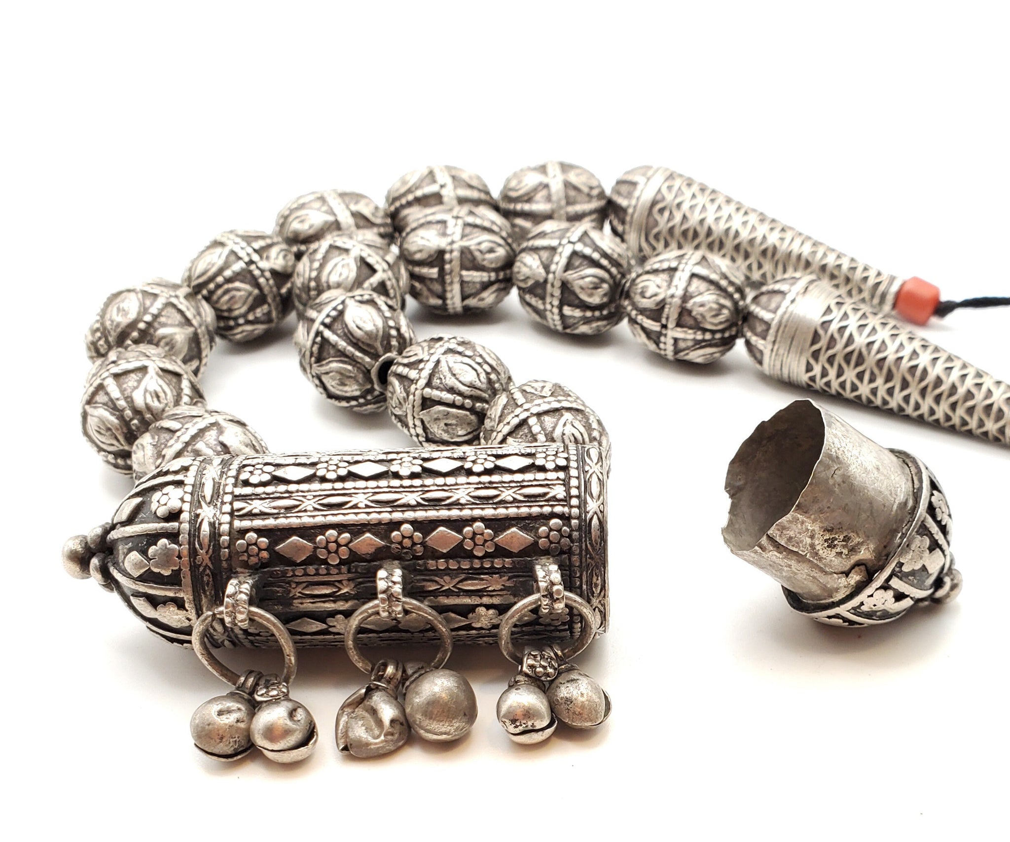 16 old silver Globe granulation hallmarked Hirz beads Necklace from Yemen Bedouin tribal circa 1930s. Rare with intricate silver smiting Beautifully made, decorated shaped. Prayer amulet pendant. It is in excellent condition. This amulet opens and uses to put a quote or verse from the Koran/Quran inside Good alloy of silver. Old pieces with beautiful patina, This kind of ones. Good condition Collectible and useful as jewelry supplies