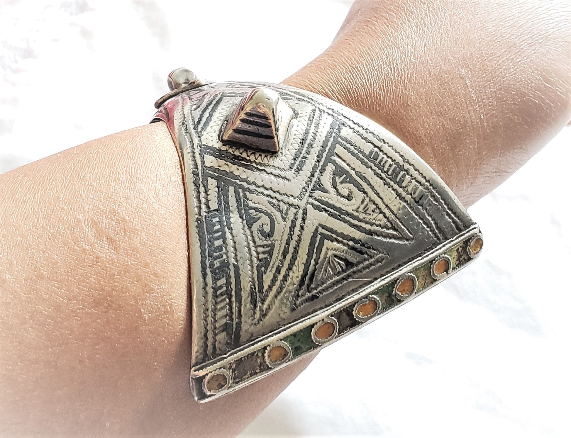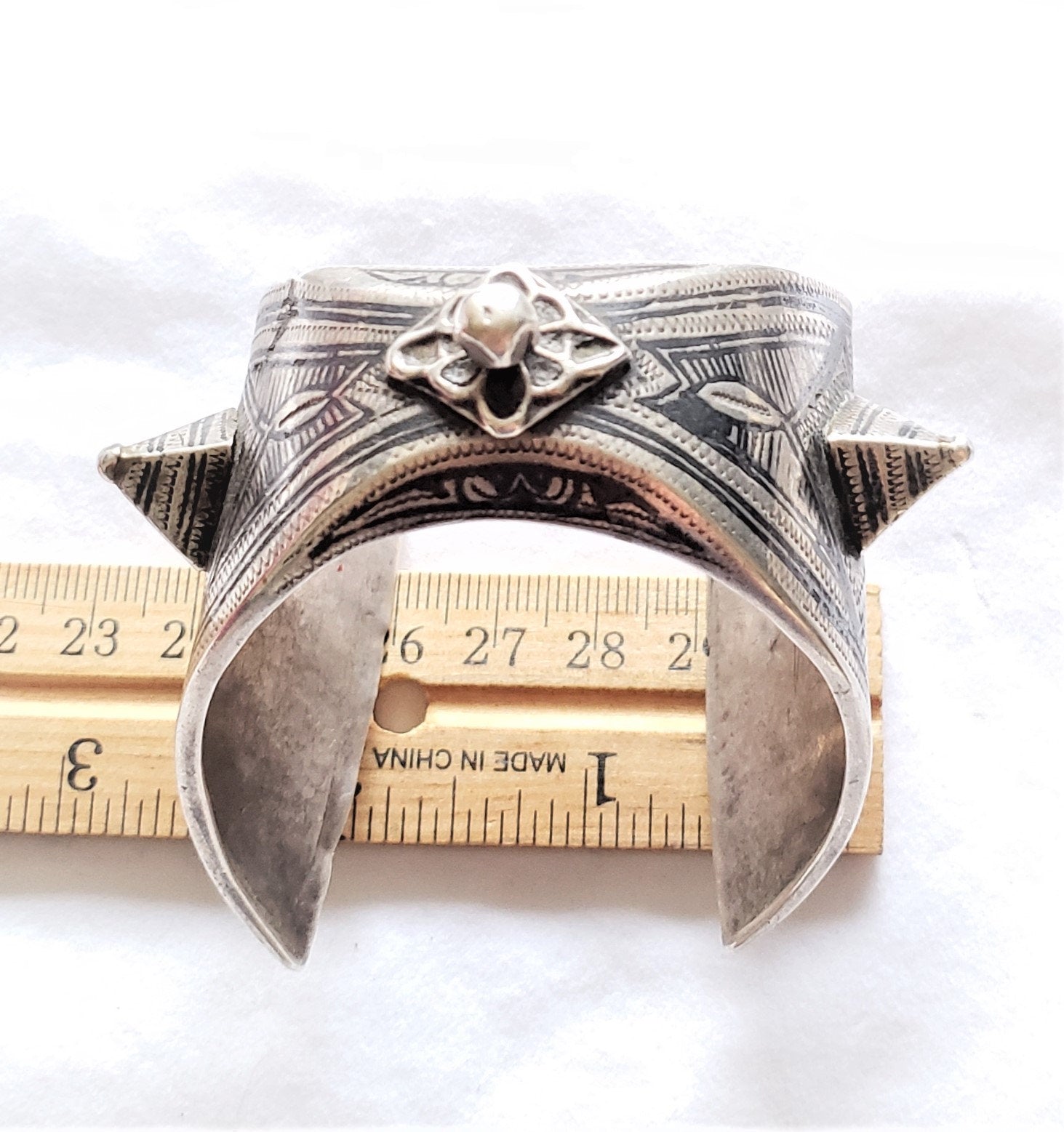 from Southern Morocco. measures just under 2".5 at the widest, flared section and its inner diameter is just abut 6" with a gap of 2'' wide 55.gr/ The bracelet features lovely niello and incised designs, 3 "spikes" and Enamel "feature detailed wire-work high grade alloy of silver with wonderful wear The Berbers are among the original peoples of North Africa. Their myths. Legends and history span 9,000 years, back to the Porto-Mediterraneans. They have achieved unity by keeping up their unique language and culture which are, like their land, both African and Mediterranean. other shop https://www.etsy.com/shop/Africanbazar2US?ref=seller-platform-mcnav