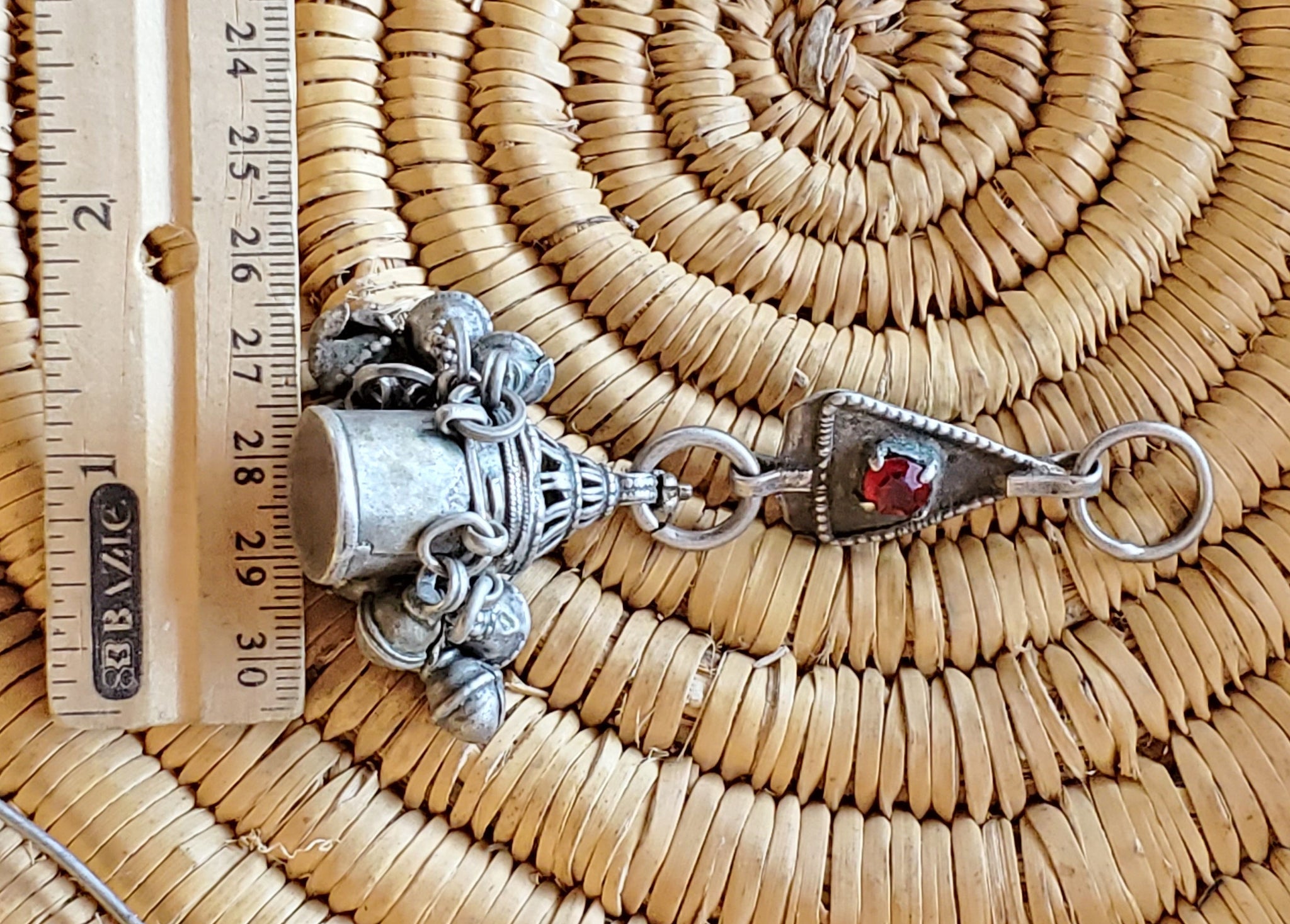 antique Moroccan silver chased box pendant with silver dangles and red in green glass cabochon beads.