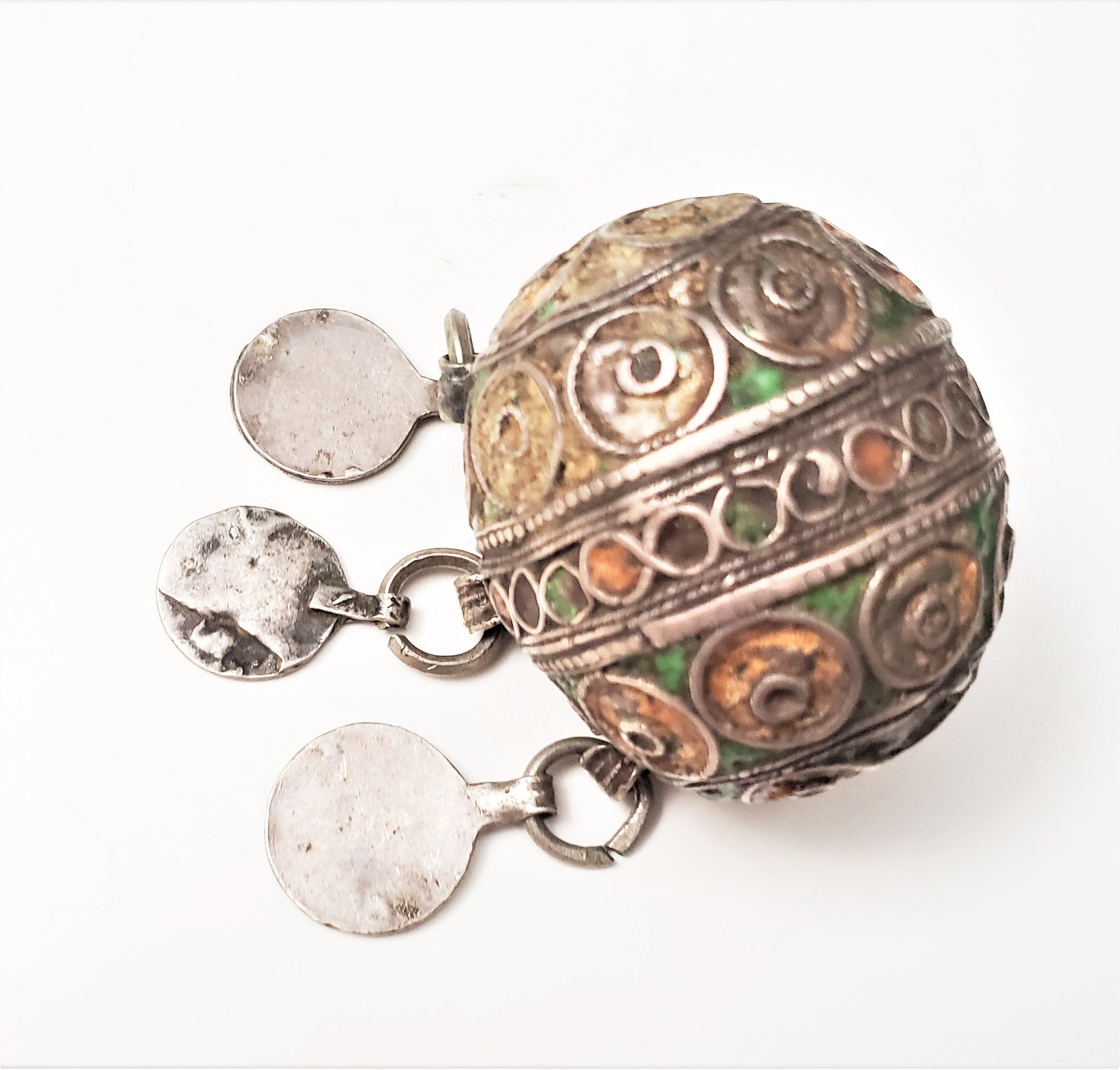 Antique Moroccan Enameled Silver Ball Pendent with 3 silver Enameled Pendant Ball Pendent from Southern Morocco The silver ball come across Ornate patterns and top of the line workmanship. ! Weighs 59 grams and measures about 2".2 x 2".2 See the pictures for size comparison. The coins including the rings are about 1" additional in length. Definitely a collector's piece! great condition with age and use. other shop https://www.etsy.com/shop/Africanbazar2US?ref=seller-platform-mcnav