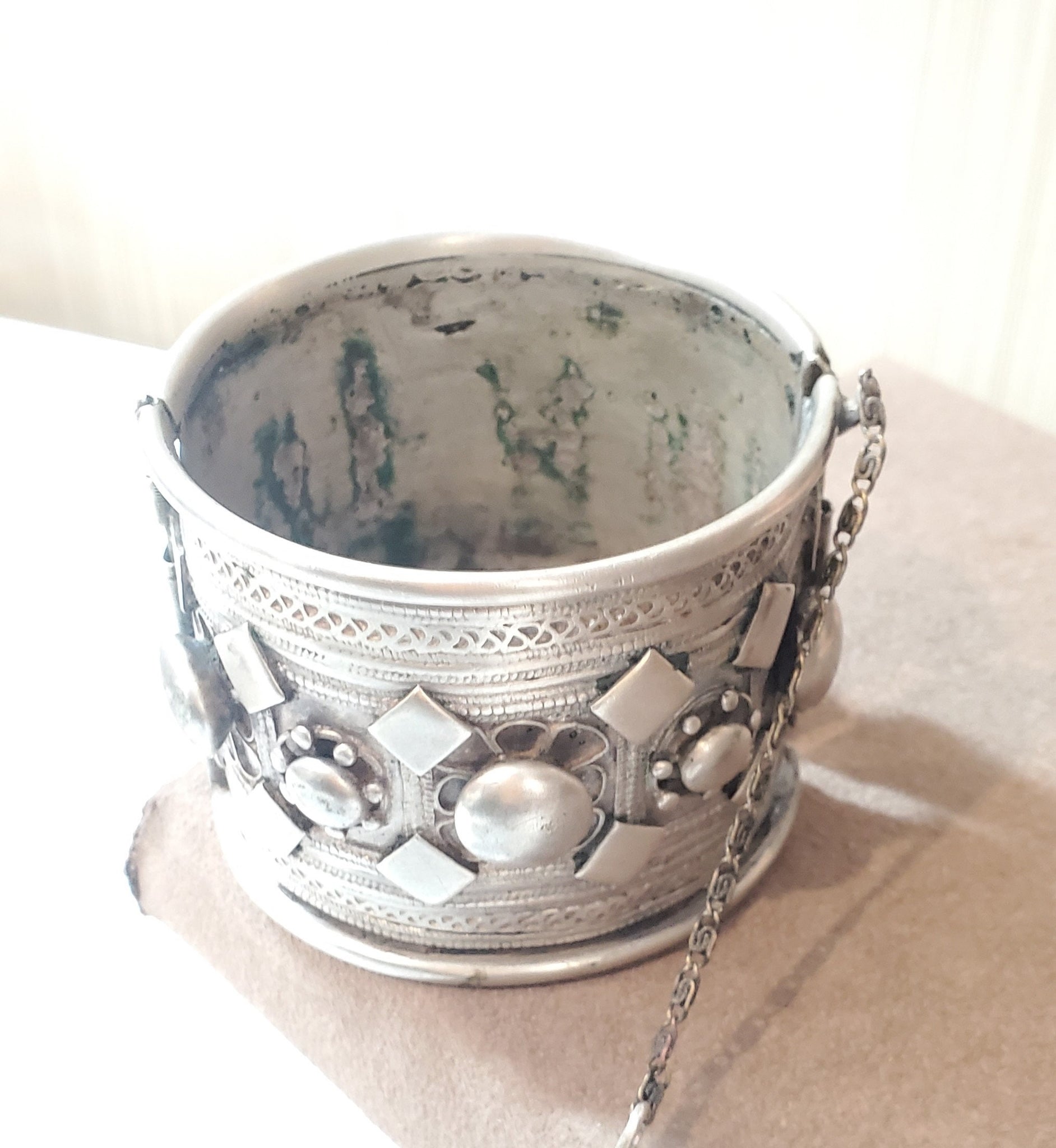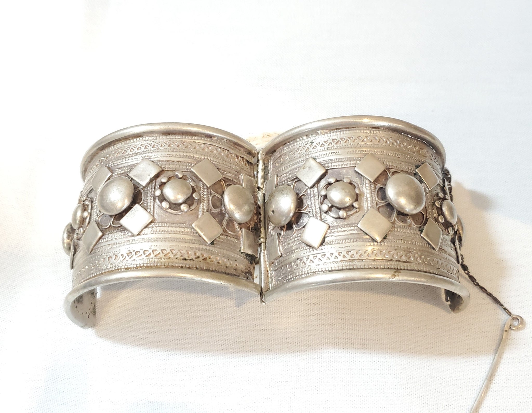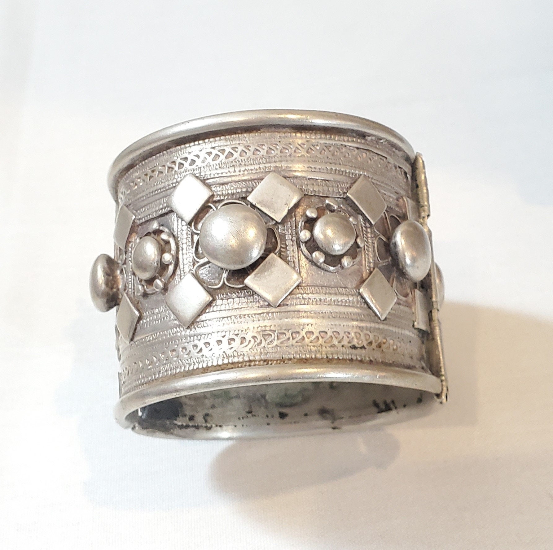 Antique Stunning, single Ethiopian Cuff made of 100 year old coin silver. well handmade piece, It closes easily and perfectly with pin closure high grade silver done by highly skilled silversmith really looks much better than the pictures is a heavy silver bracelet Beautifully detailed and decorated made of good silver Wonderful to wear or highly collectable. If you need more detailed photos please feel free to ask .Weight:140 Grams. Measures approximately Height: 2"5 Circumference: 8" Inner diameter: 2".5 with hinge and pin closure 2".5 long Age:From the first half of the 20th Century. The bracelet is in its original condition except for the aging and the wear, that gave the bracelet this wonderful patina. This beautiful piece of silver was created for a Ethiopian woman before the 1940s rare This piece can be purchased on a lay-away plan that works for you Contact me for more information.Thanks for your support and feel free to message with any questions!.......africanbazaarus.com