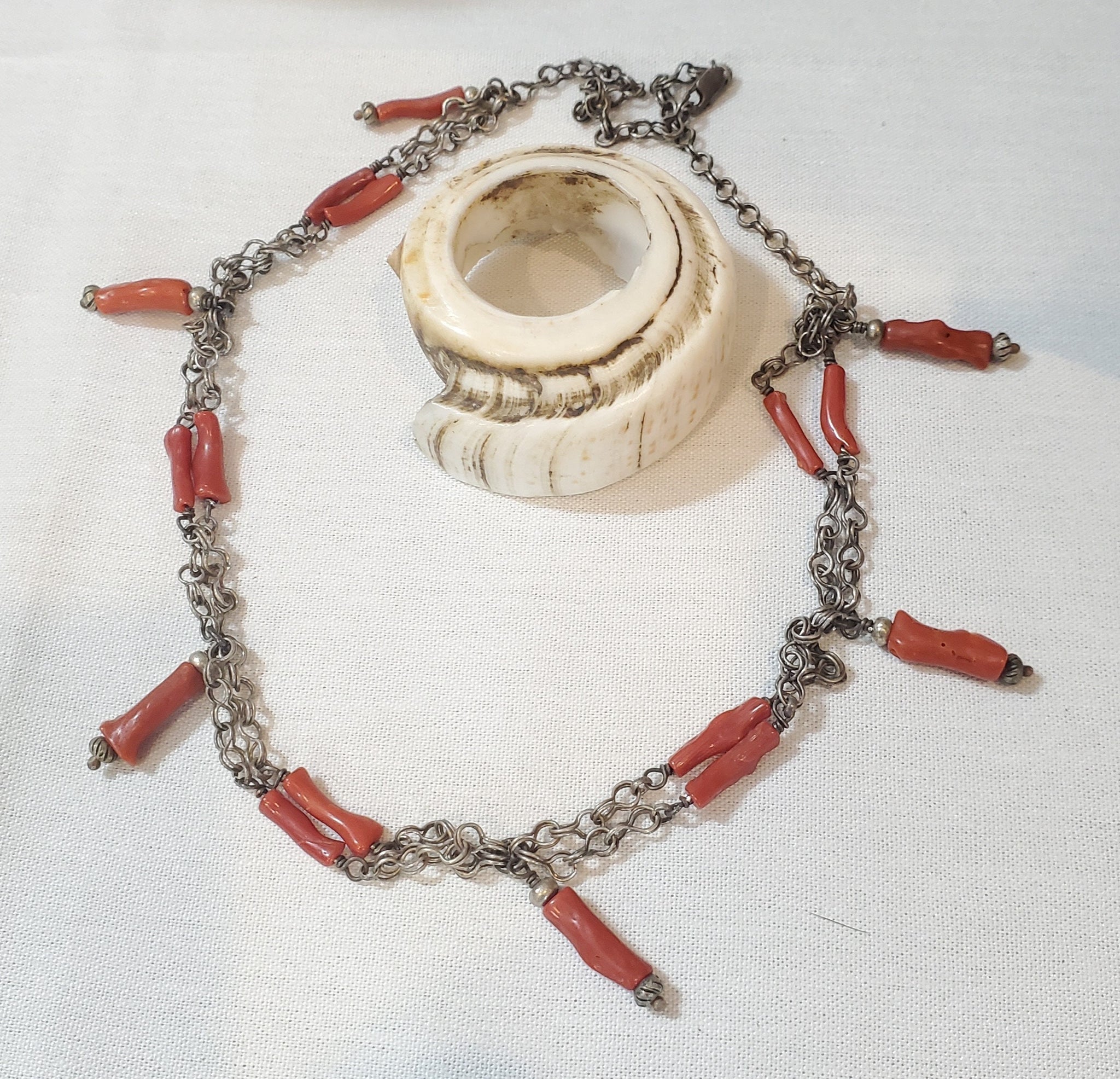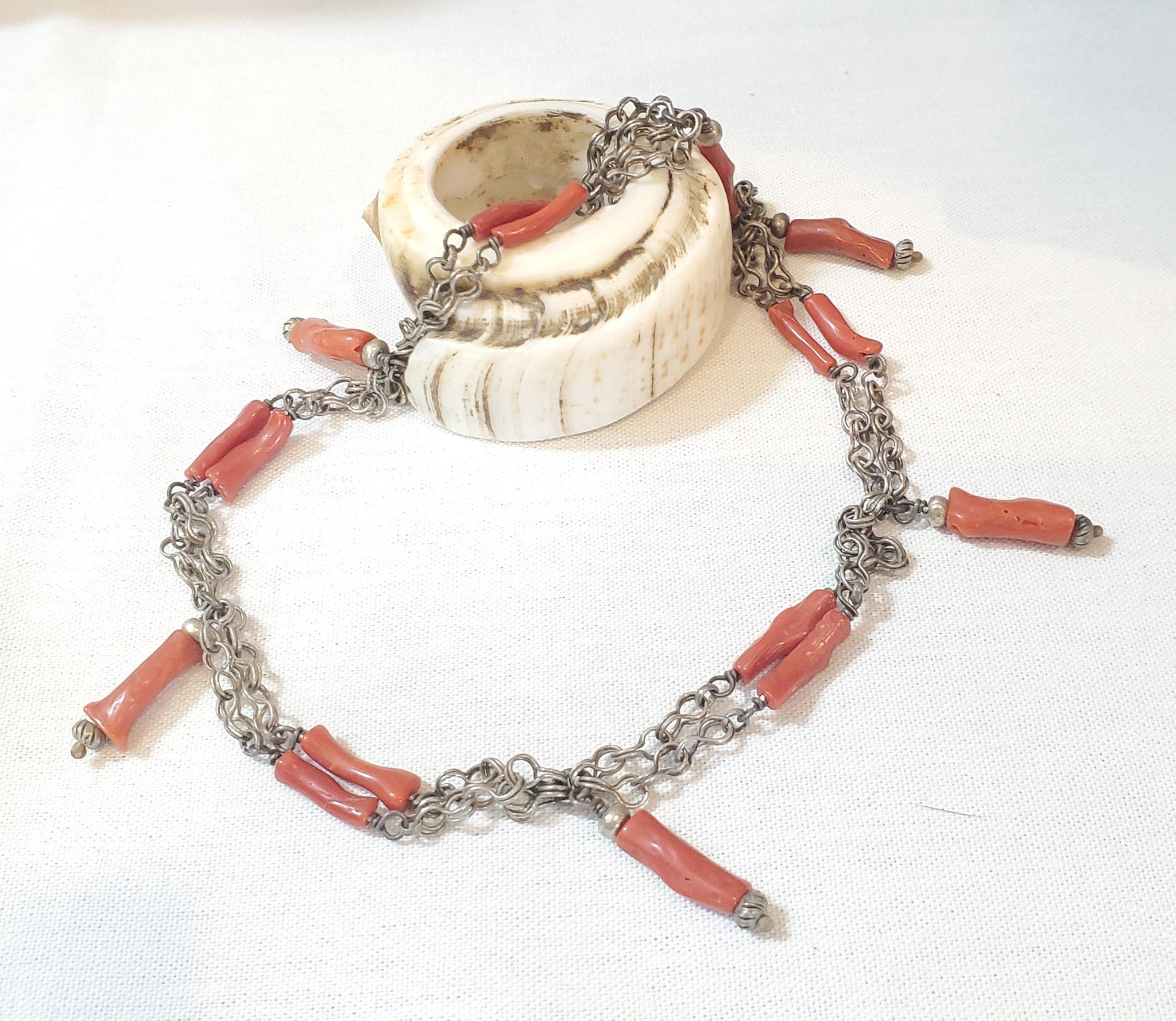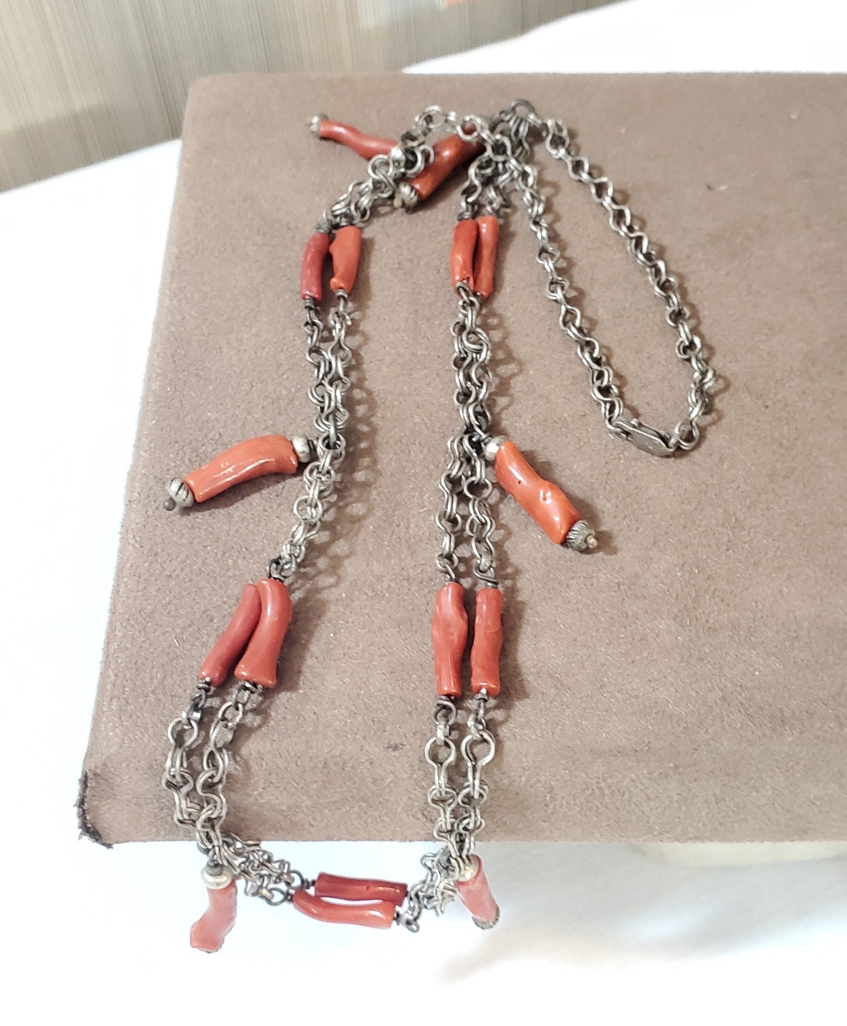 unique Antique Moroccan Berber natural Coral Silver Pendants Necklace with old handmade natural Coral. from Moroccan Berber first half of XX century the total length of the necklace is good condition (see pictures). Collectible. Measures: a little over 20" x 20mm x 1''in. from top of loop to bottom.