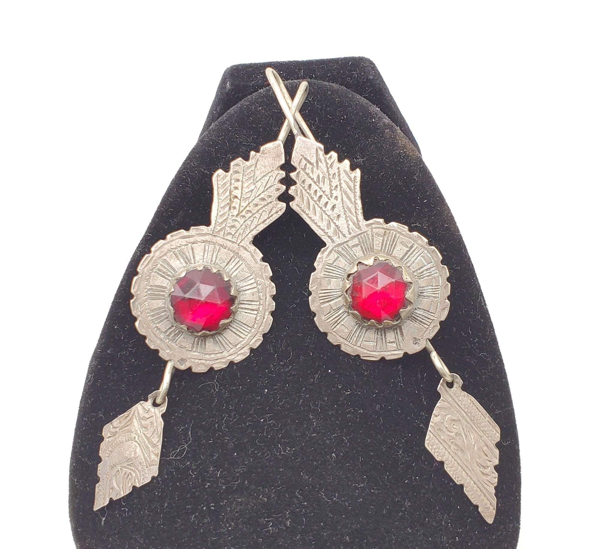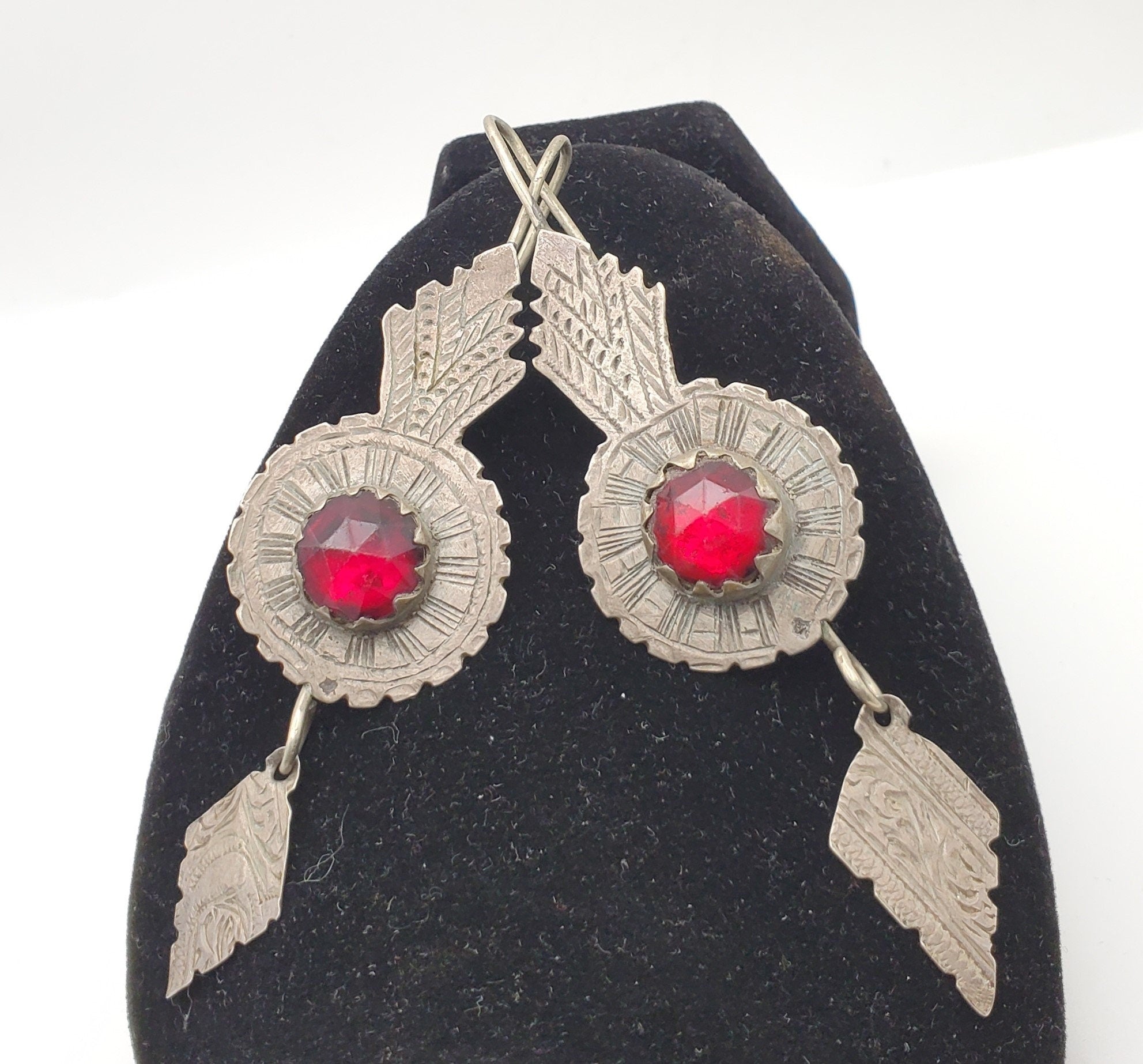 Antique Old Berber Earrings Silver with red Glass Talhakimtold from Southern Morocco Earring are traditional Berber silver work, rely good quality work YOU WILL HAVE A BEAUTIFUL AND UNIQUE PIECE OF HISTORY. IT DATES FROM THE - EARLY 1900'S.It measures approximately 3" long in 1''.5 wide.Weight 15 gr Earring features detailed enamel wire-work (see the photos) It is in good condition with age and use. other shop.....africanbazaarus.com