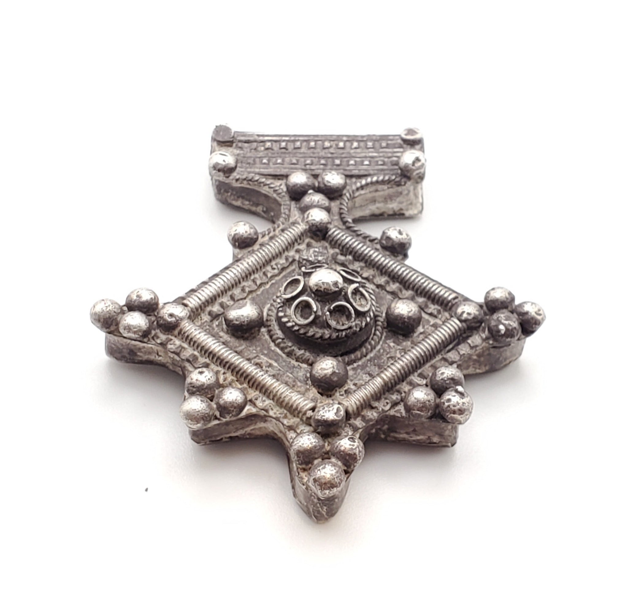 Antique Moroccan handmade Silver Berber Cross Pendant from Southern Morocco THIS IS AN ANTIQUE PENDANT THIS IS BEAUTIFUL!! ADD A CHAIN AND YOU WILL HAVE A BEAUTIFUL AND UNIQUE PIECE OF HISTORY. IT DATES FROM THE LATE 1860'S - EARLY 1900'S. .It measures approximately 3"long in 2'' wide.30 GR The pendant features detailed wire-work (see the photos) It is in good condition with age and use. and somewhat dented (see photo).......africanbazaarus.com