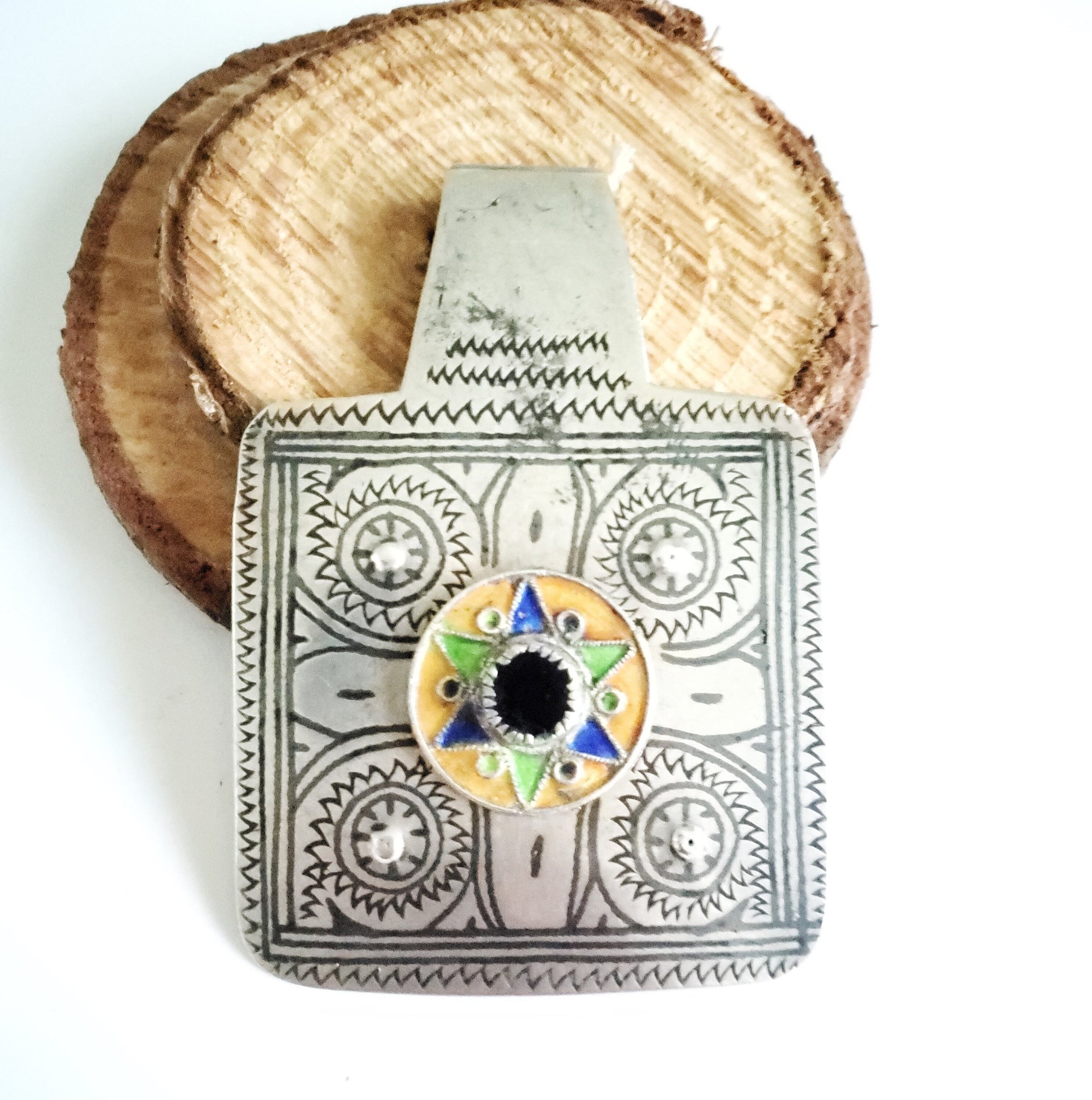 Antique Moroccan Silver Enamel and Glass cabochon Berber Pendant, Berb