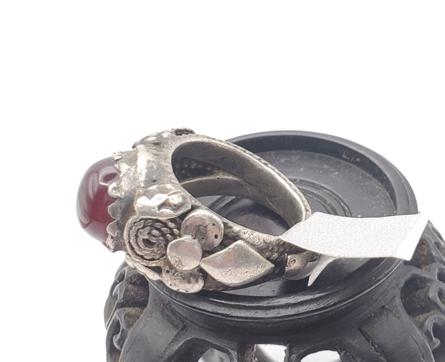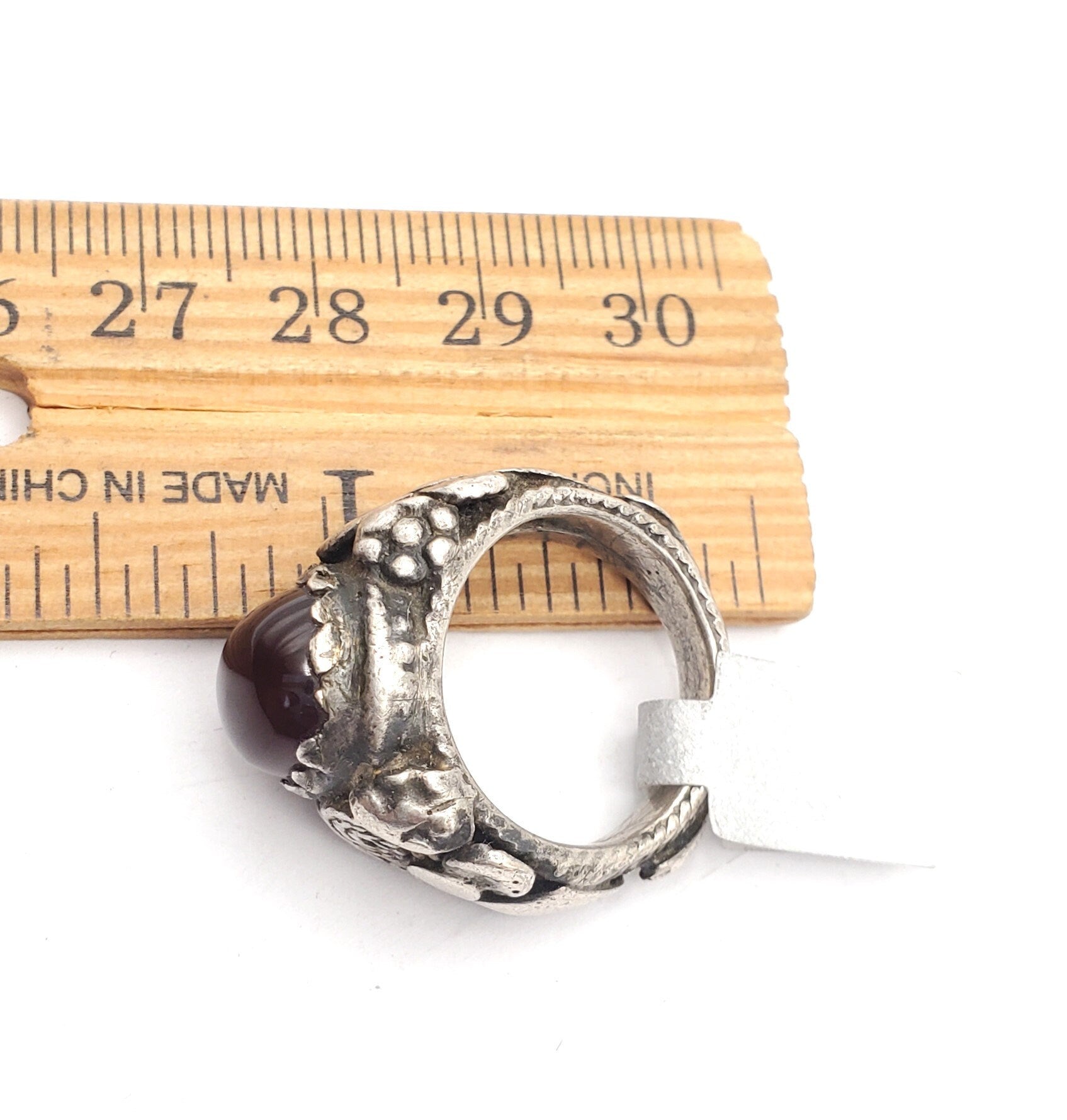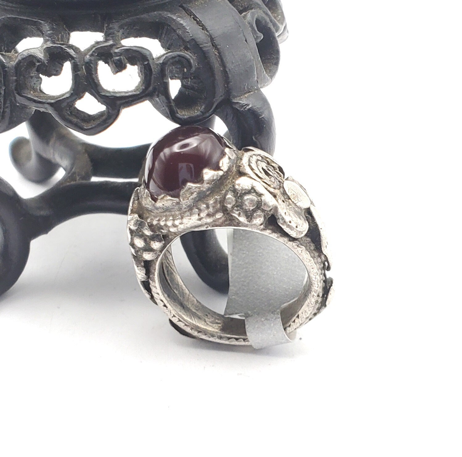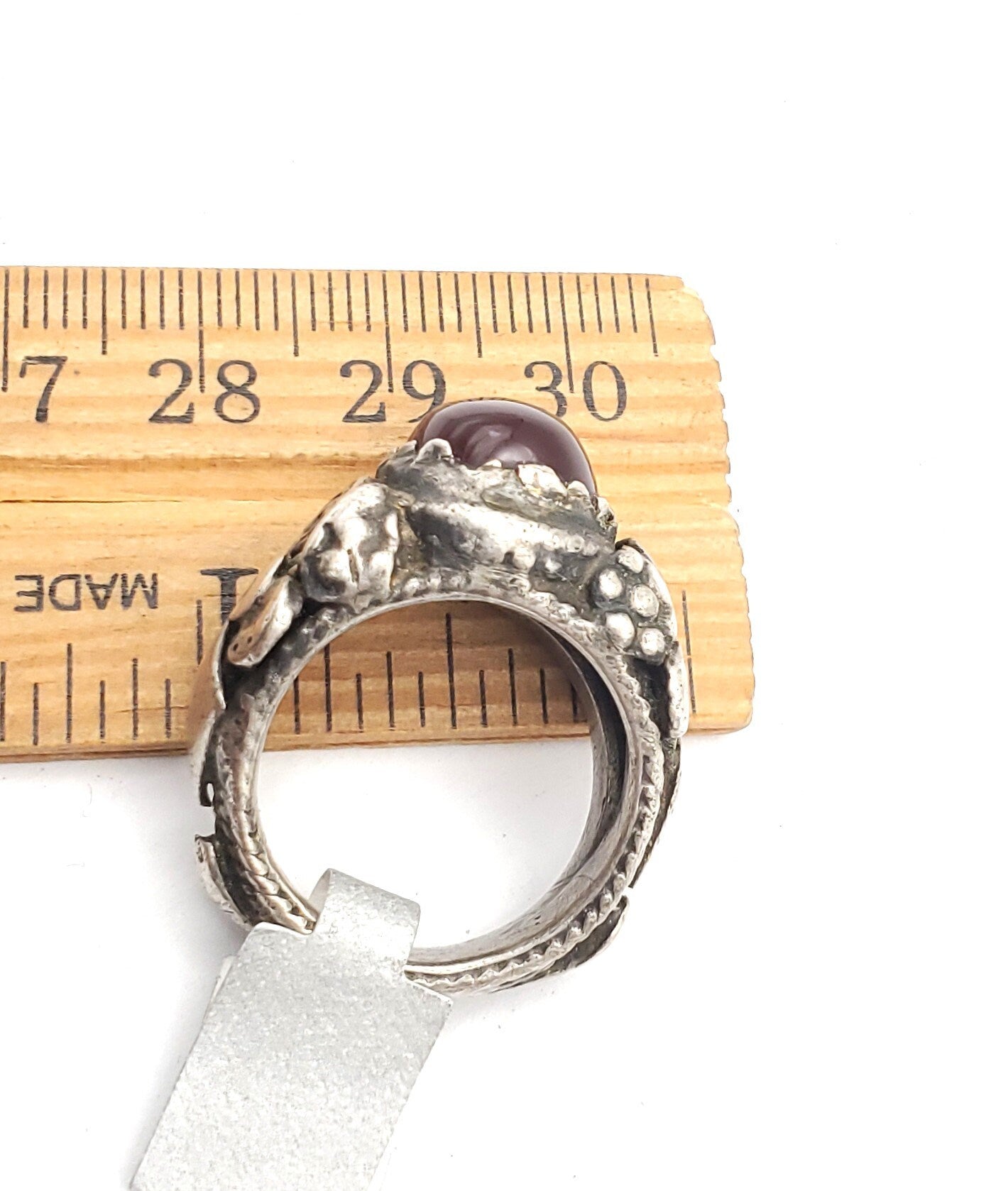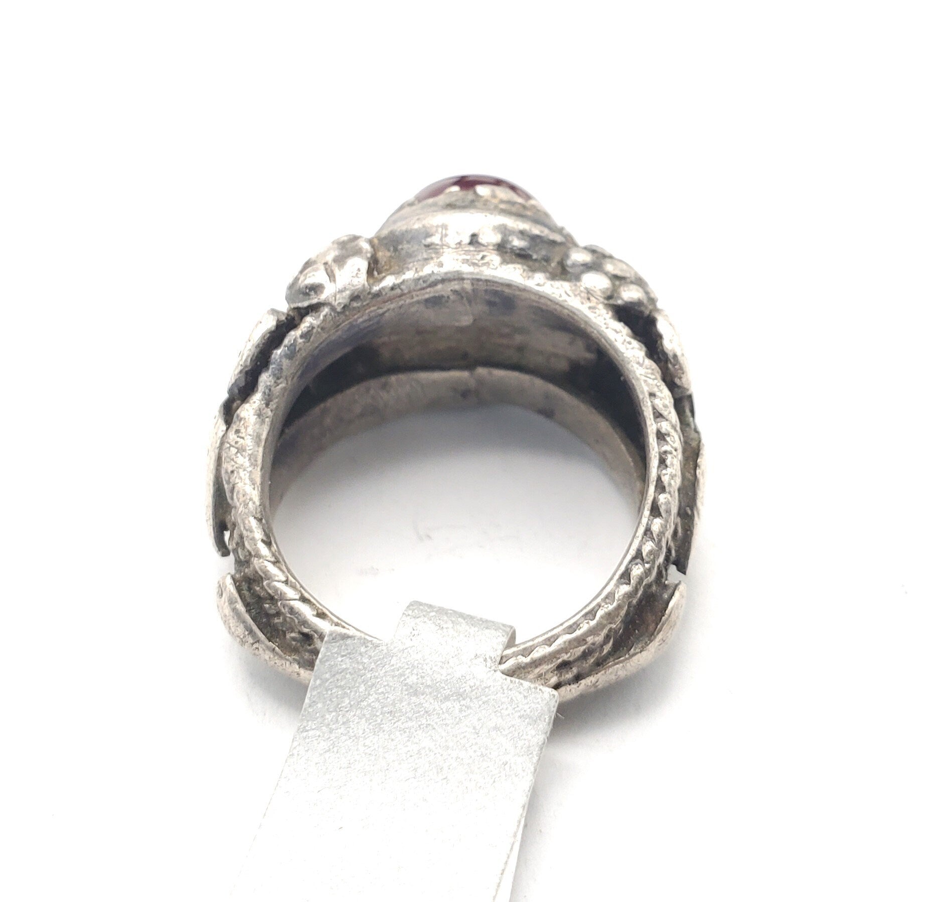 old Yemeni Silver Ancient Carnelian ring from Yemen from the 1930 century The decoration is made using vintage Silver Ancient Carnelian made using Yemeni technique Original Yemeni Jewish Ring from the early XX century, made by the best artisans in North Yemen. This ring shows the classic Bedihi granulation technique. The Bedihi´s were responsible for the best quality granulation work like this ring, Unique Yemeni Ring size 6.5 x 1'' Weight:18 gr.Good condition size (see pictures) Collectible It is not marked but acid tested positive for 925 Silver,