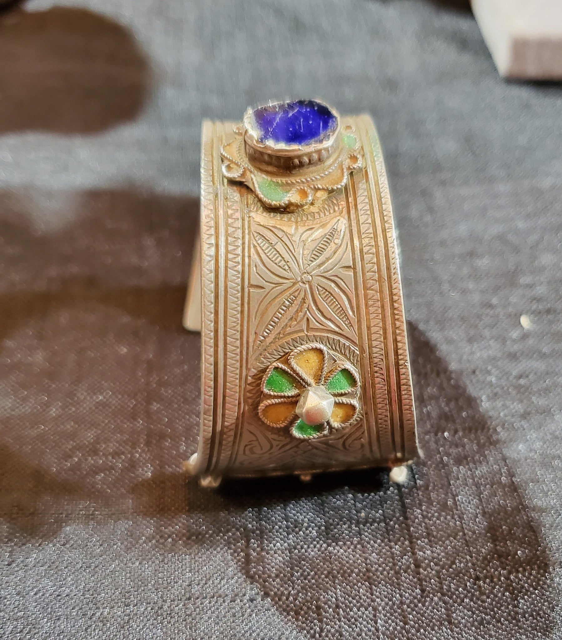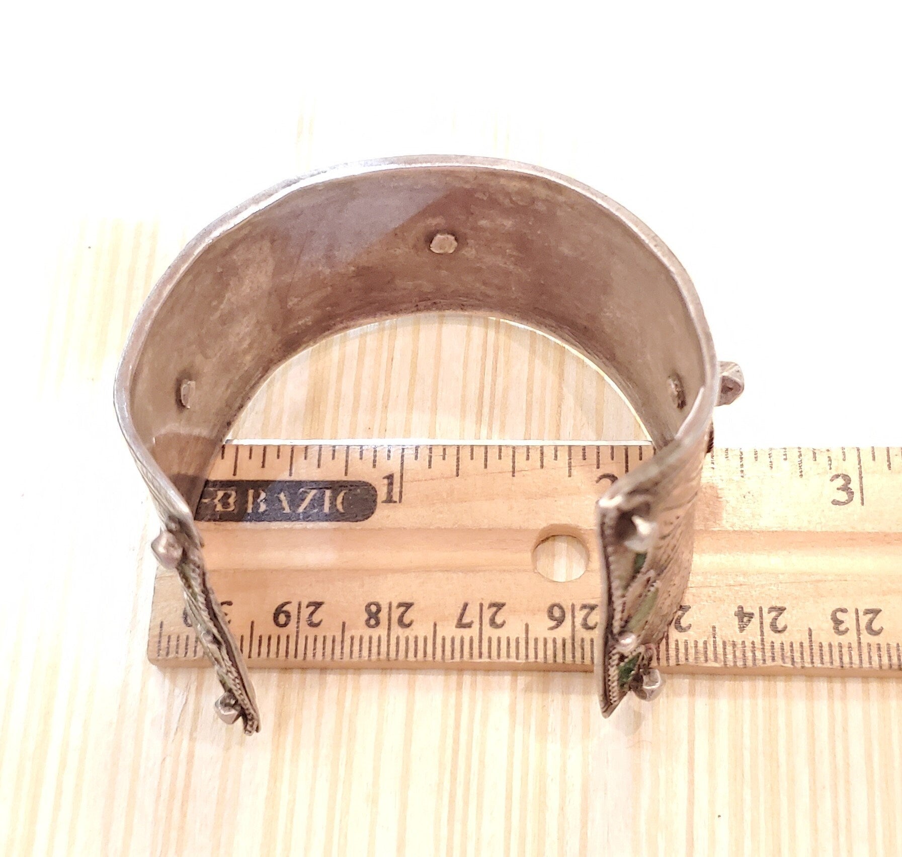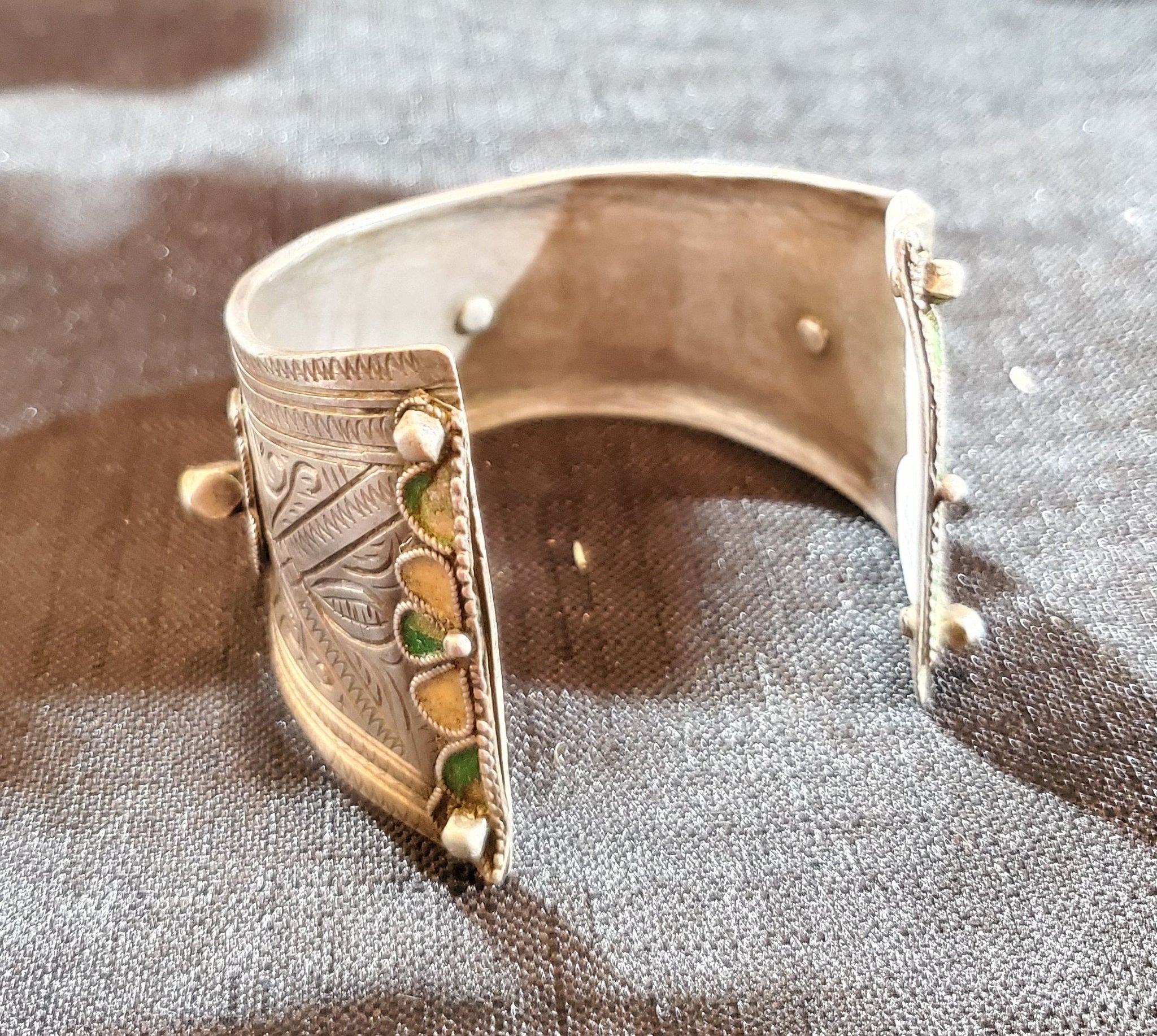 from Southern Morocco. measures just under 2".5 at the widest, flared section and its inner diameter is just abut 6" with a gap of 1''.5 wide 49.gr/ The bracelet features lovely niello and incised designs, a central red glass cabochon, two "spikes" and Enamel and at the bottom flared portion,enamel"feature detailed wire-work high grade alloy of silver with wonderful wear The Berbers are among the original peoples of North Africa. Their myths. Legends and history span 9,000 years, back to the Porto-Mediterraneans. They have achieved unity by keeping up their unique language and culture which are, like their land, both African and Mediterranean. other shop https://www.etsy.com/shop/Africanbazar2US?ref=seller-platform-mcnav.......africanbazaarus.com