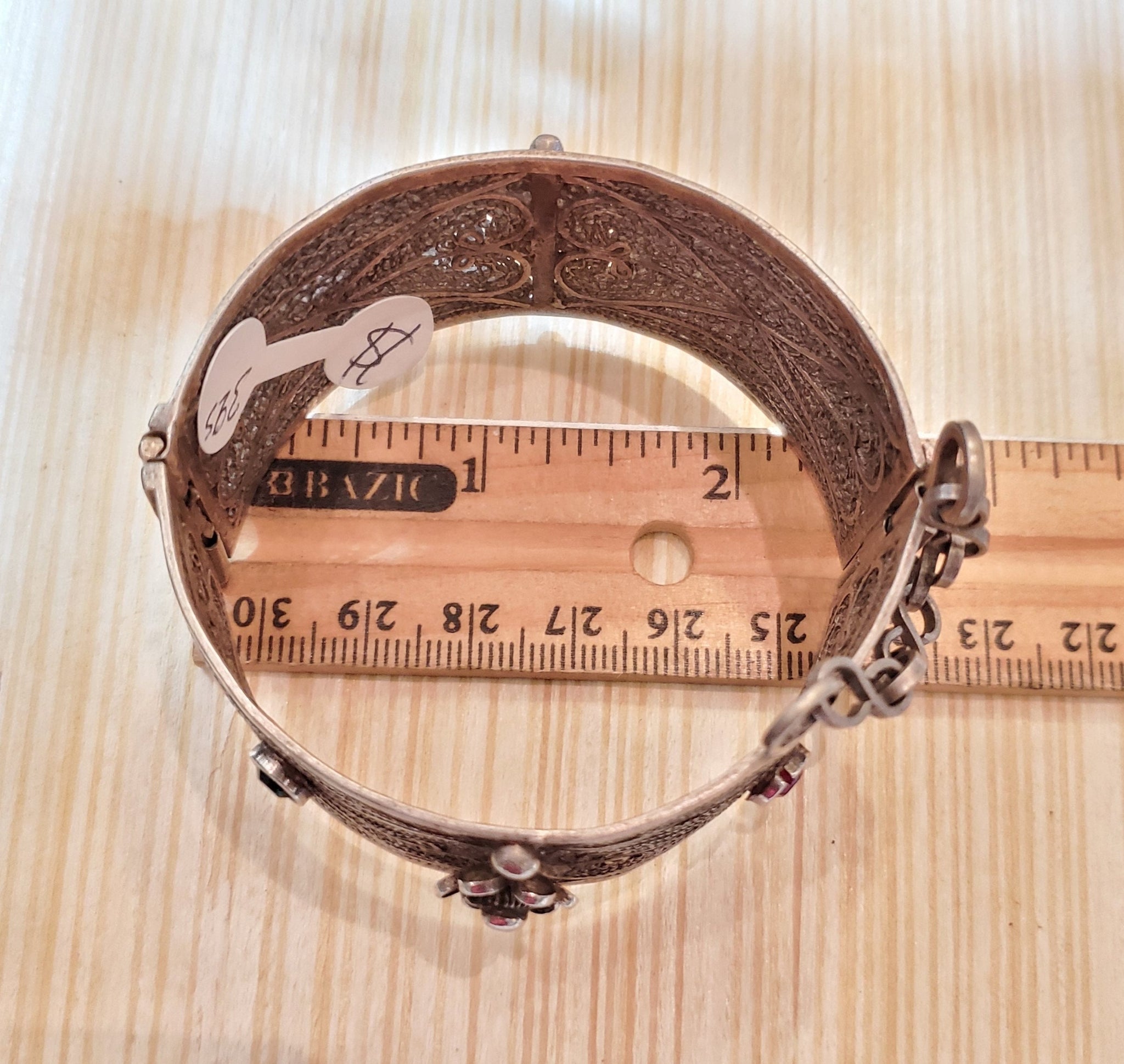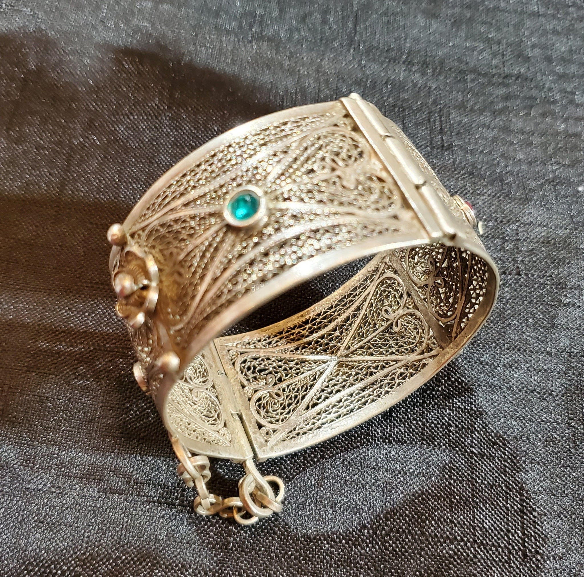 Antique Silver Moroccan Tiznit Berber filigree Bracelet from Morocco etched and decorated with silver It can be easily fastened This type of bracelets is widely worn in Tiznit, but also in Southern Morocco and Tuareg .it measures just under 1''.5 x 2''.5 wide (at the widest) and has an inner diameter of just over 7''x 2'' 36 gr The bracelet is in excellent condition feature detailed filigree-work high grade alloy of silver with wonderful wear The Berbers are among the original peoples of North Africa. Their myths. Legends and history span 9,000 years, back to the Porto-Mediterranean's . They have achieved unity by keeping up their unique language and culture which are, like their land, both African and Mediterranean. . . Thank you for visiting my shop All my jewelry has been collected over 18 years ago. I will be listing more pieces shortly as I am constantly always working on posting more. piece to add to the collection. I ship all over the world and price includes a tracking service........africanbazaarus.com