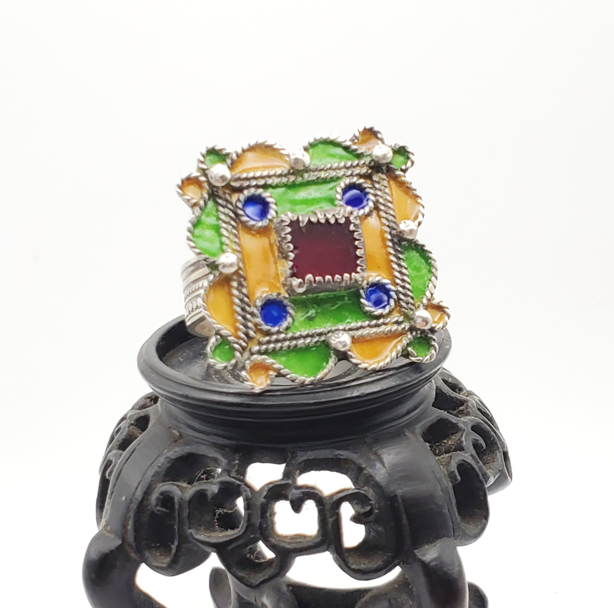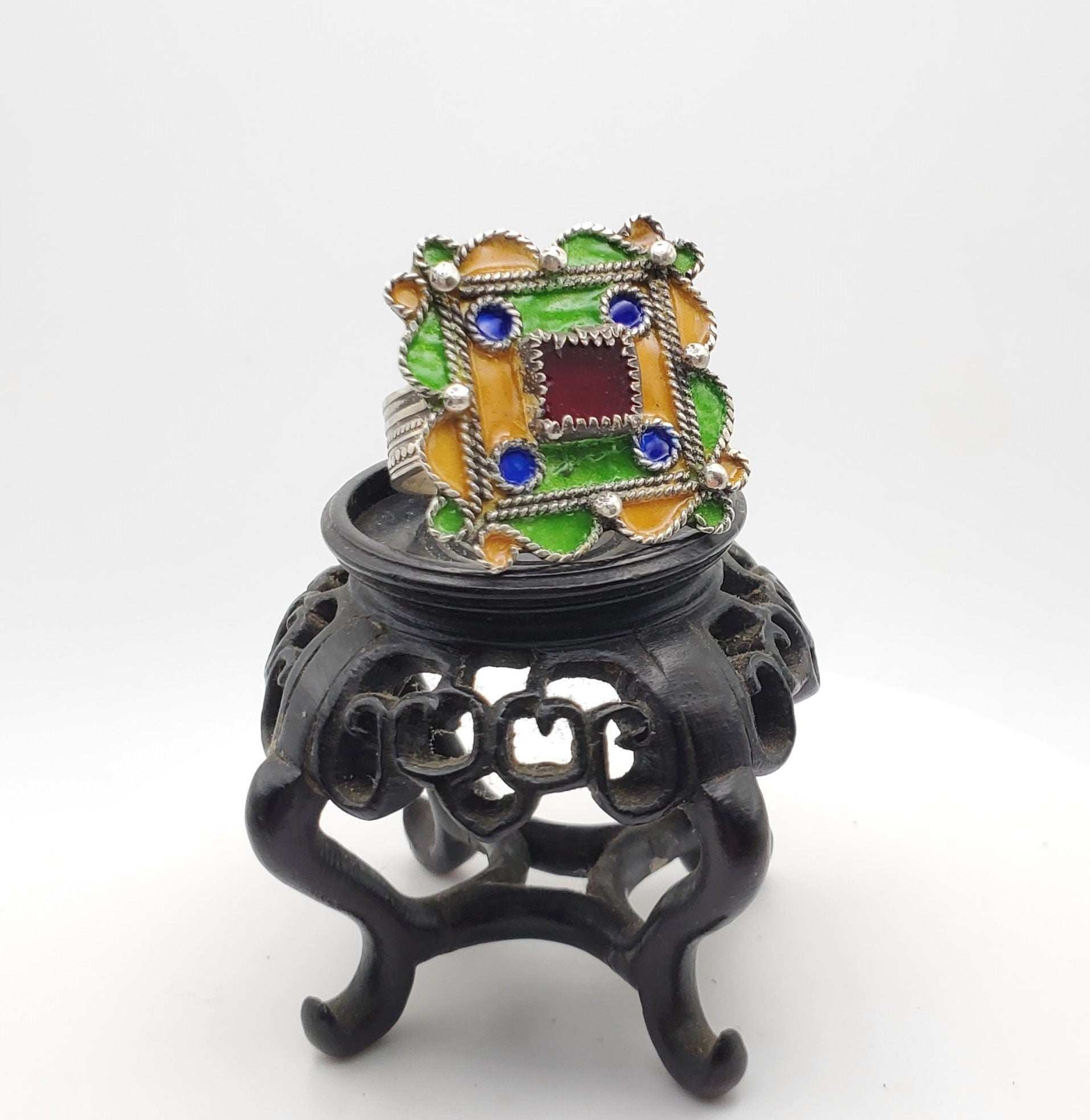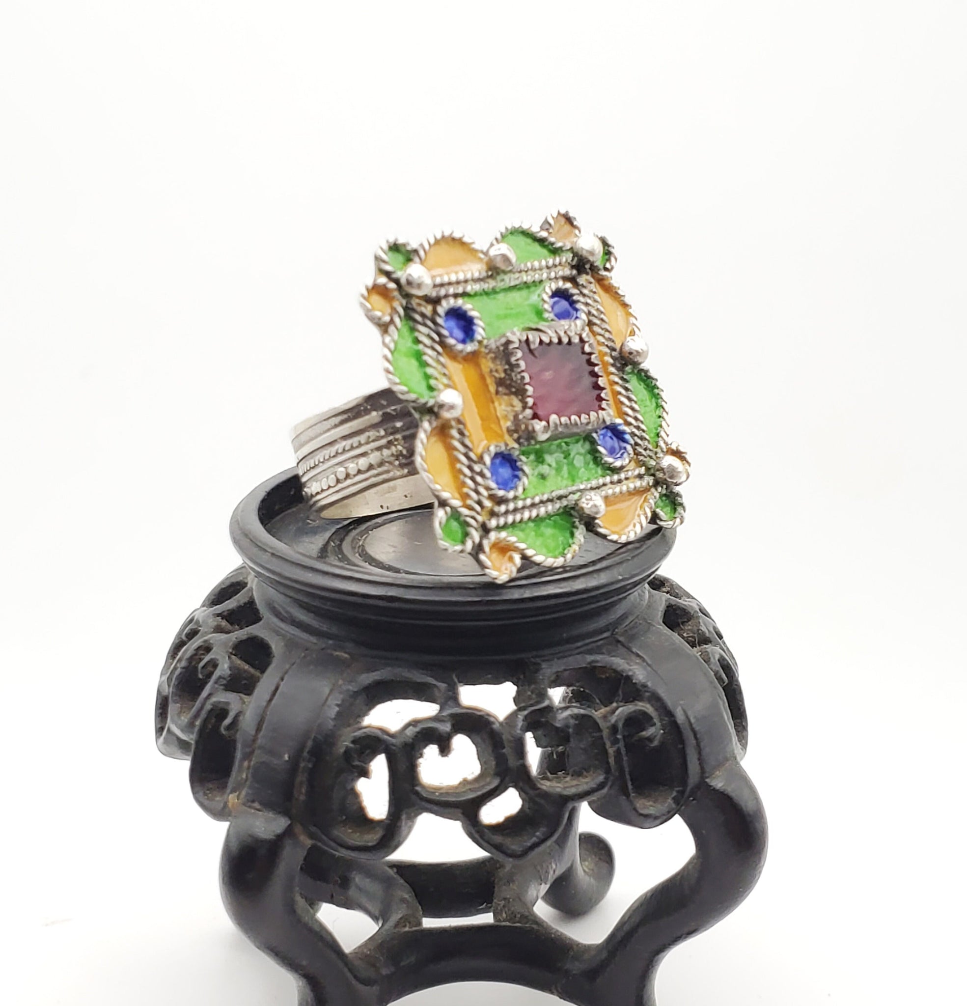 Moroccan Talismanic Berber Silver Enamel and glass cabochon Ring size