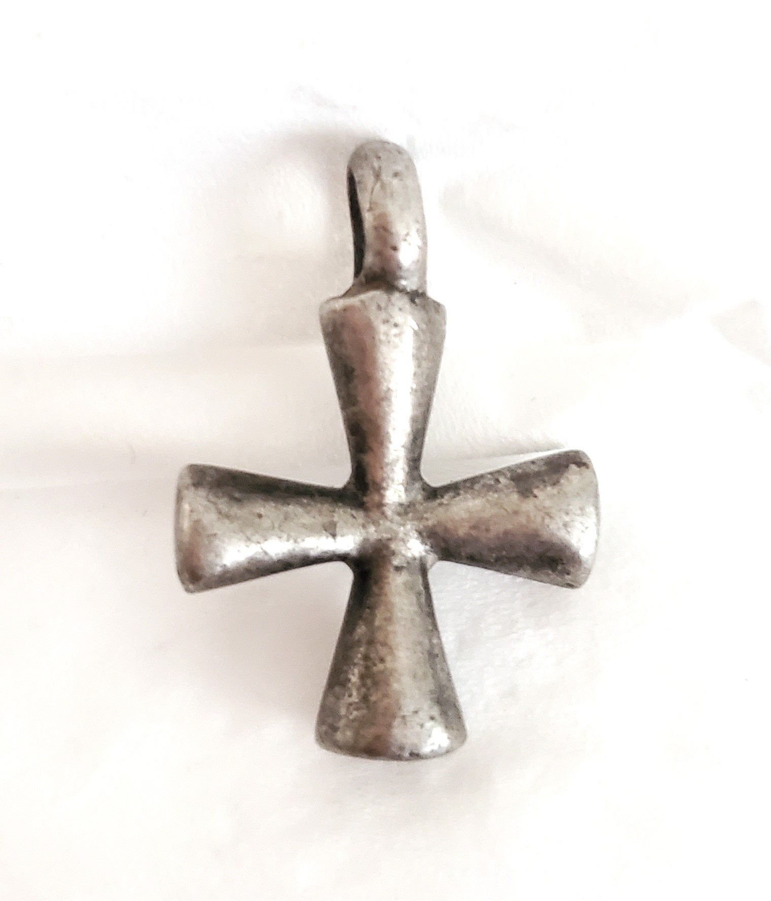 beautiful old handmade Ethiopian cross pendant made of silver . In Ethiopia particularly among Orthodox Church followers, to wear a cross implied to be protected by the lord himself as well as to show that they are a devoted Christian. Neck or pictorial crosses are tied round their owner's neck with a piece of blue thread or cord, which was sometimes given to the wearer at baptism. This particular cross pendant is old and has been used. Measures approximatelty 2" x 1''.5 long Age: over 100 great condition Collectible other shop .....africanbazaarus.com