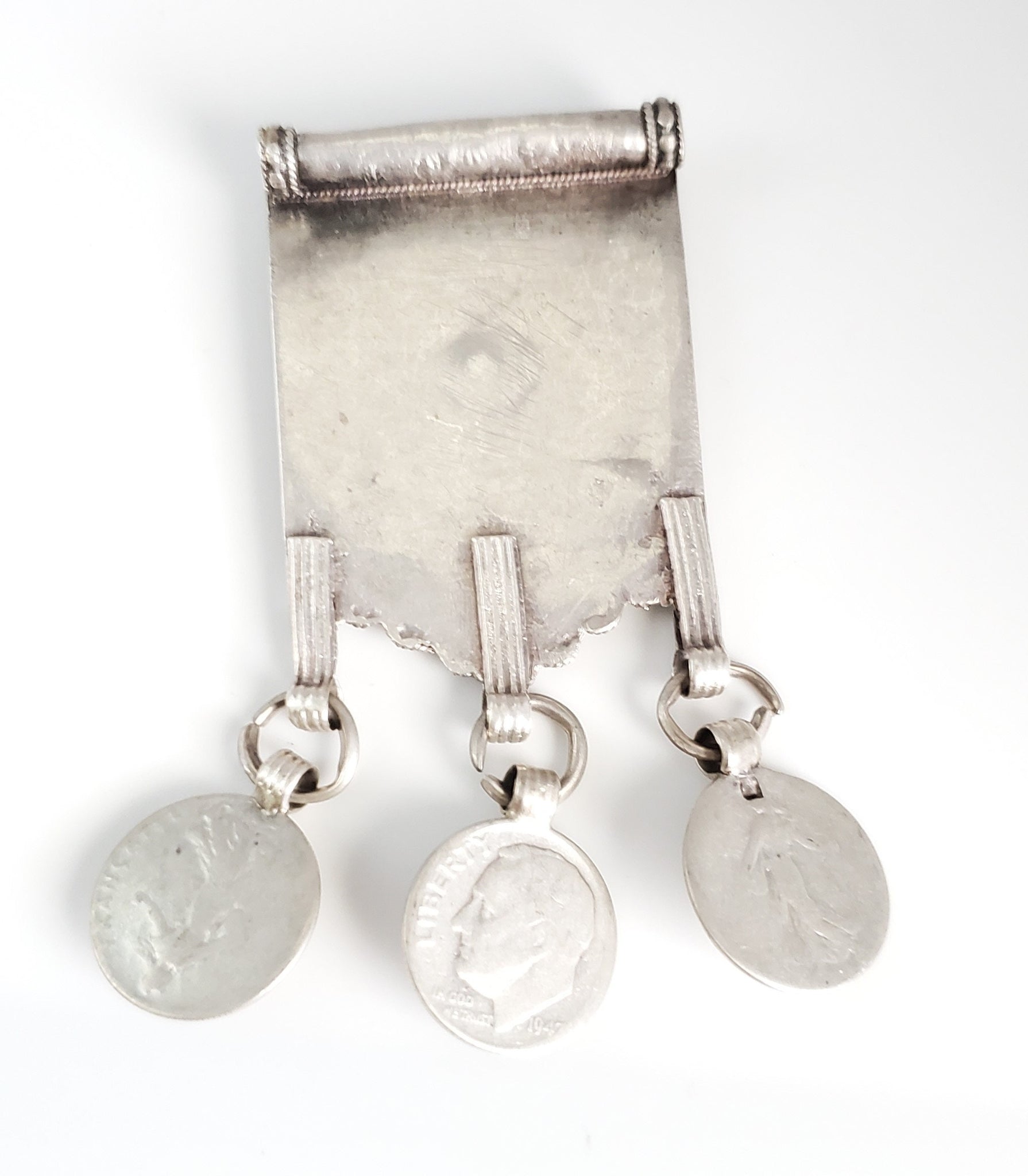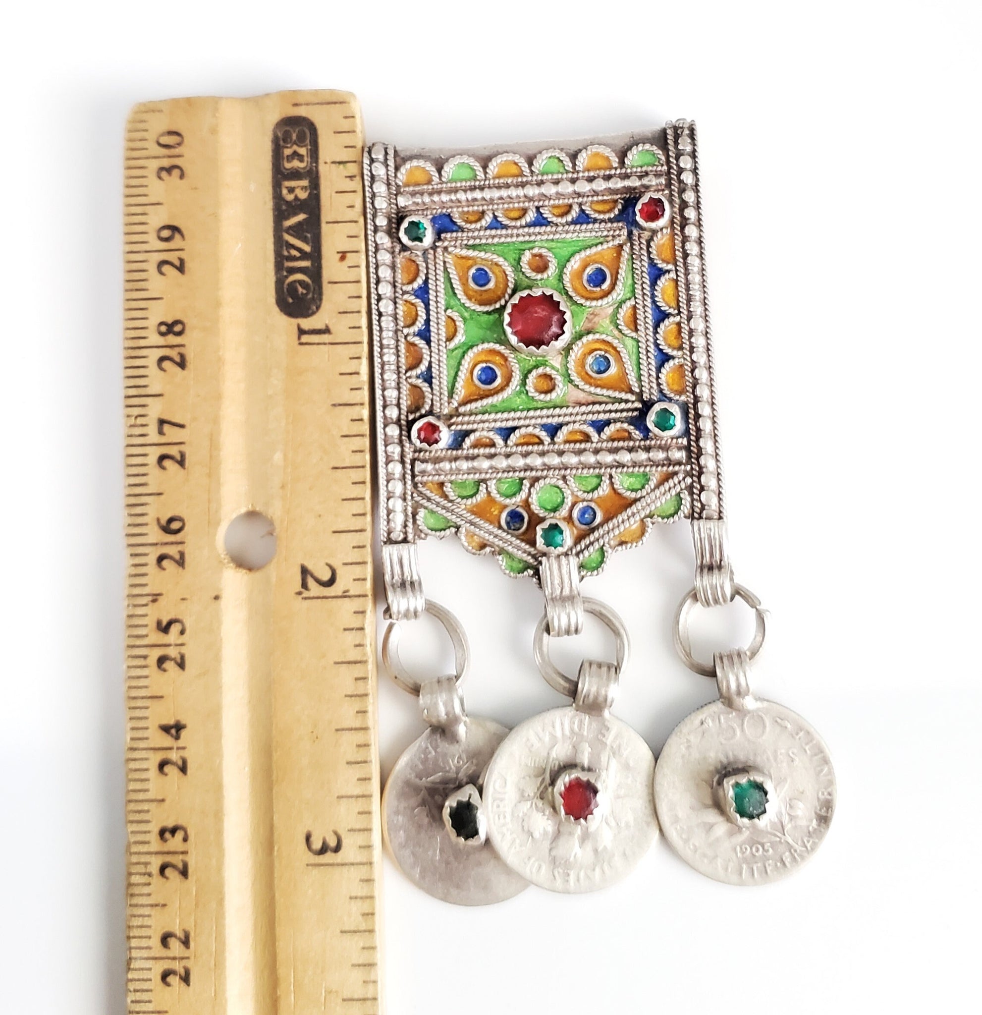 Old Berber Silver enamel HIRZ glass cabochon Amulet Pendant from Southern Morocco and coins pendant from TIZNIT south Morocco traditional Berber silver work, with nice quality enamel work THIS IS BEAUTIFUL!! ADD A CHAIN AND YOU WILL HAVE A BEAUTIFUL AND UNIQUE PIECE .. Pendant features detailed enamel wire-work (see the photos) It is in good condition.