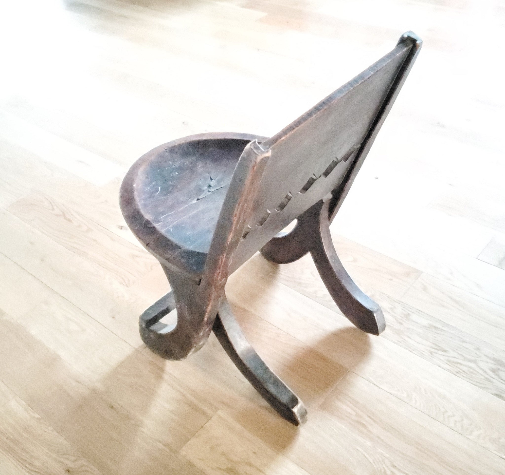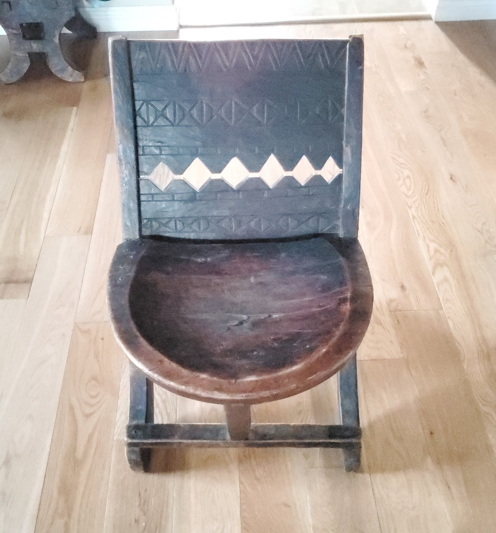 An early 20th century African elegant decorated chair from the Oromo people in the eastern part of Ethiopia. The Oromo chairs and seats are all identifiable by their distinctive style, quality patina lustrous, shimmering chocolate-like surface has a depth and glows with age and usea carved seat and a high back decoration.it was reserved for male leaders of the village. Ethiopia, circa 1900.is authentically aged and shows signs of usage