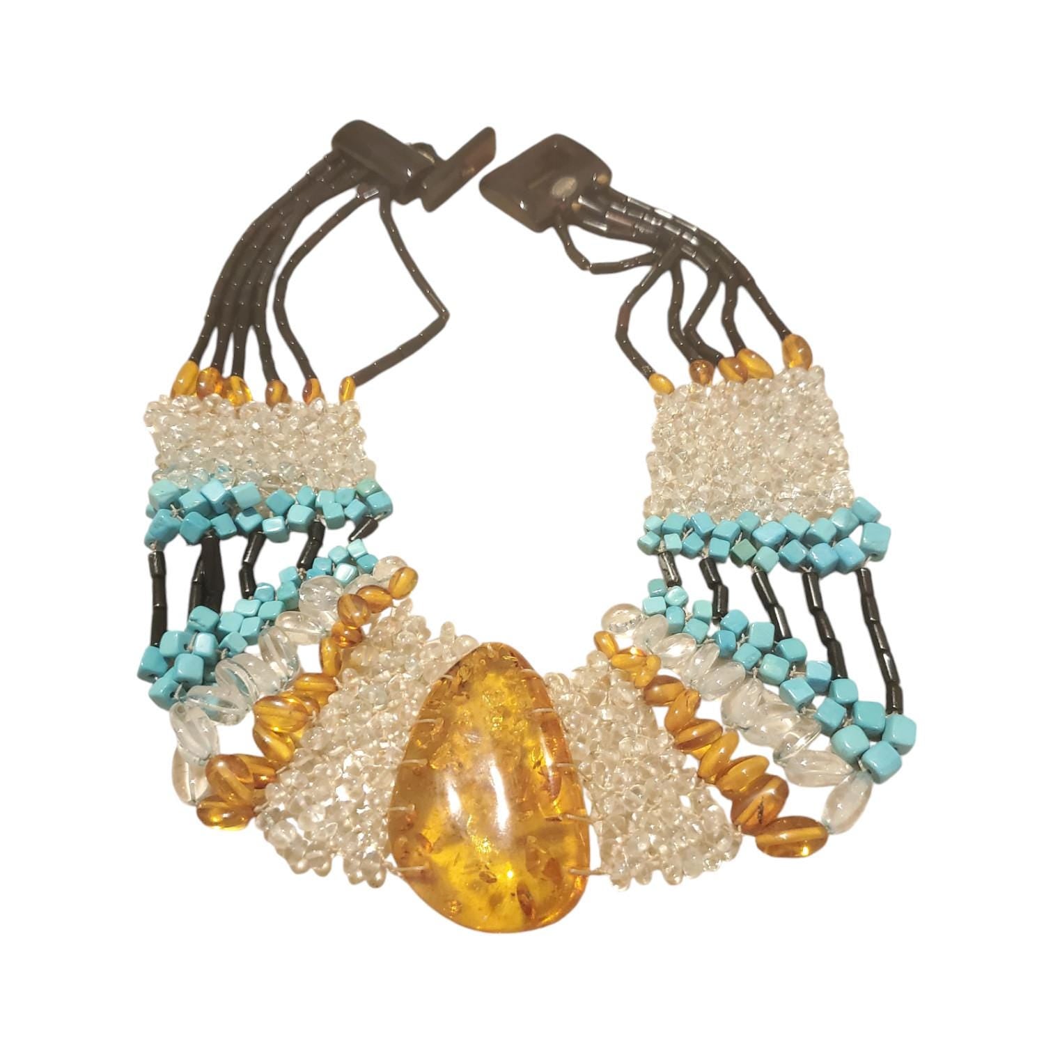 Vintage Baltic. Amber and blue turquoise gemstones necklace. LARGE Genuine Baltic amber stone, amber. Untreated transparent amber stone.,. Very beautiful shape, smooth texture, warm to touch. Absorb negative energy, Soothing energy, Calm nervous These classical Amber clips also reflect light beautifully. Very rich and attractive. Highest quality, lovely Necklace Got it for myself 25 years ago when I was in Italy from a very good friend of mine. that buys gemstones makes them into beautiful necklaces Very upscale good quality necklaces I enjoyed it but it does not fit me anymore. It will make a great present for loved one or for yourself. It has good energy.
